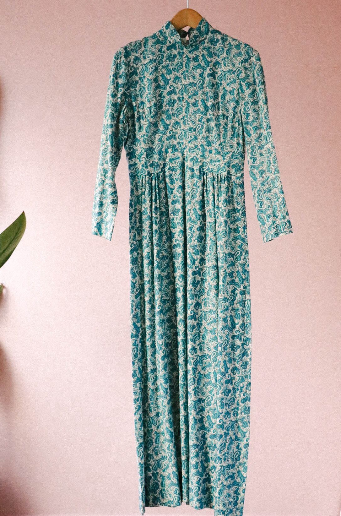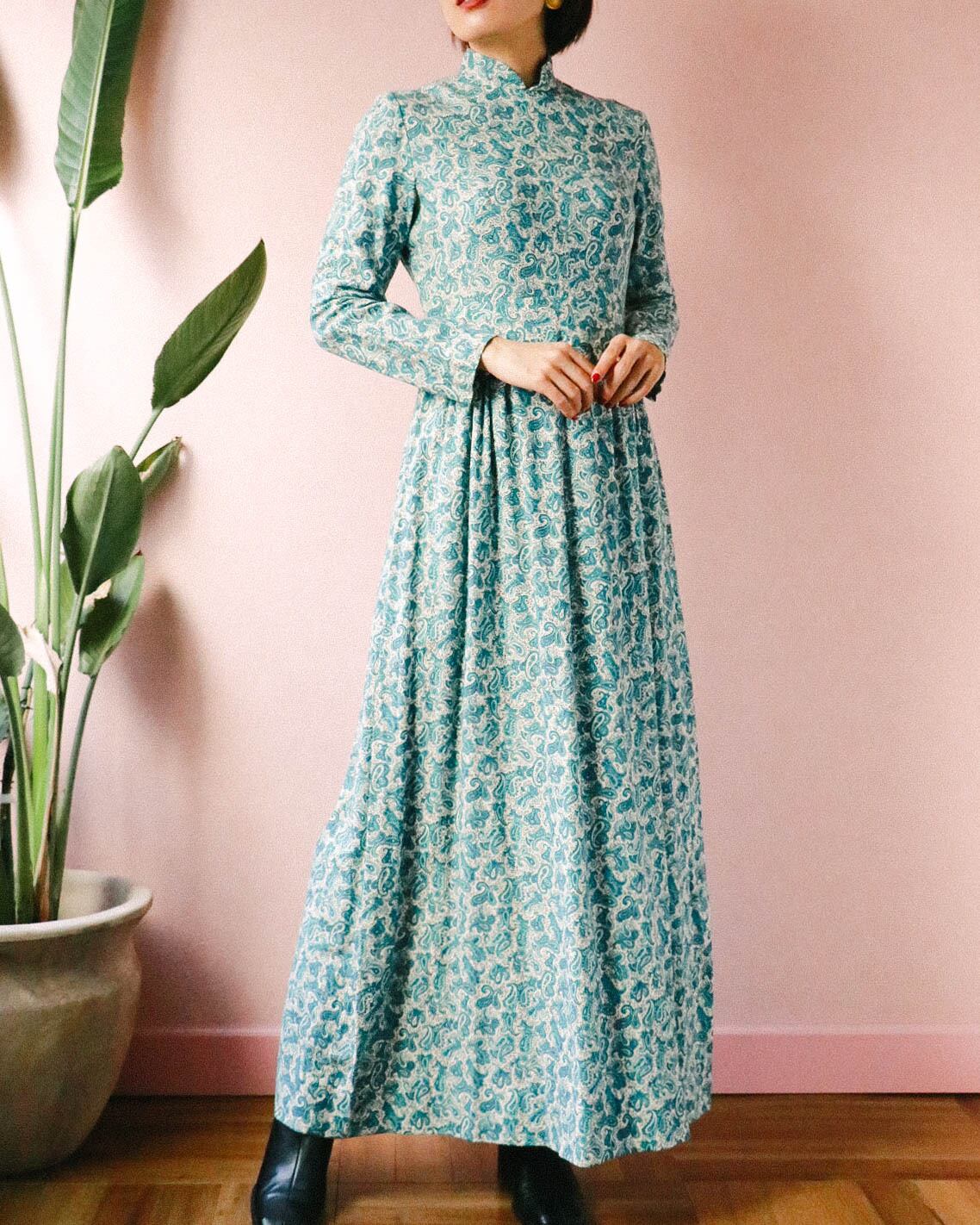 西洋らしいきれいな水色のペイズリー柄とアオザイのような雰囲気を併せ持つなんともいえない美しいロングドレス。スタンドカラーにもどこかオリエンタルさを感じます。