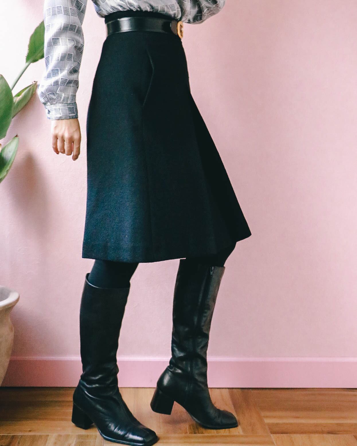写真のようにブラウスやブーツと合わせて、知性溢れる着こなしを楽しみたい一着です。