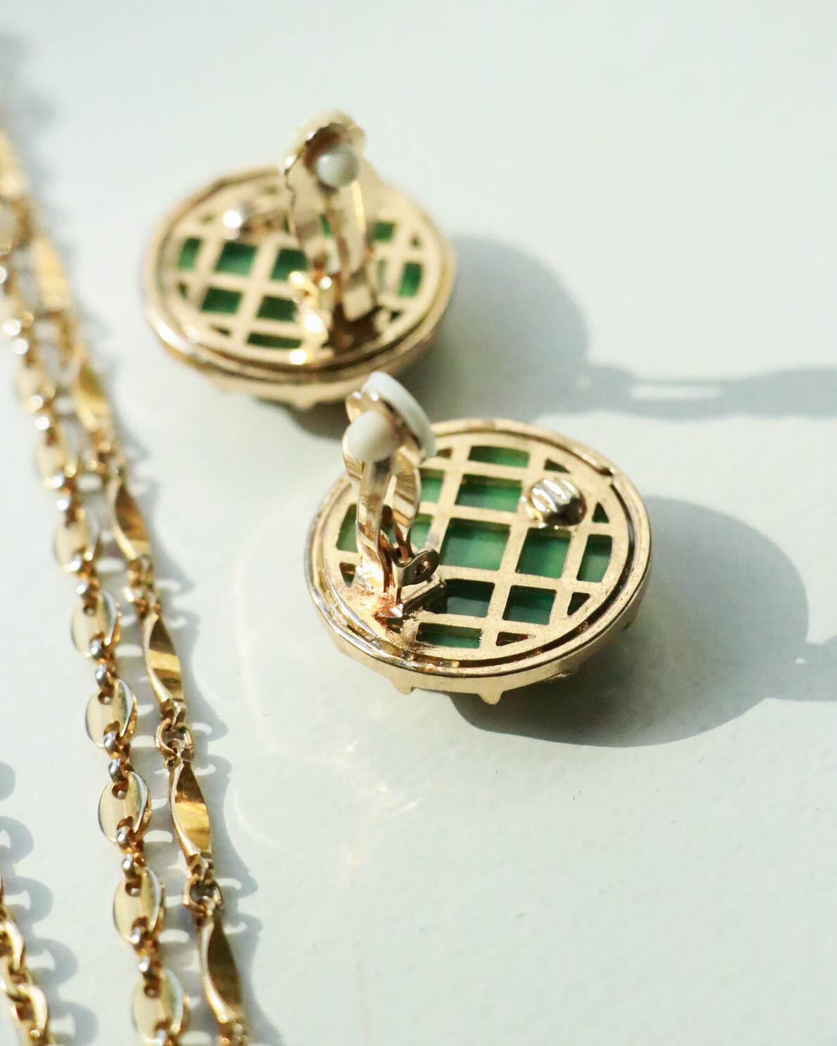 顔周りをパッと華やかにしてくれるグリーン×ゴールドのコンビが美しいヴィンテージイヤリング。