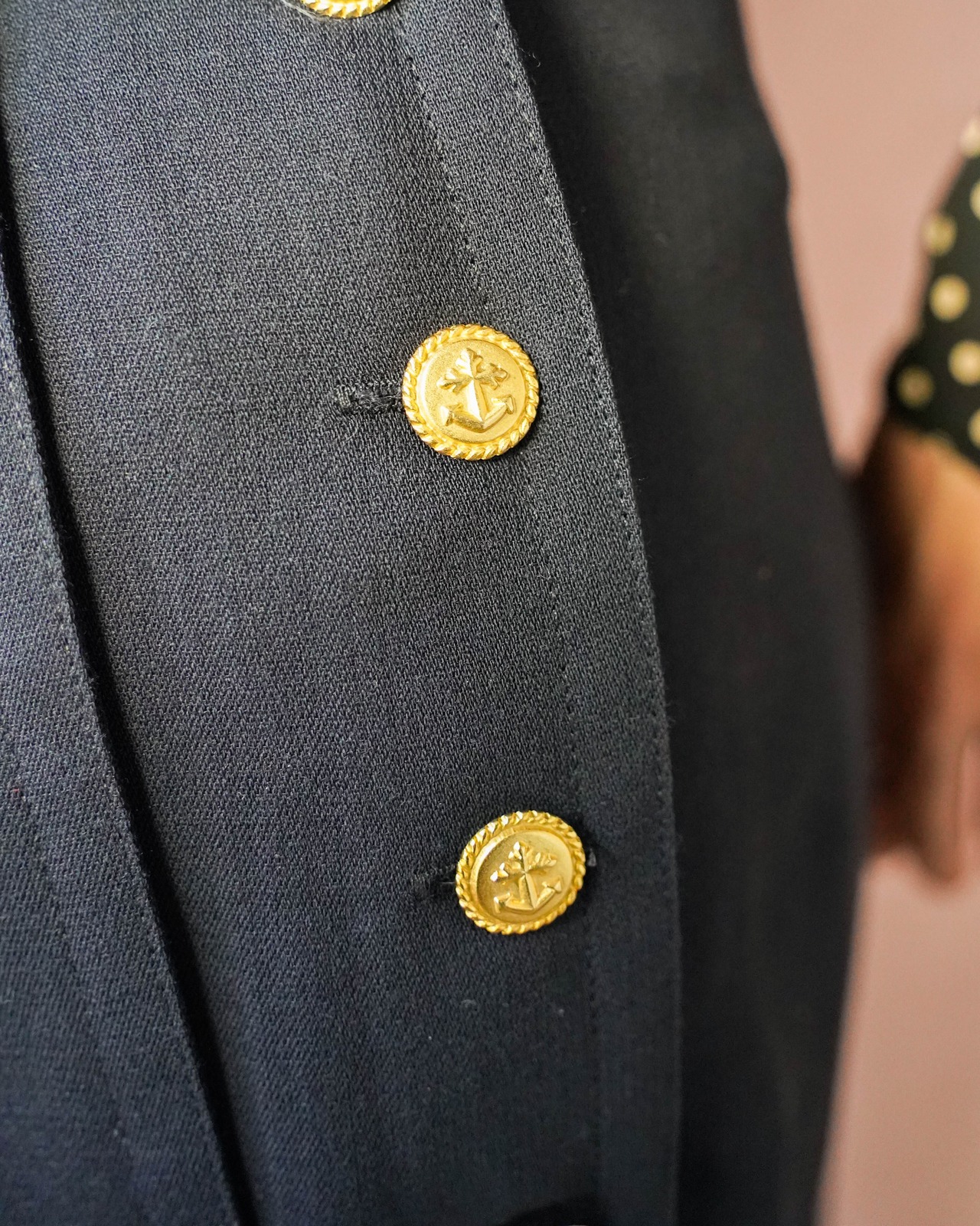 マリン調に仕上げられたデザイン、サイドのマットゴールドボタンは錨モチーフ。