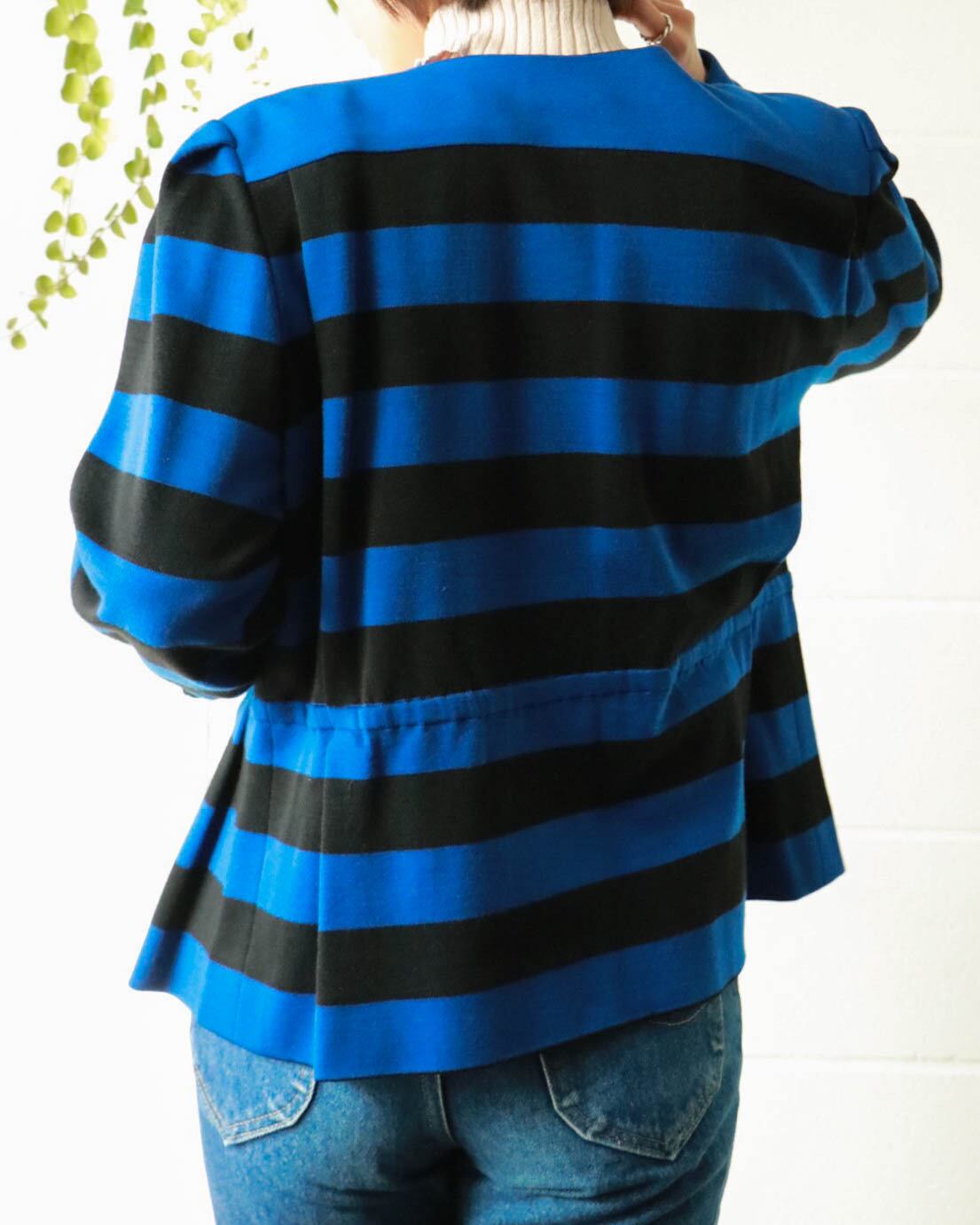 鮮やかな青と金ボタンのコントラストが目をひく、これから春先にむけて使えるジャージー素材のジャケットが入荷。