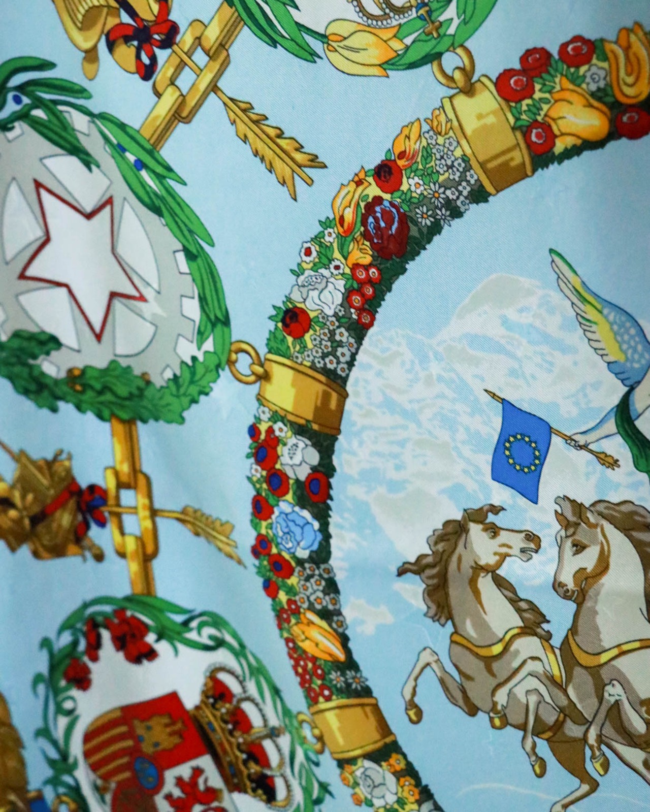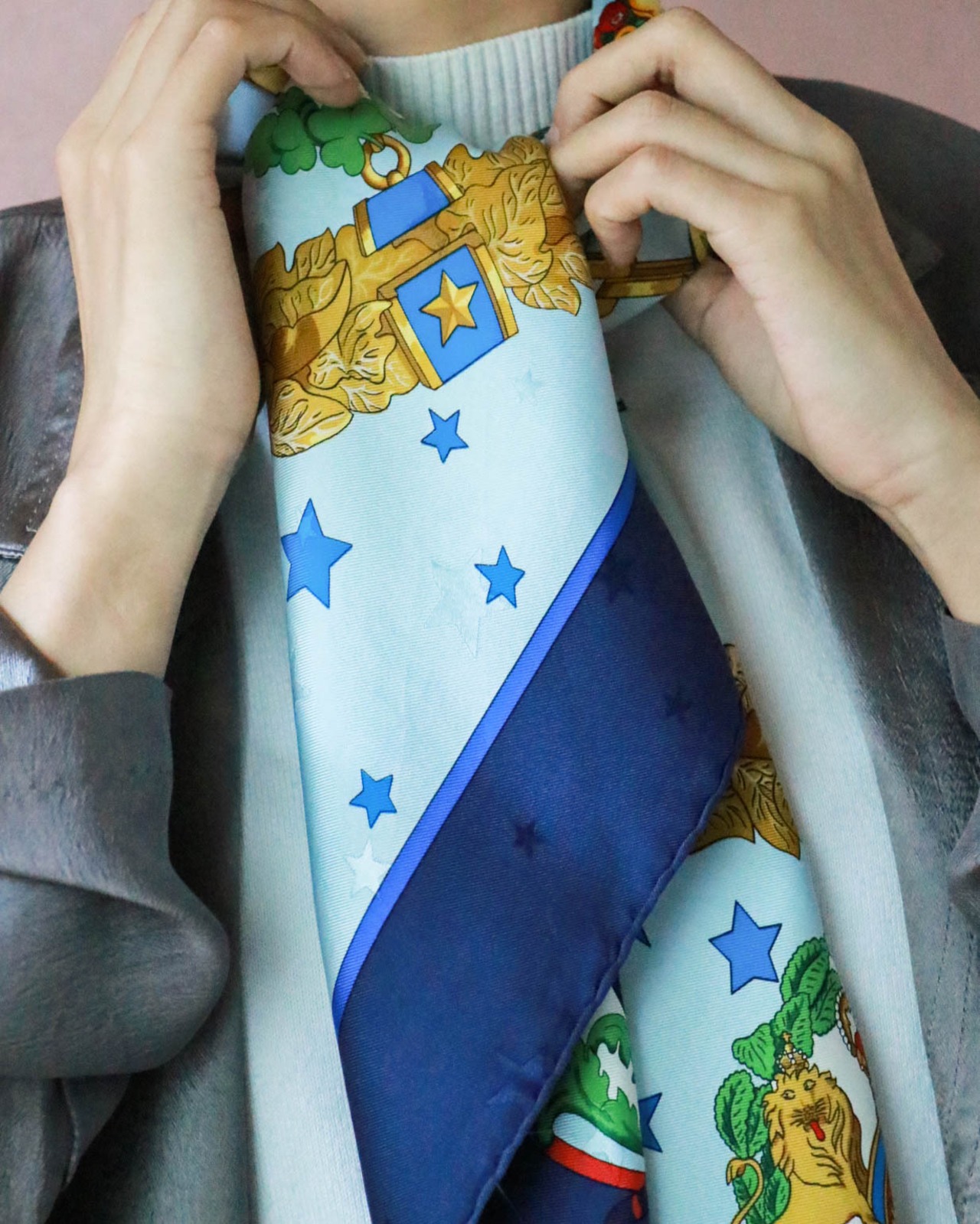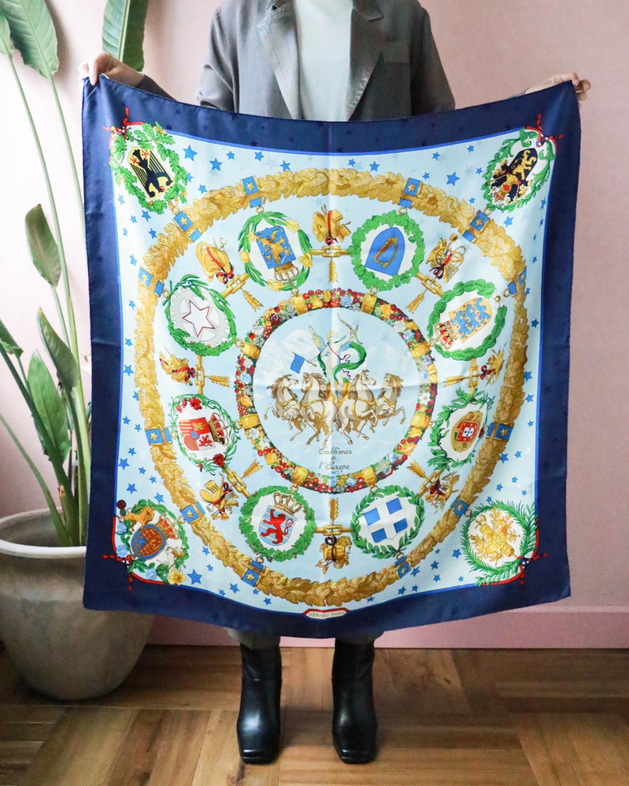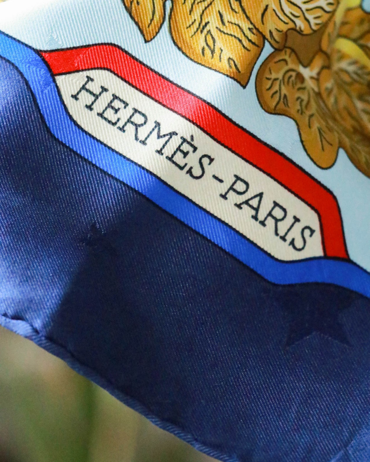 エルメス王道のクラシカルなデザインと濃紺カラーでパイピングされたカレ。