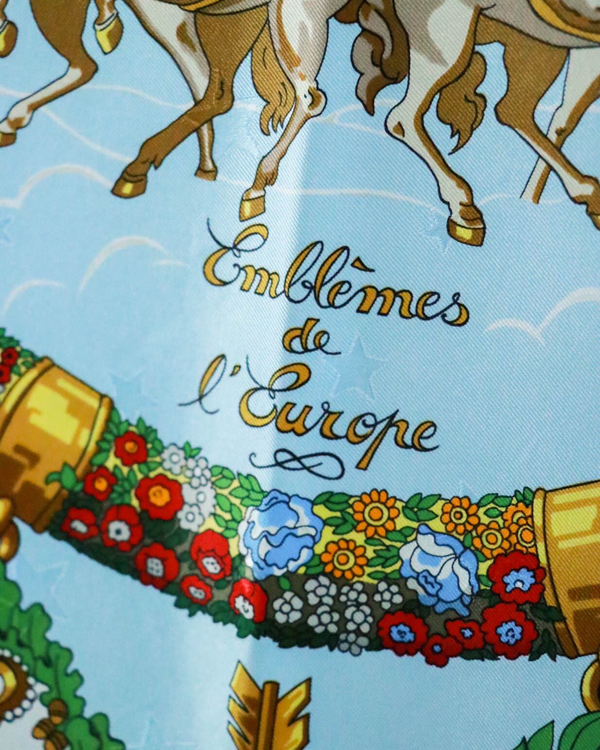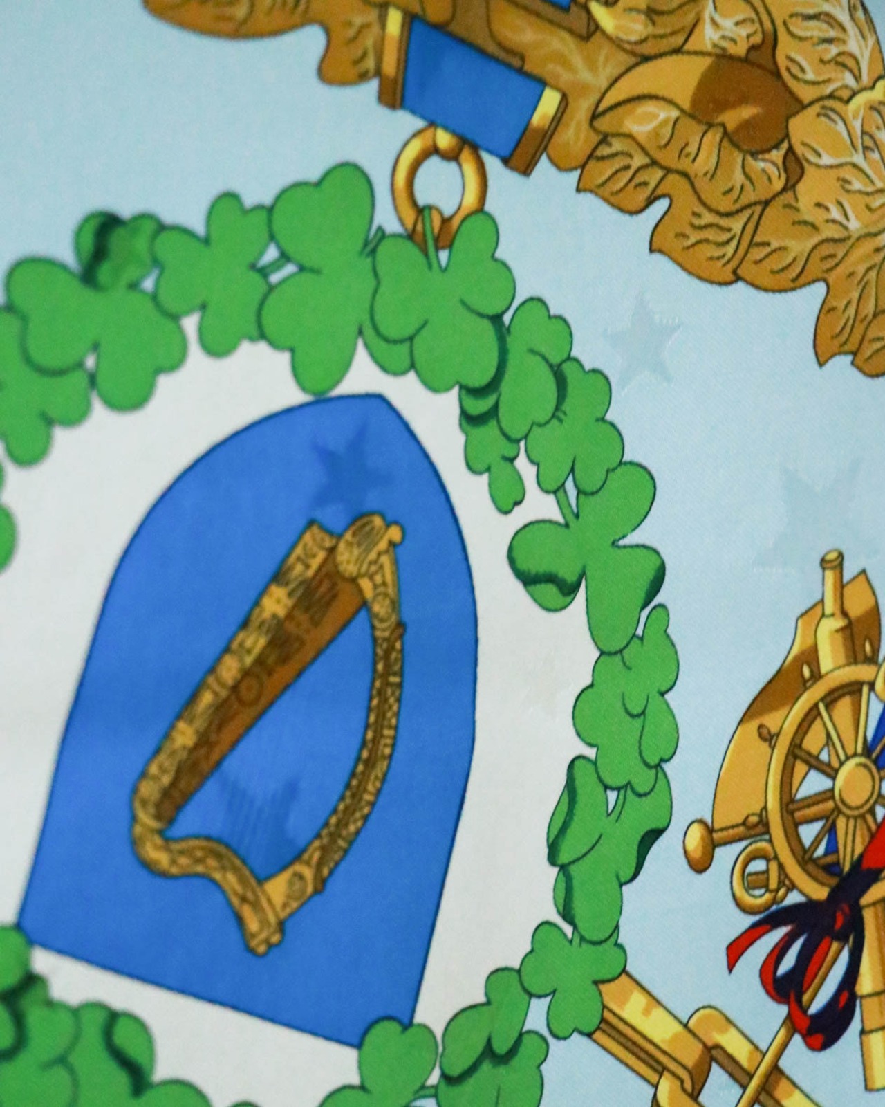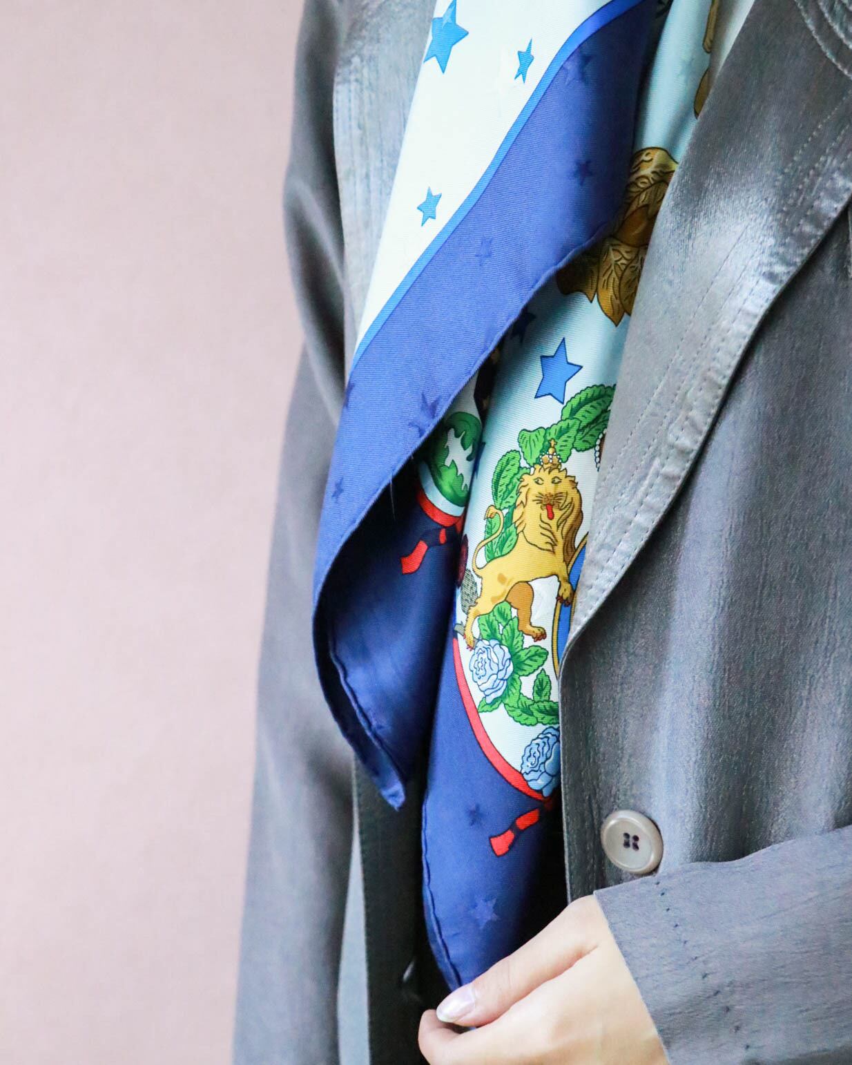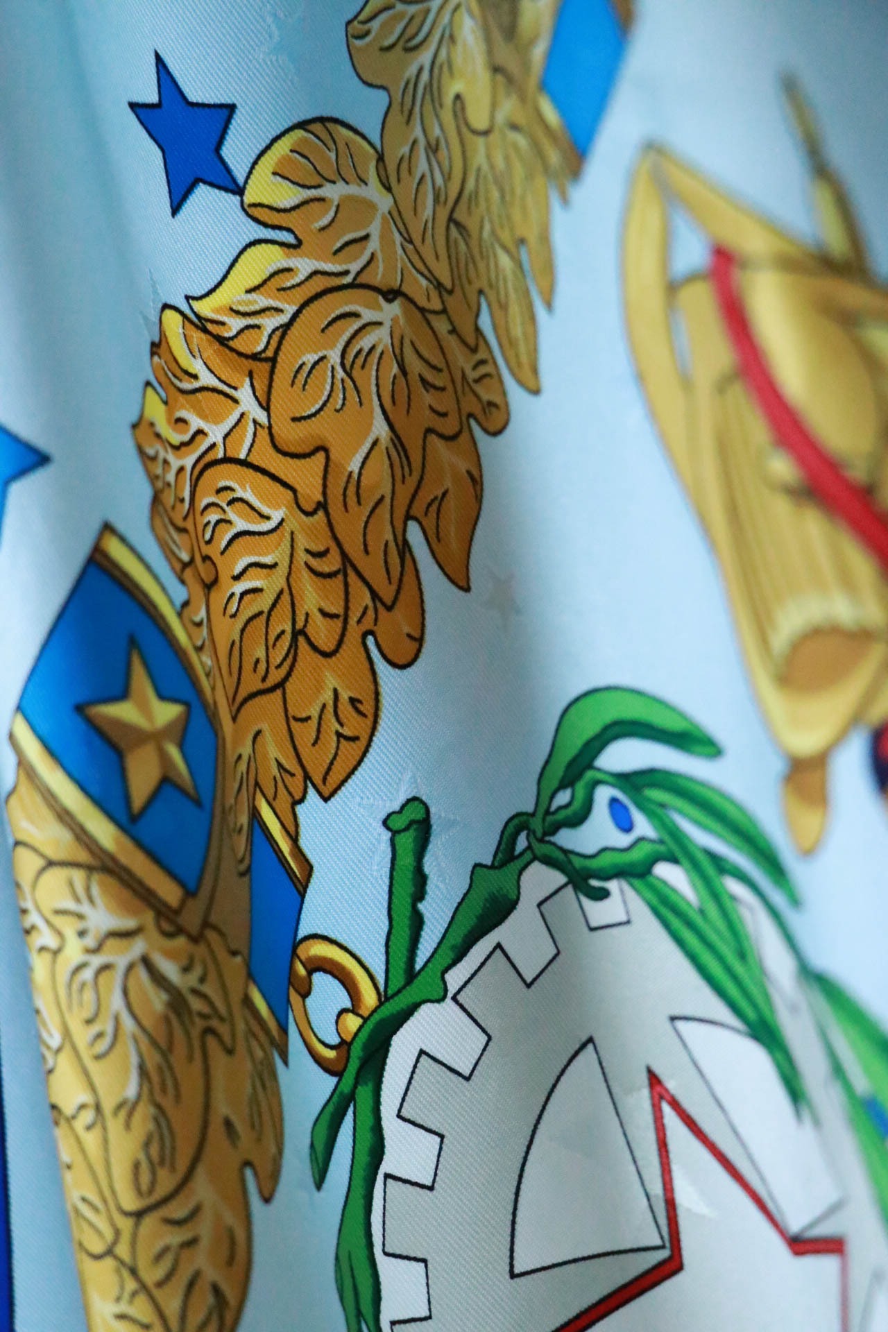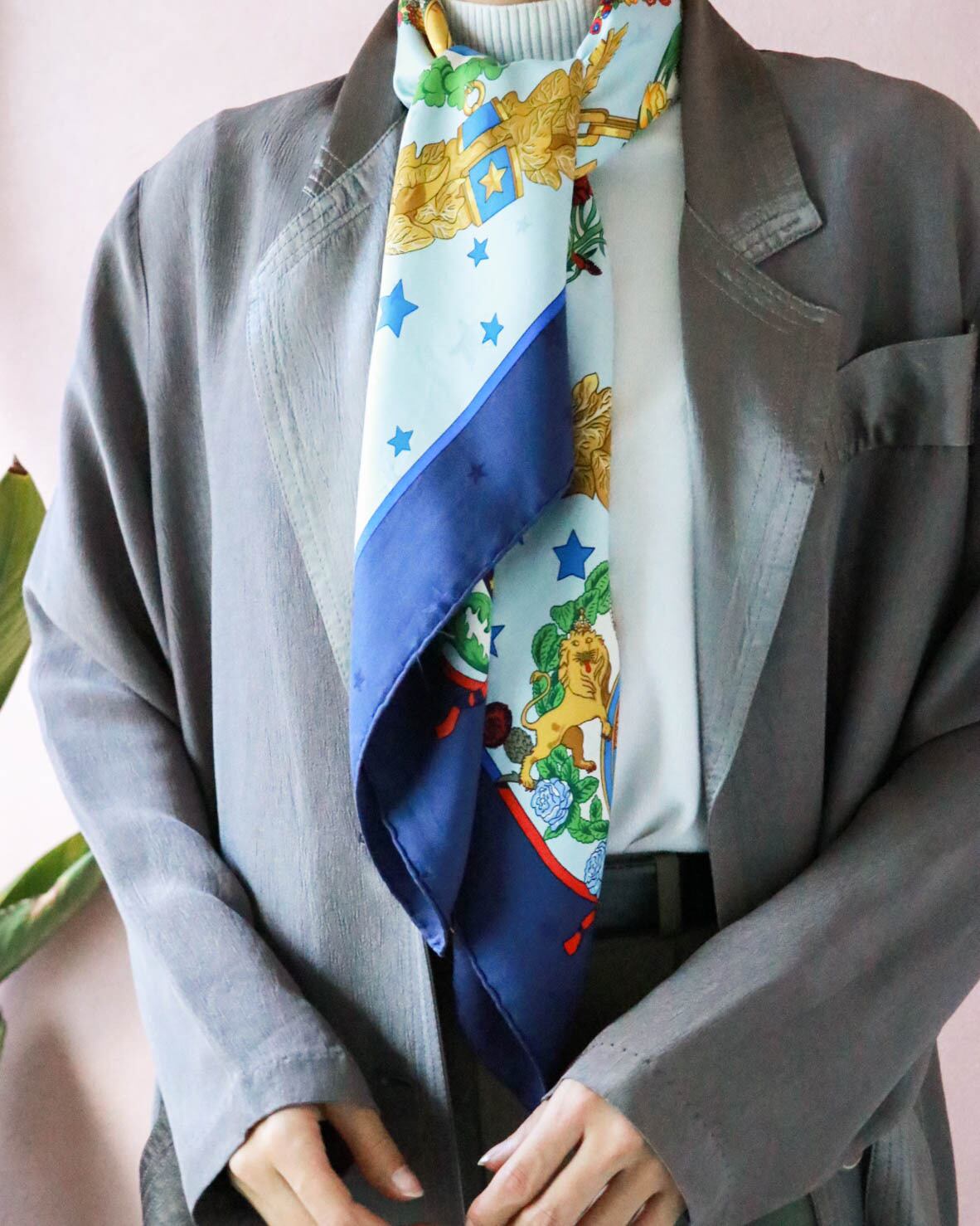 エルメス王道のクラシカルなデザインと濃紺カラーでパイピングされたカレ。