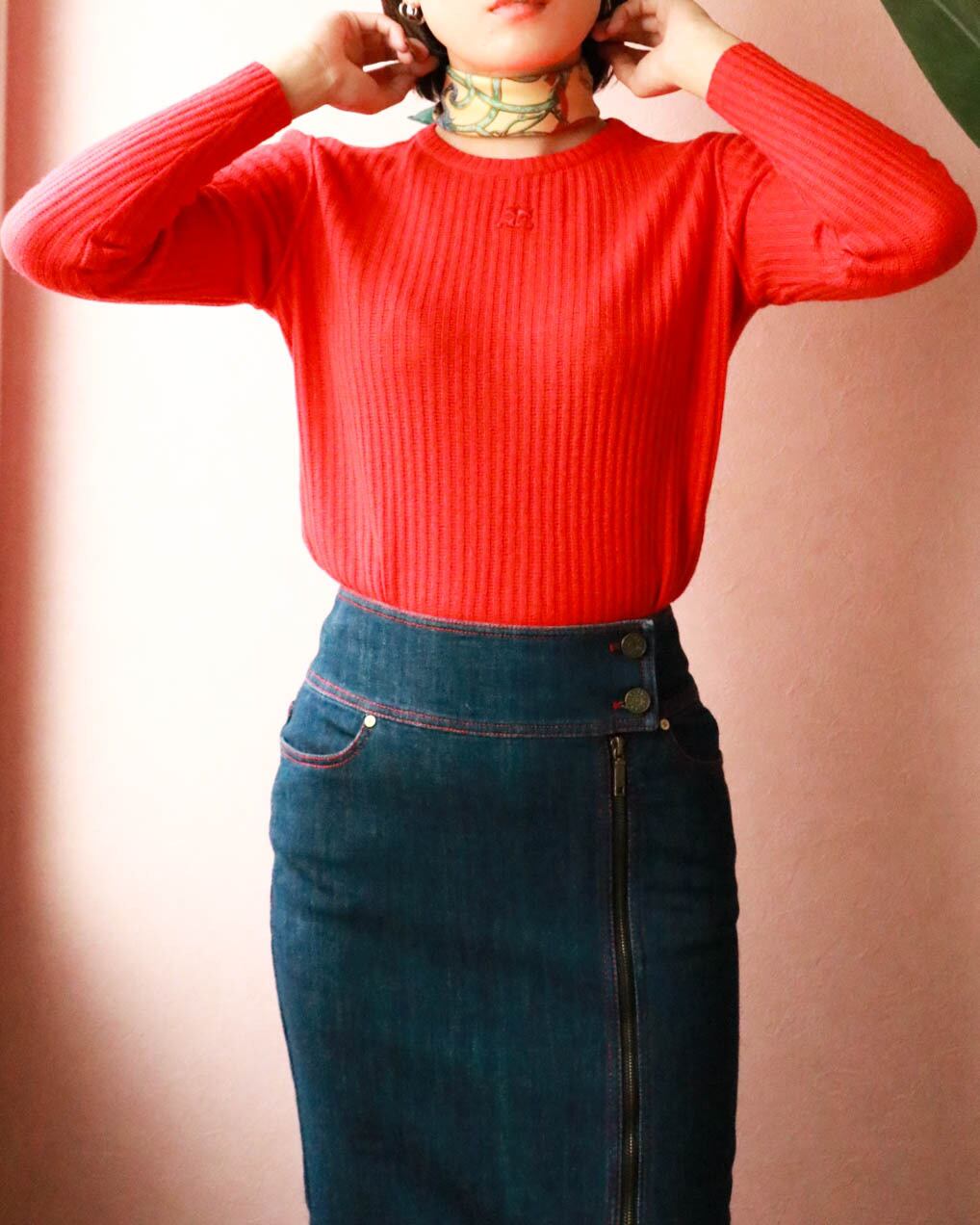 気分を上げてくれるブライトオレンジカラーが目を惹くニットはクレージュのもの。