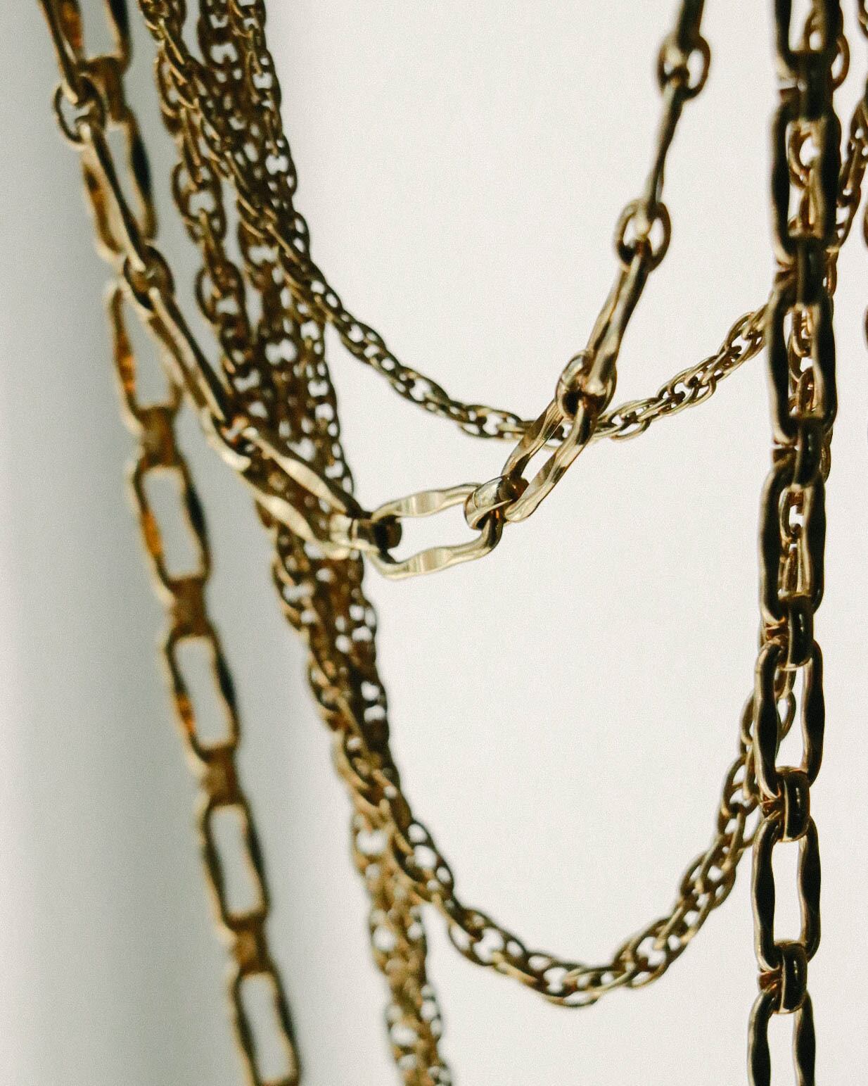 重厚感のあるゴールドチェーンは強く見えがちですが、様々なタイプのチェーンをミックスしいて不規則なリズムがいい。普段のコーディネートに是非プラスして。