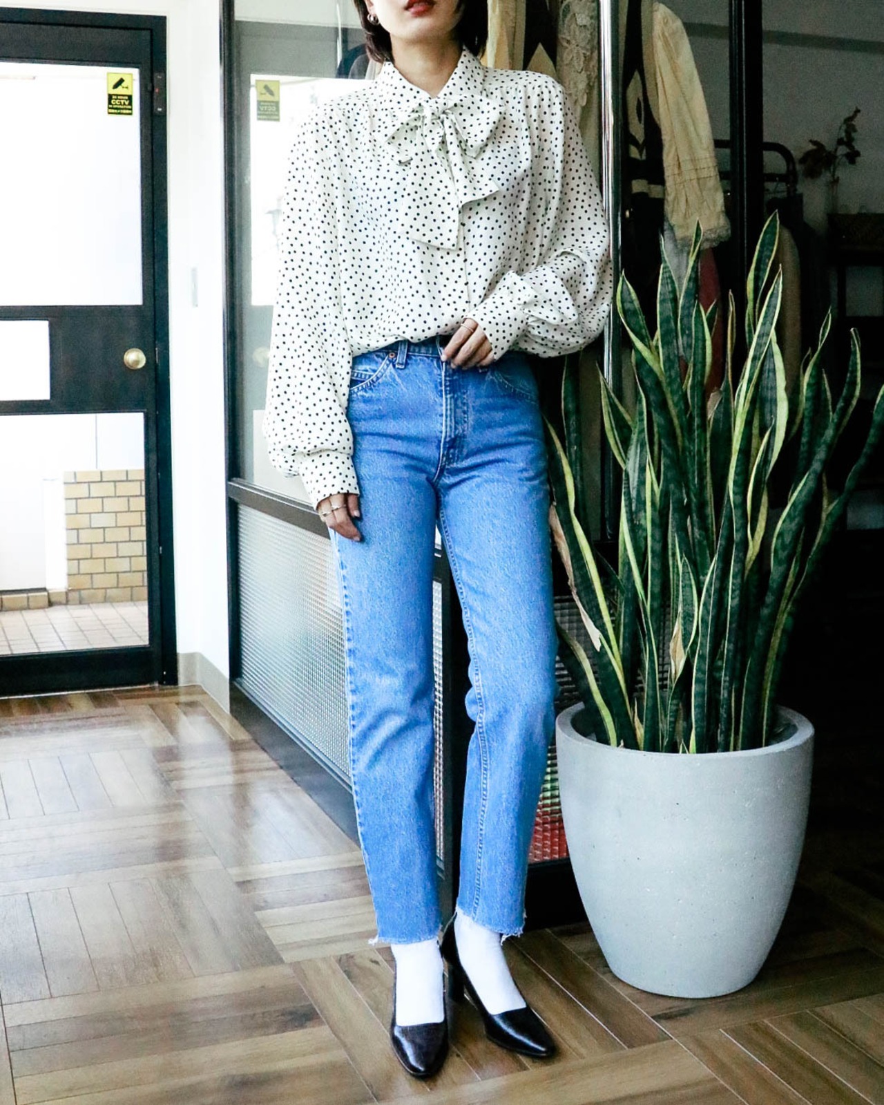 写真のように、ジャケットやデニムと合わせて、フレンチルックに仕上げるのが今の気分です。