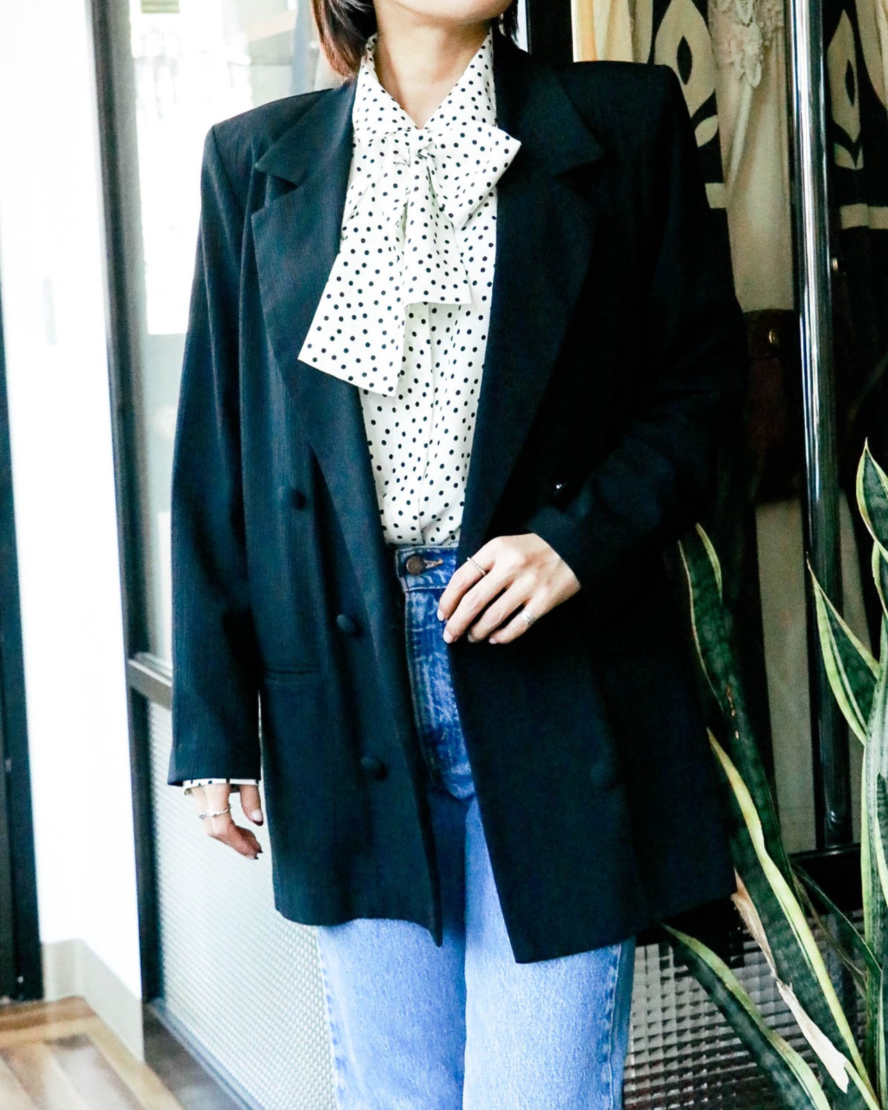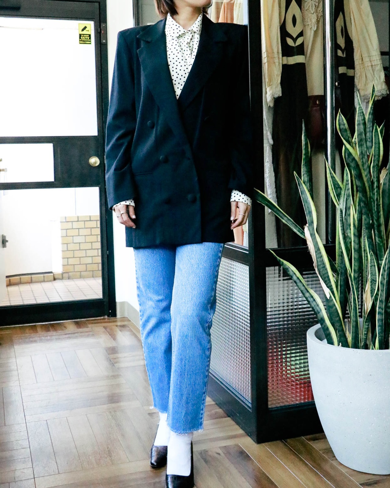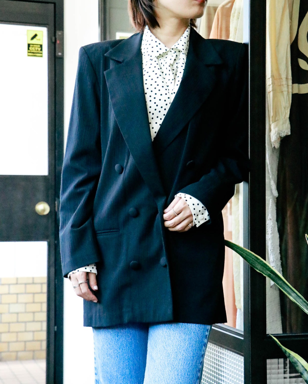 こちらは、春らしい素材感に気分も軽くなる80'sのブラックジャケット。