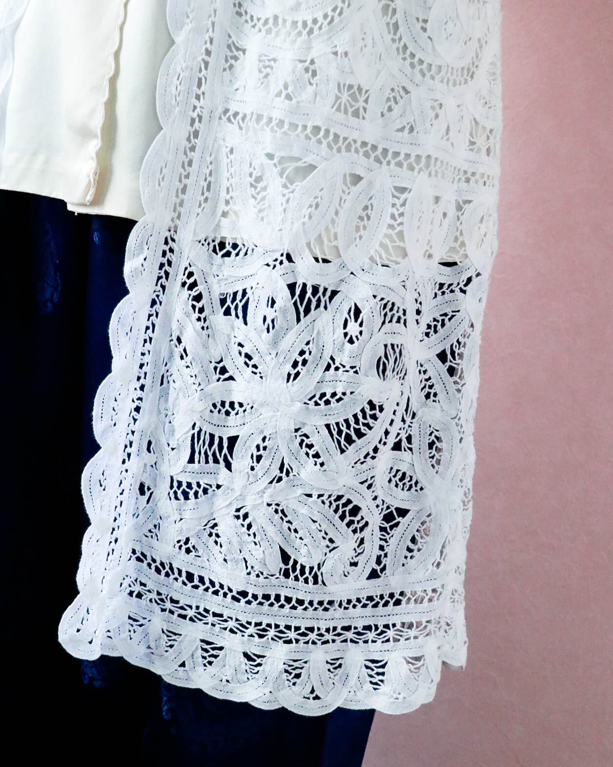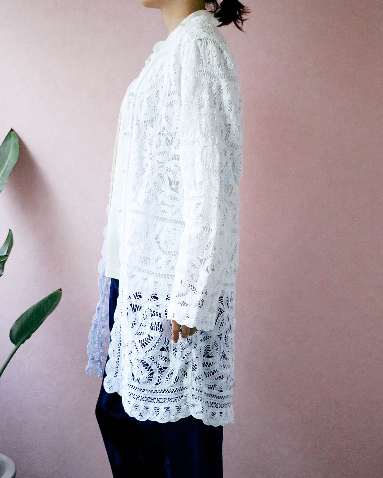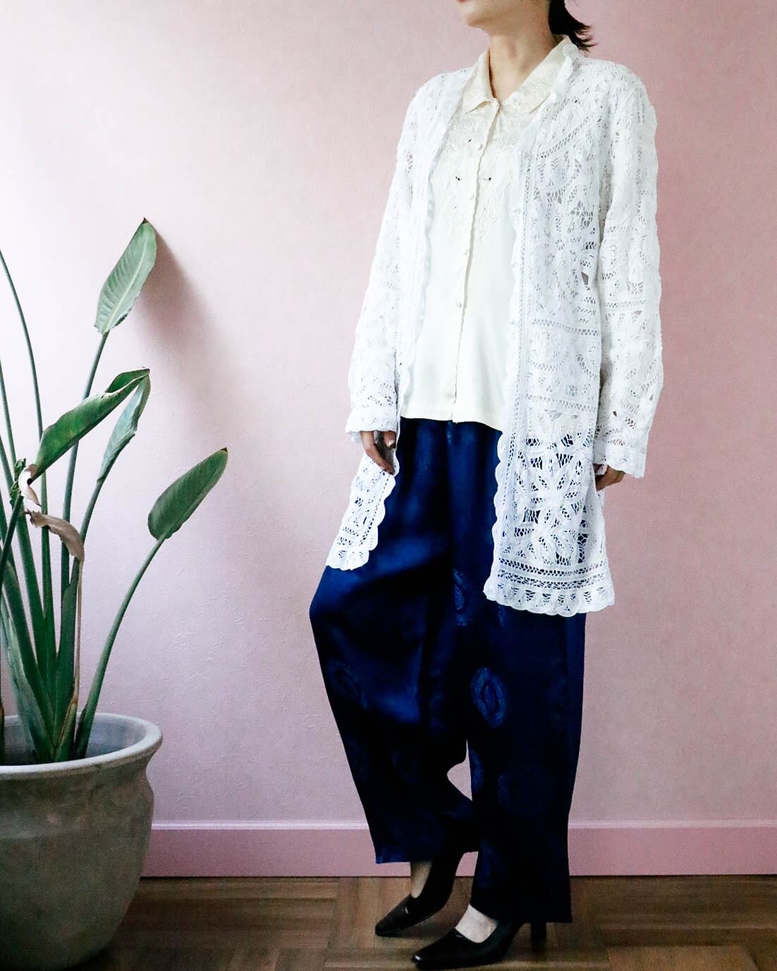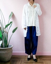 スカラップなフロントデザインやパールボタン、見れば見るほどその繊細な世界観にはまってしまいます。透け感をいかしたコーディネートが断然おすすめです!