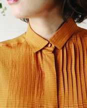 フロントのプリーツとシルエット、光沢感が品よく大人フェミニンを演出してくれます。