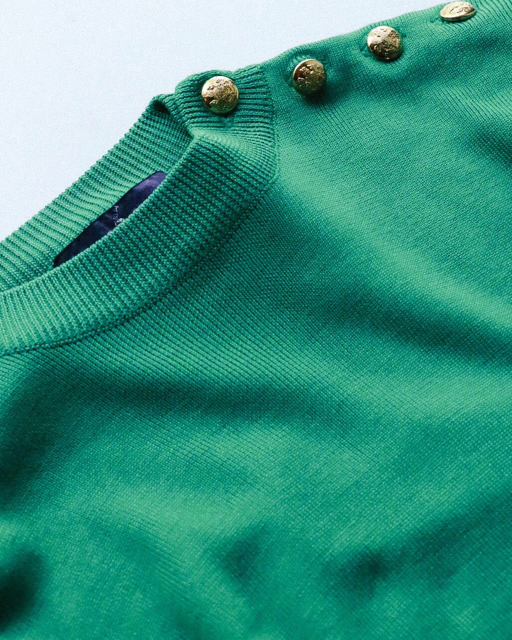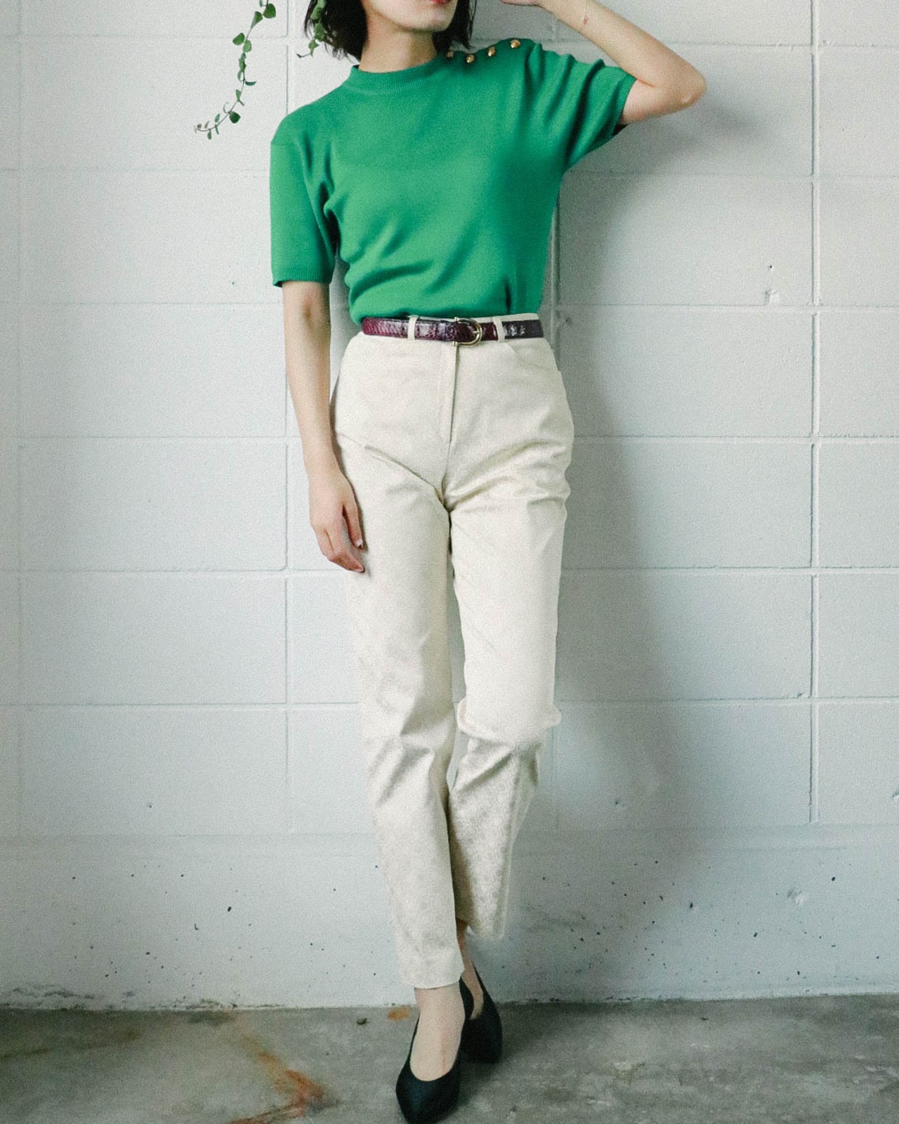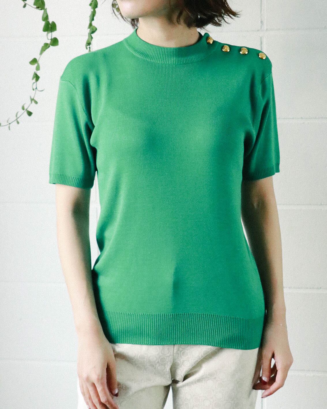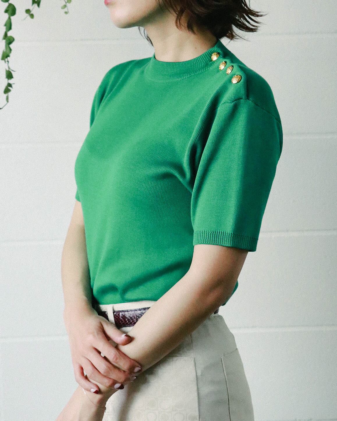 シルク100%の気持ちいい肌触りが贅沢な一着。左ショルダーのゴールドボタンが上品なアクセントに。春夏は色を活かしシンプルなブルーデニムと合わせたい。ジャケットやワンピースのインナーにも取り入れて一年中活躍できます。