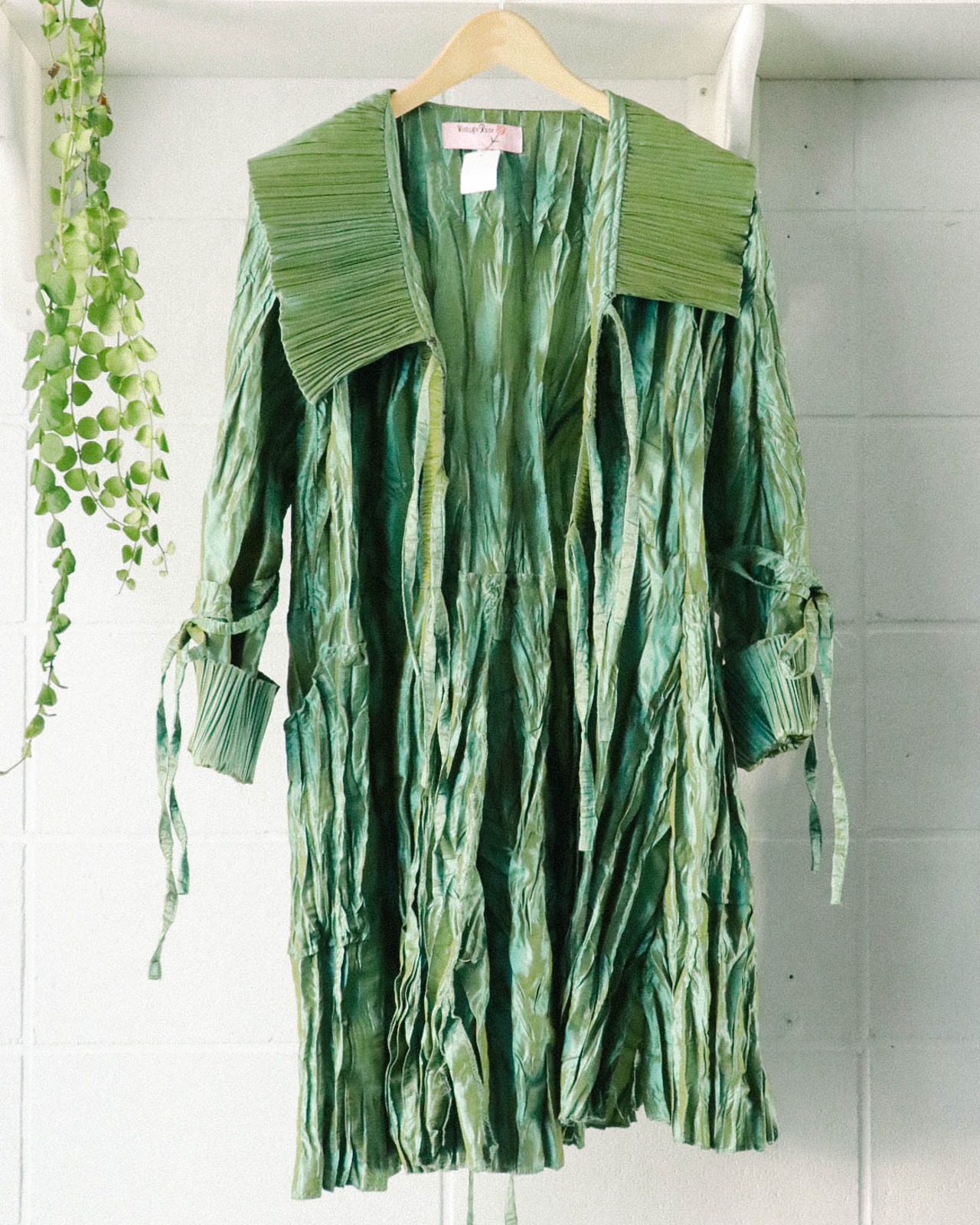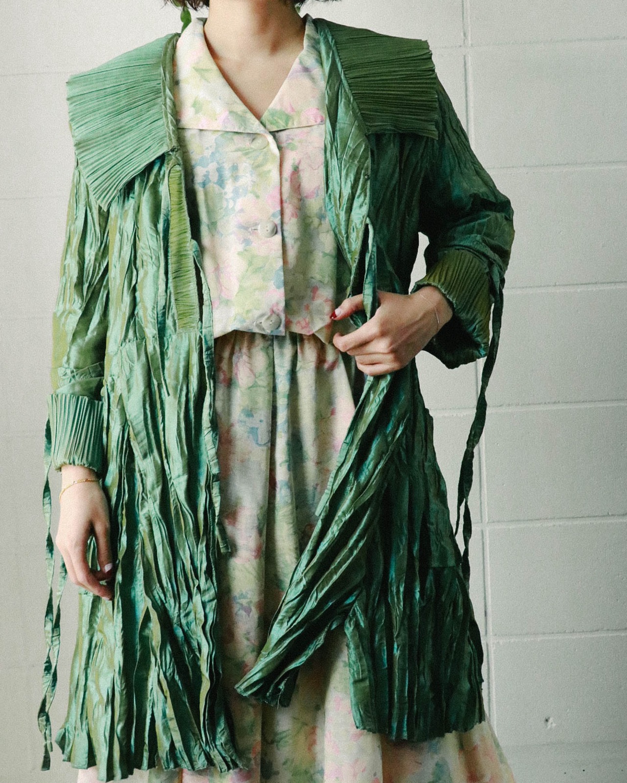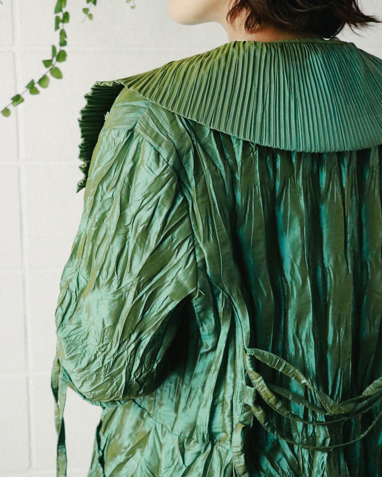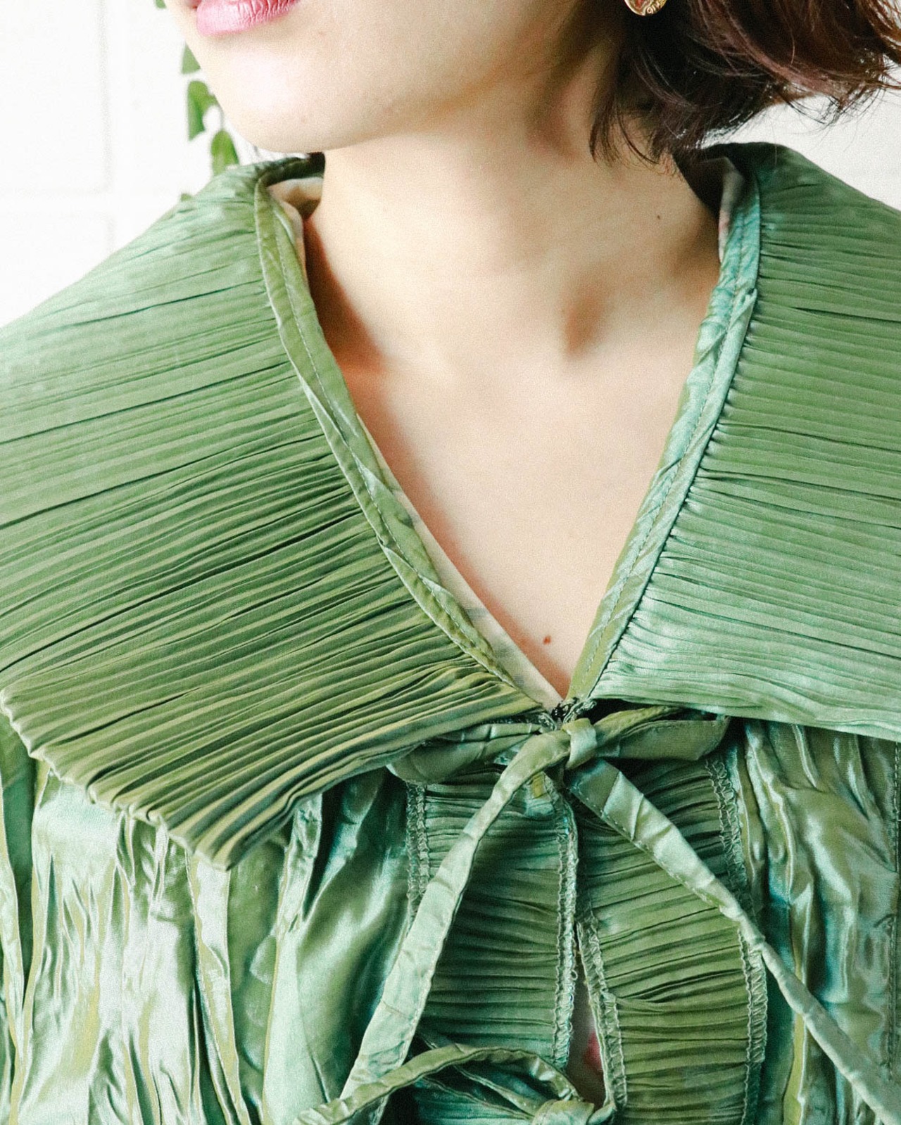 光沢感のあるグリーンカラーとプリーツ加工のコンビが、光の加減によって豊かな表情を見せ、着る人も見る人も楽しませます。