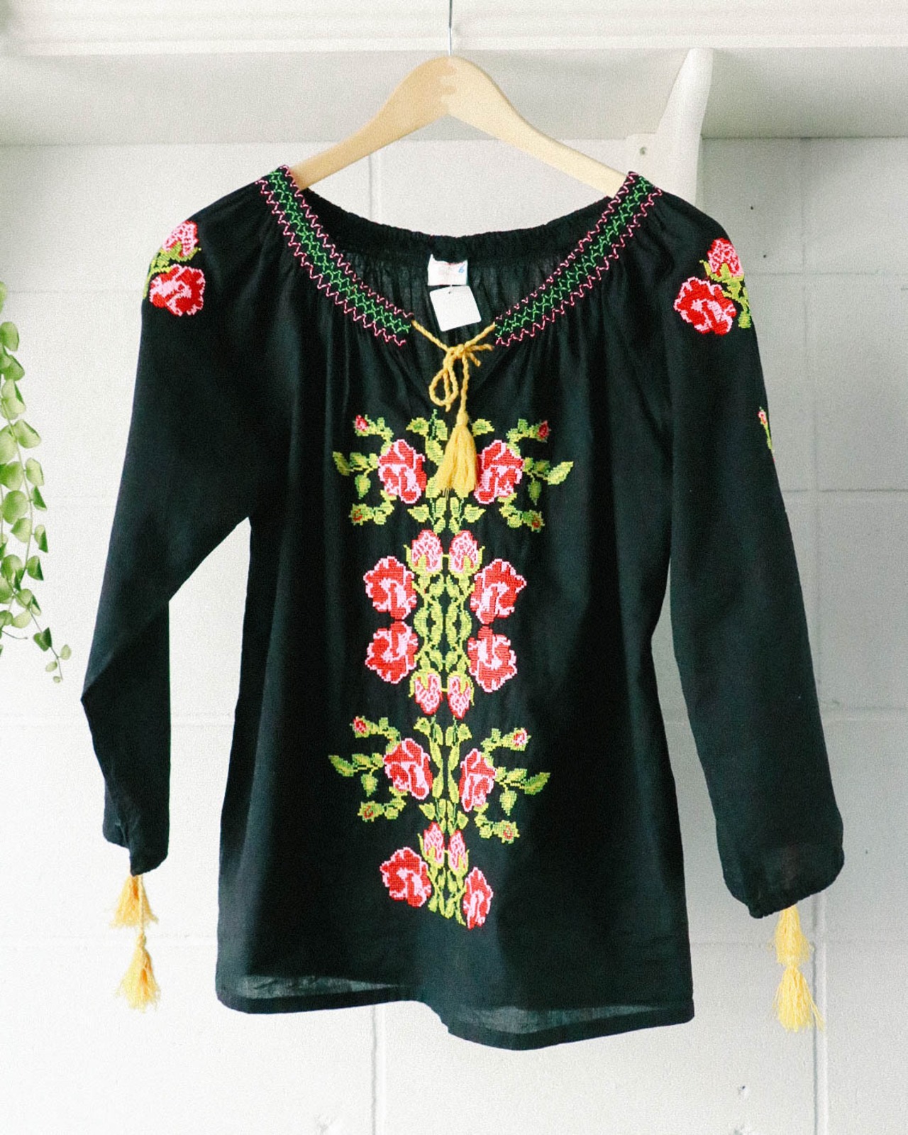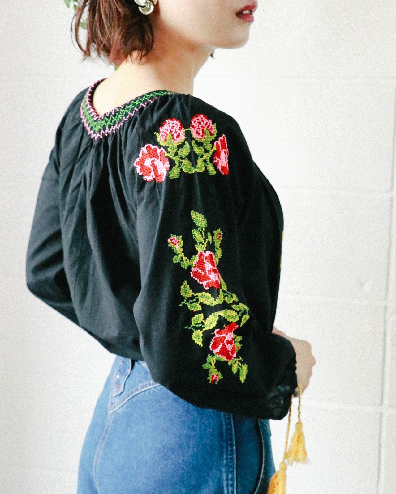 フロント、首・袖元と細部まで行き届いた華やかな刺繍デザインに思わずうっとり。
