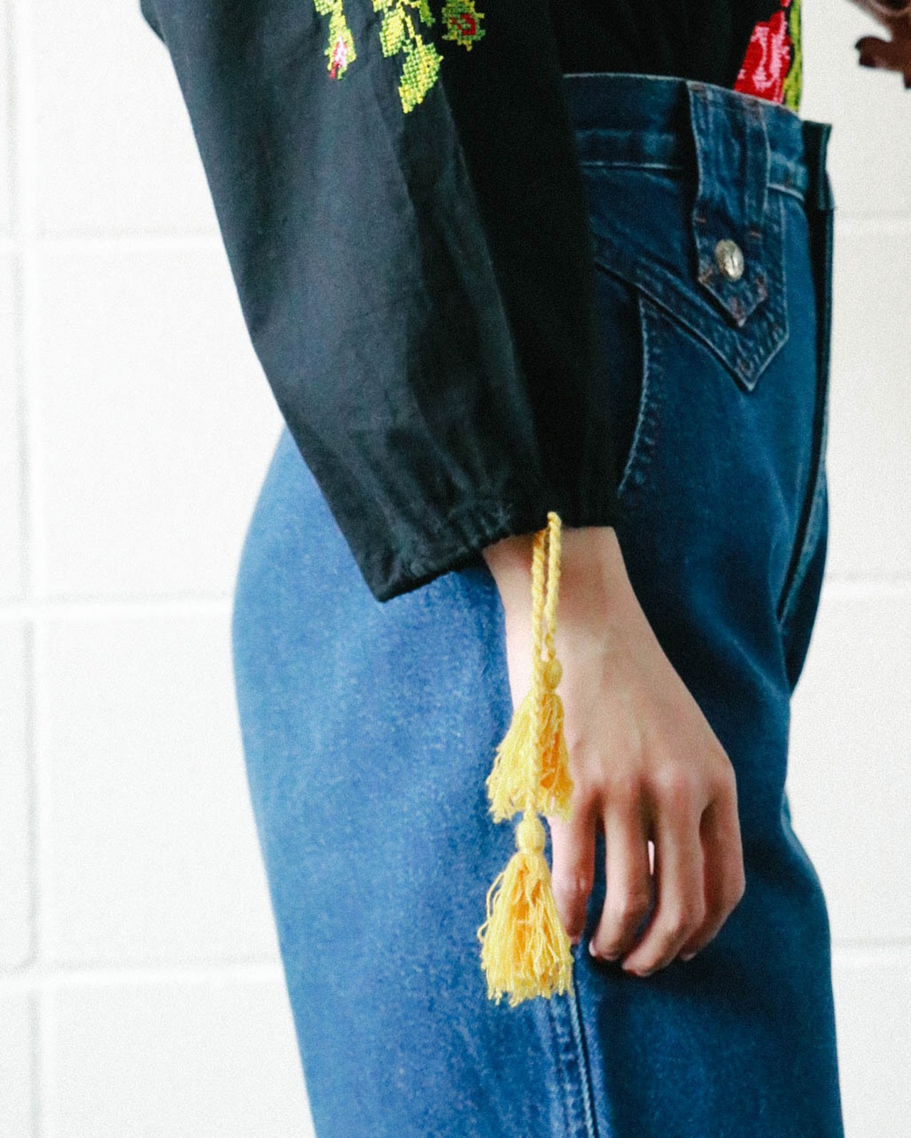 イエローカラーのタッセルリボンも良いアクセントで、きゅっと結んでもゆるっと垂らしても可愛い。
