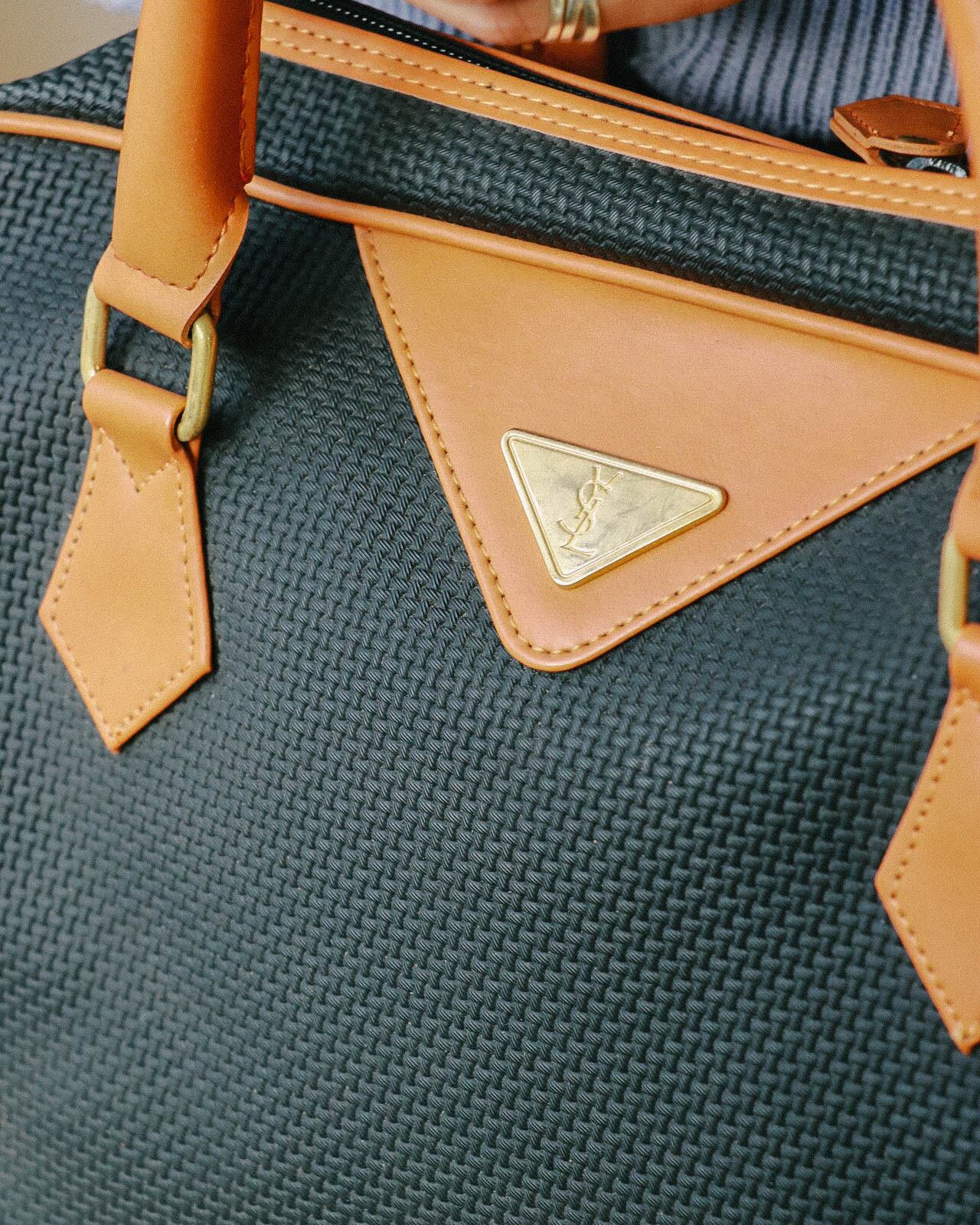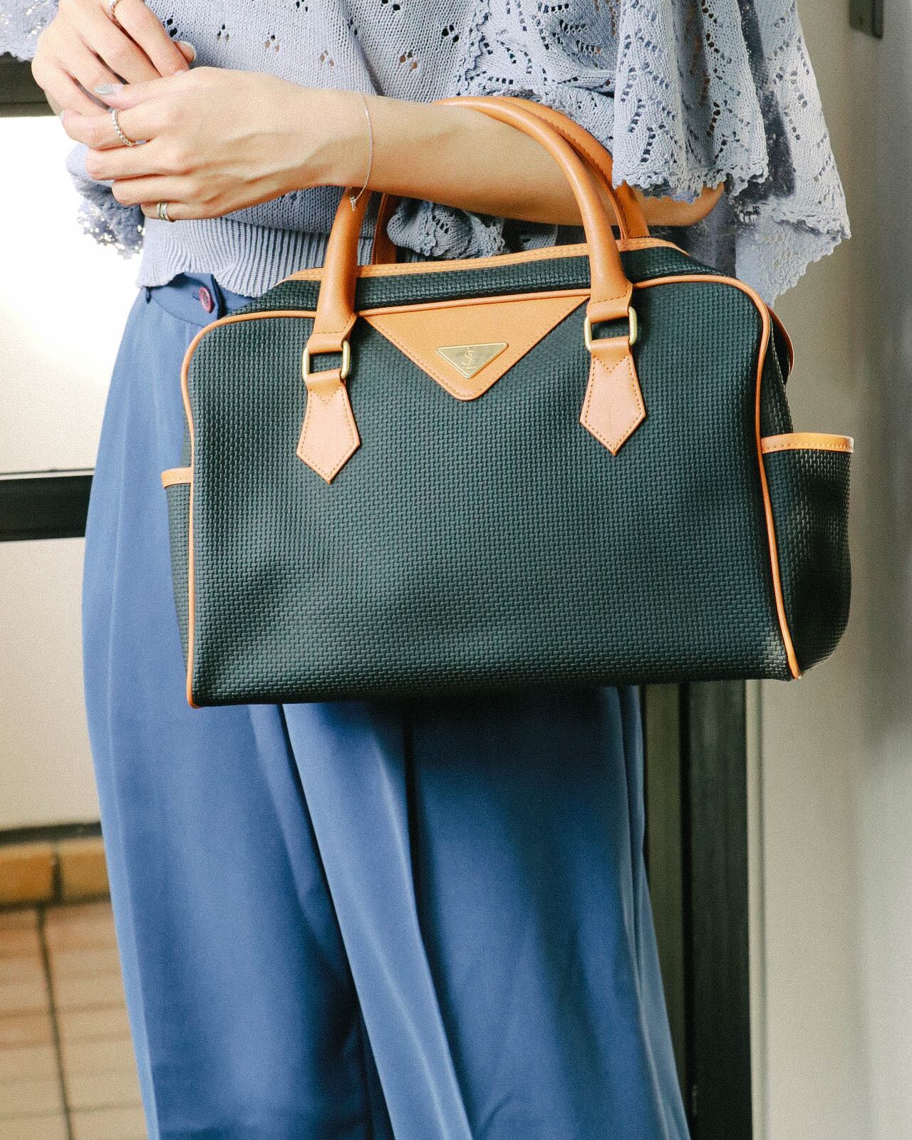 ネイビーとキャメルのバイカラーボストンバッグはイヴ・サンローランのもの。