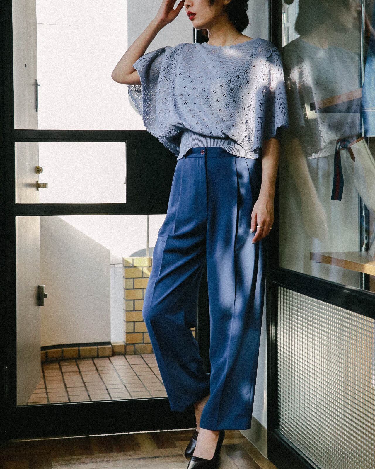 すとんと落ちる程よいストレートシルエット、シワになりにくいタフなポリエステル素材でデイリーに着回しやすくセンタープレスにハイウエストでスタイルアップ効果有り。