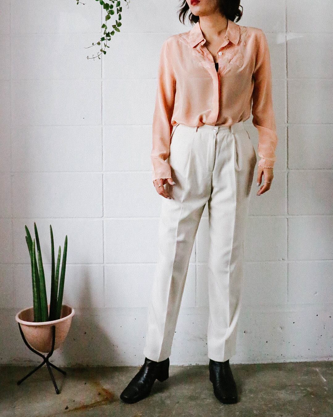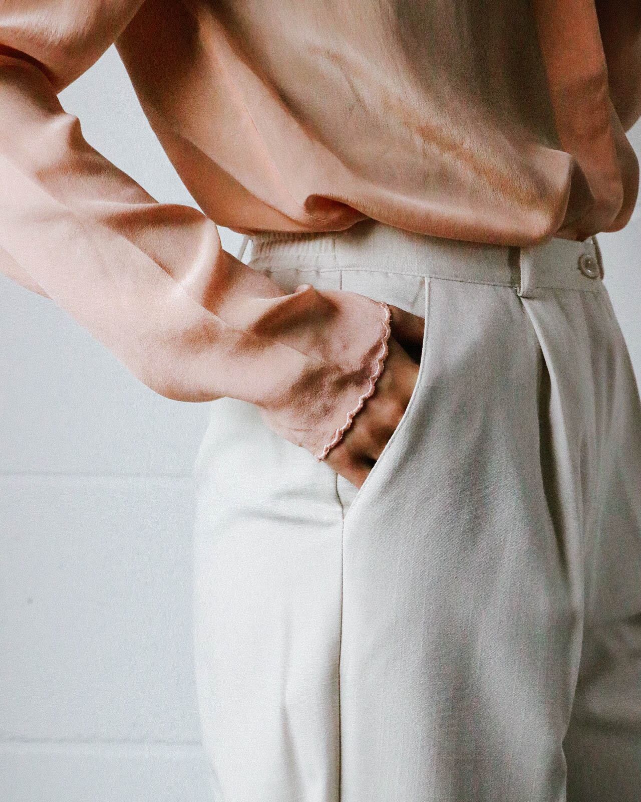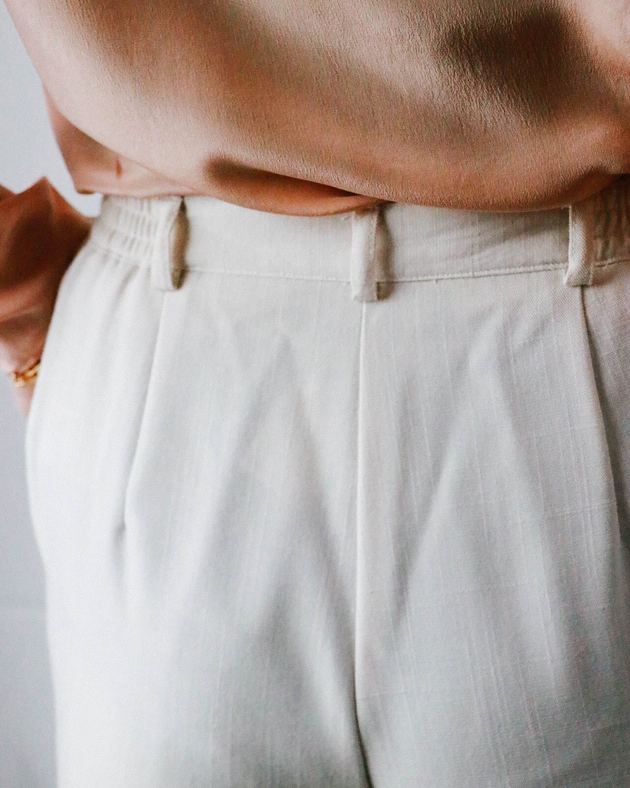 春夏のワードローブに一本は、揃えておきたいホワイト系のパンツ。こちらはオフホワイトのハイウエスト タックパンツ。見た目だけでなく着心地の良い清涼感、真夏まで使える実用性も嬉しいポイント。