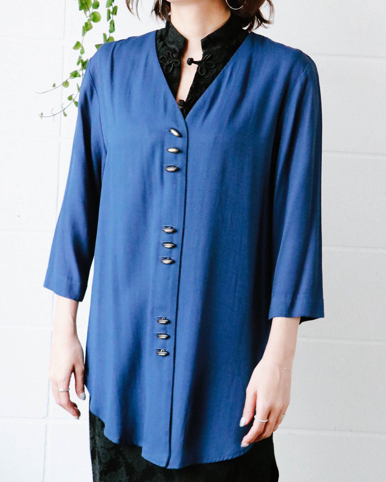 綺麗なインディゴブルーが目を惹くシャツブラウス。