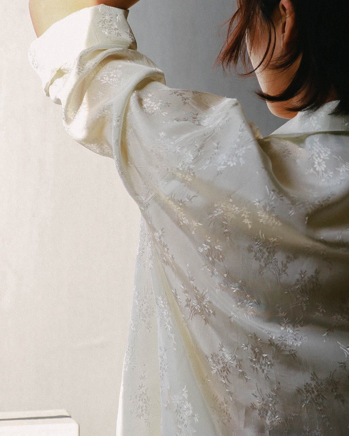 光沢ある花柄の生地が、マニッシュなテーラードジャケットを女性らしくアップデート。