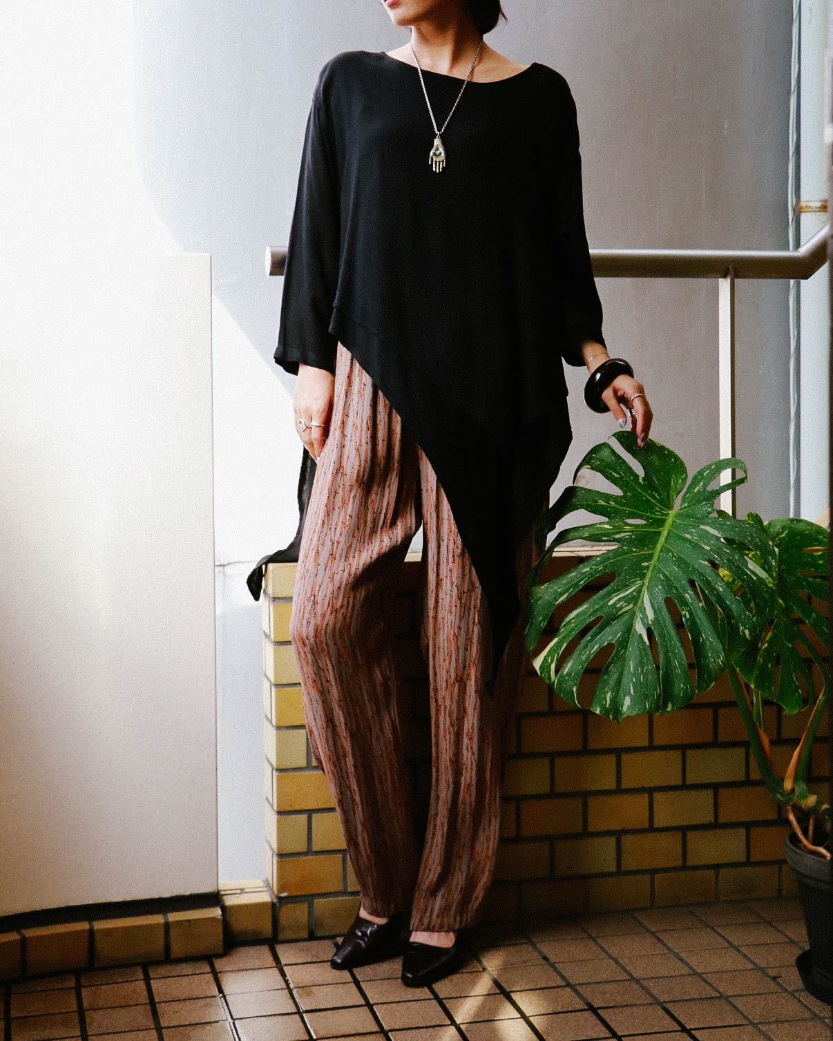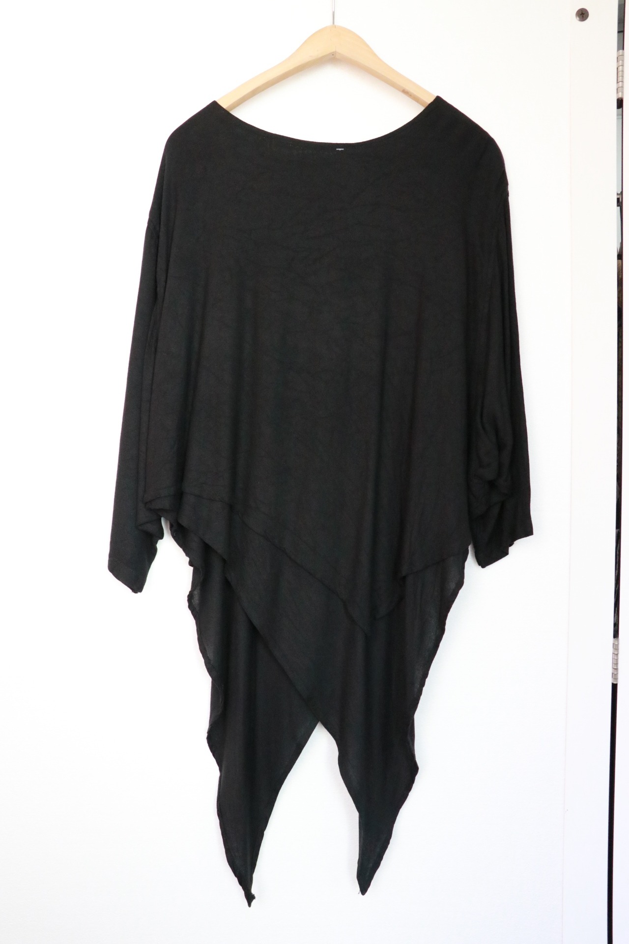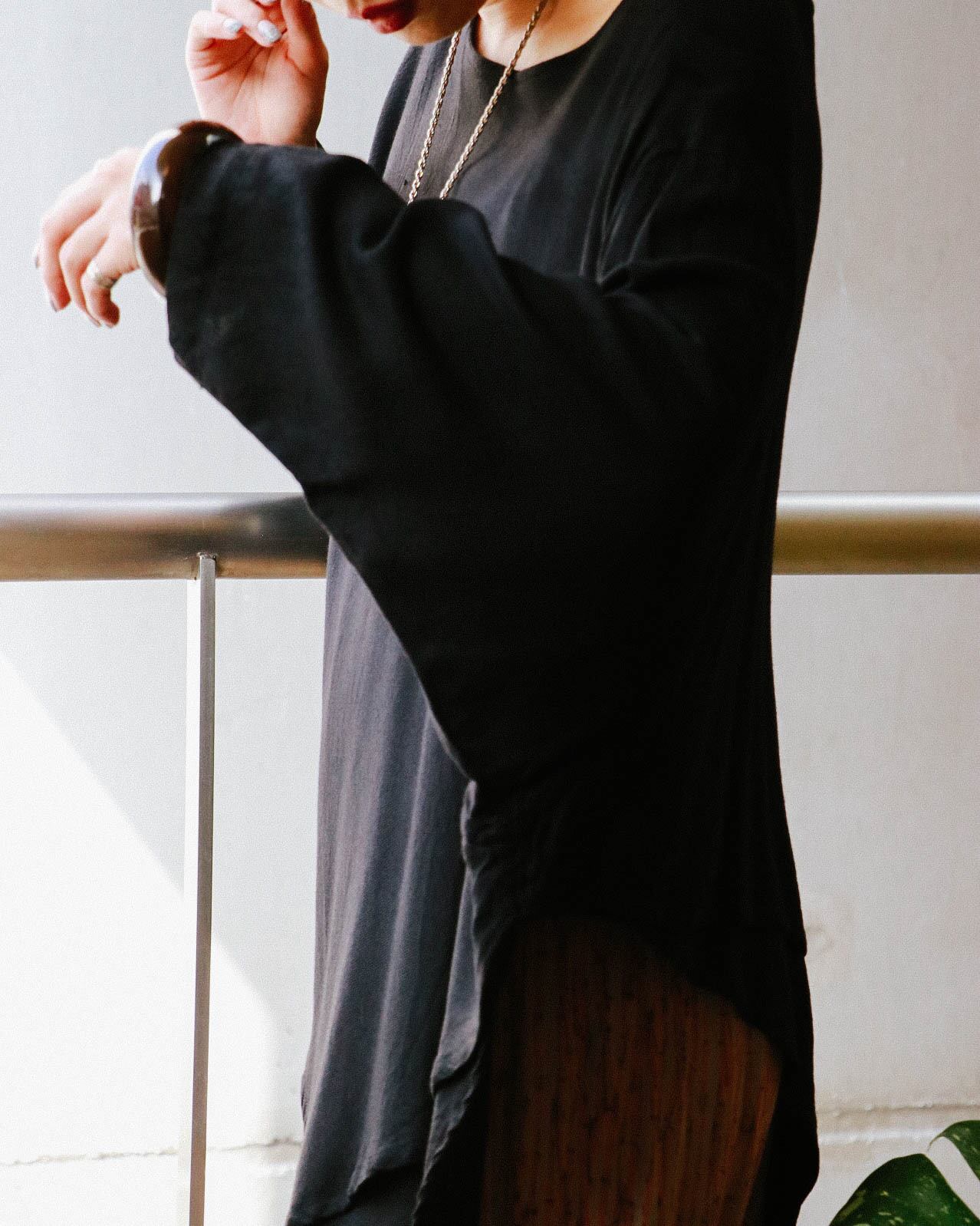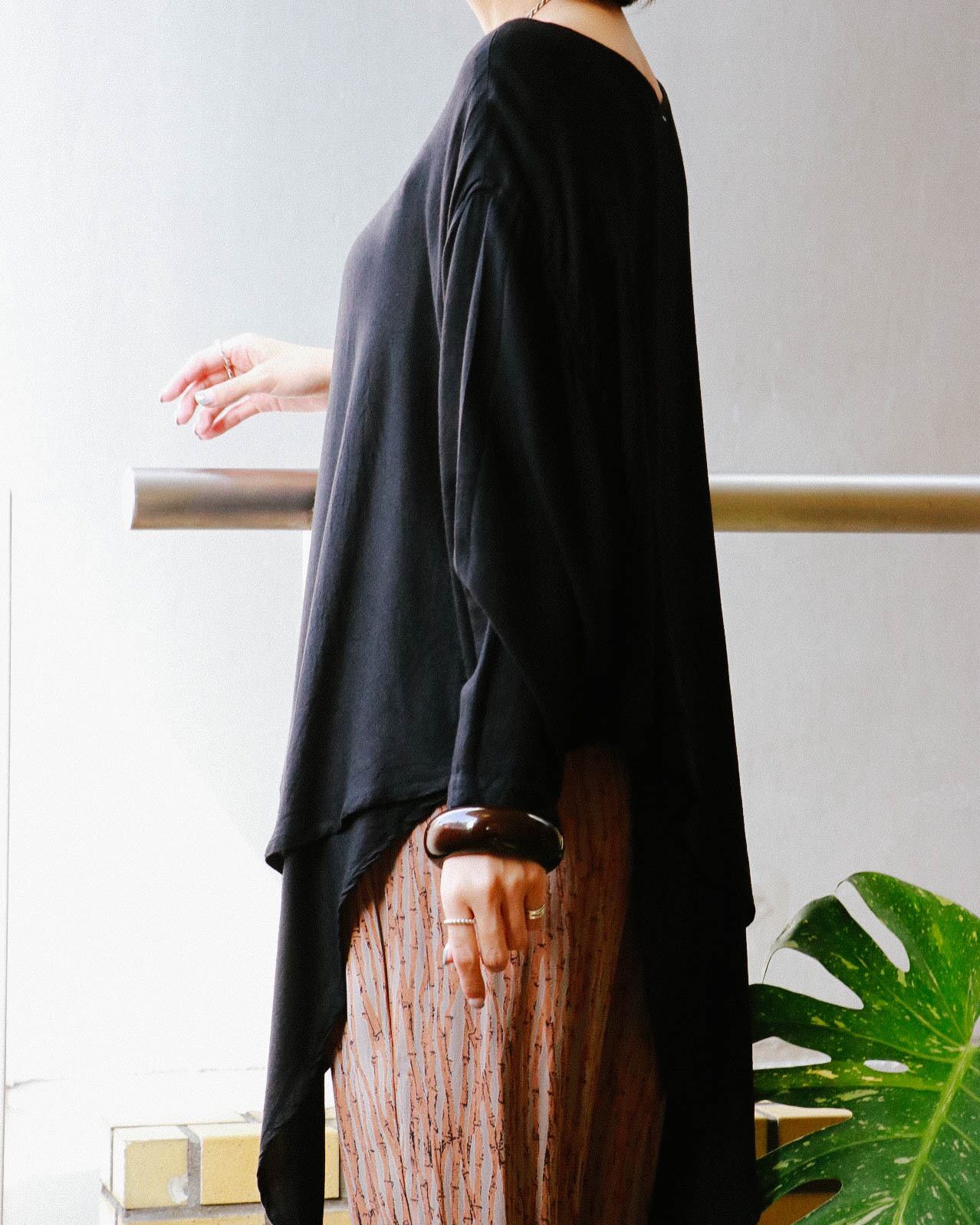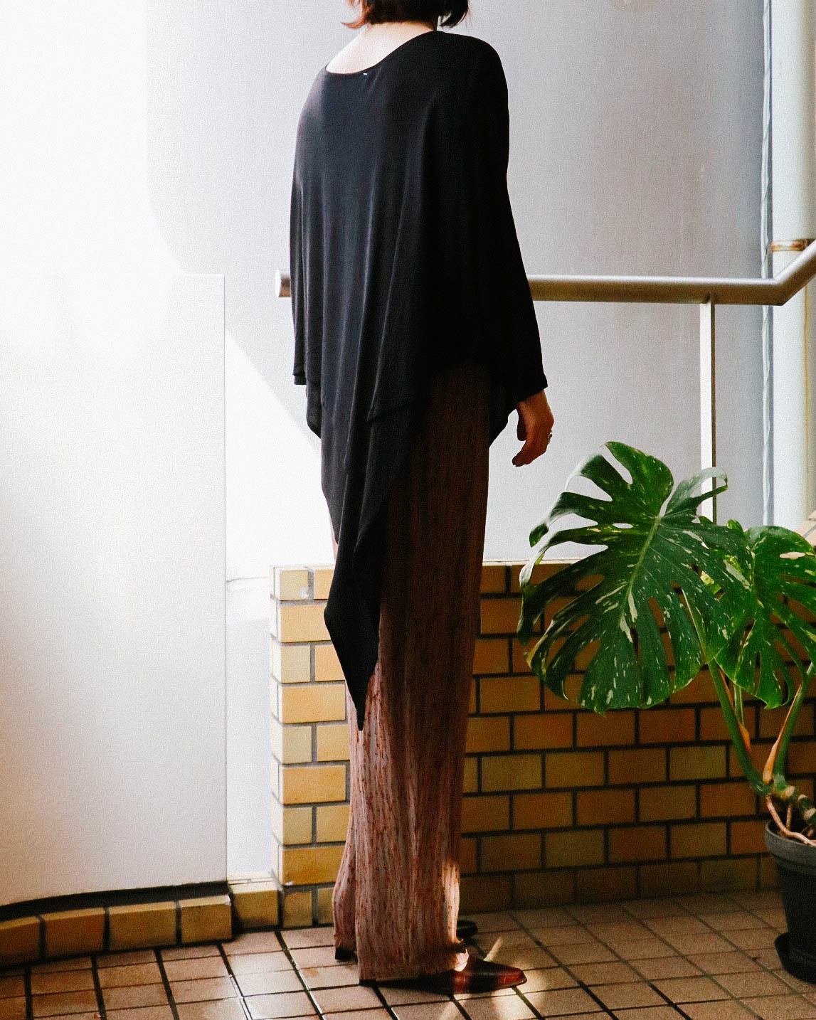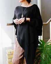 デコルテ周りは広めのラウンドネック。左右からみると表情が変わるアシメントリーデザインで