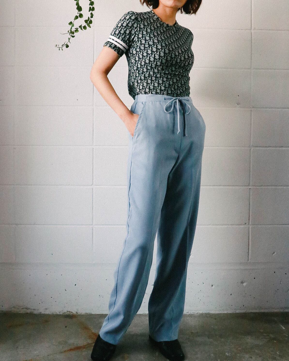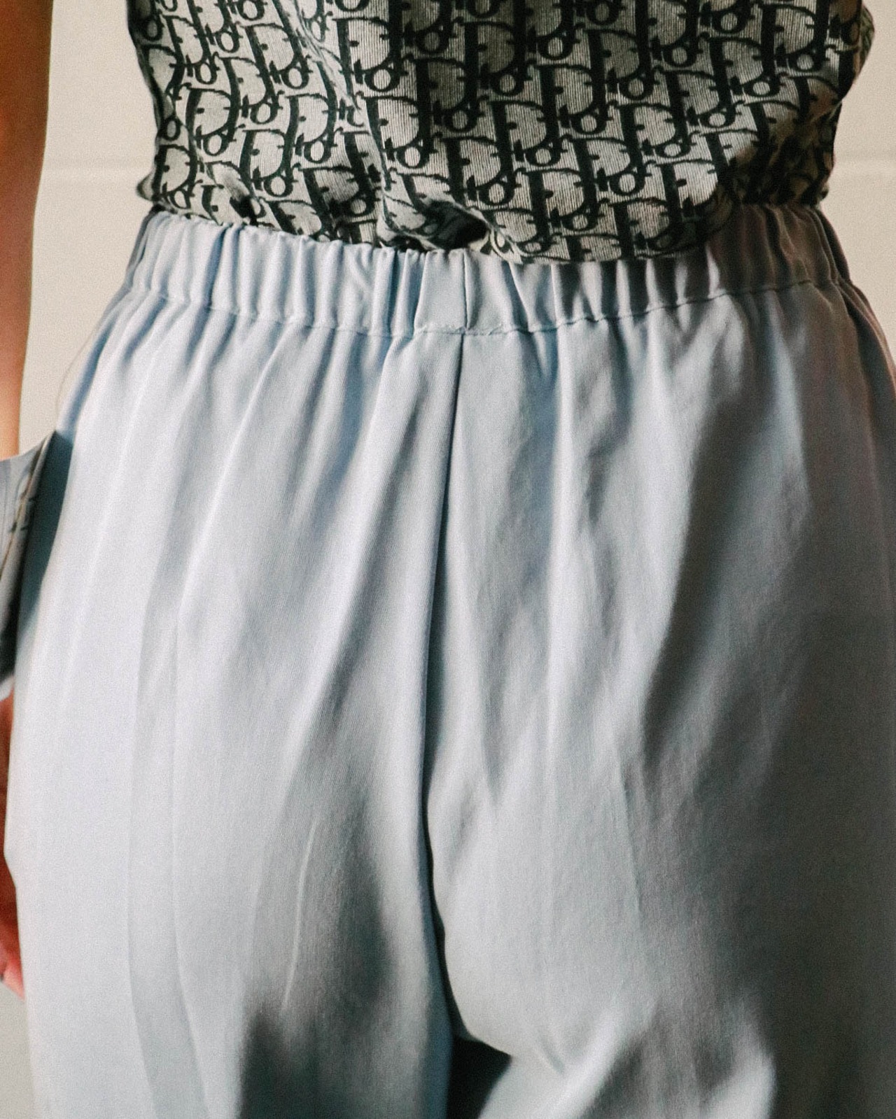 フロントがヒモ、バッグがゴムになったウエストデザインでリラックスムード漂います。