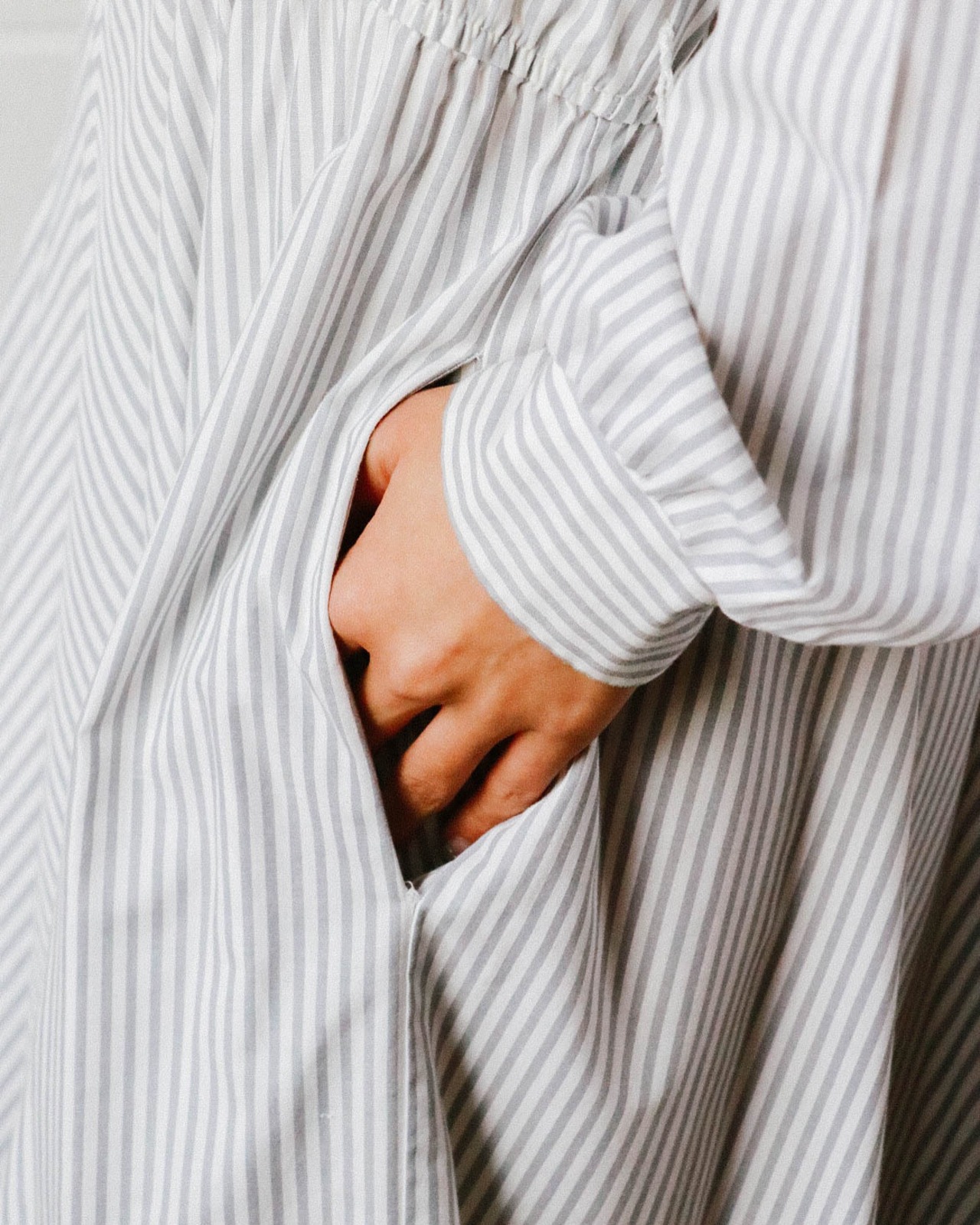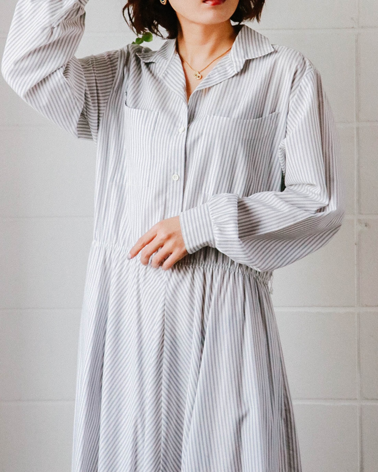 グレーとホワイトのスマートなストライプ柄が爽やかな大人の女性らしさを演出。