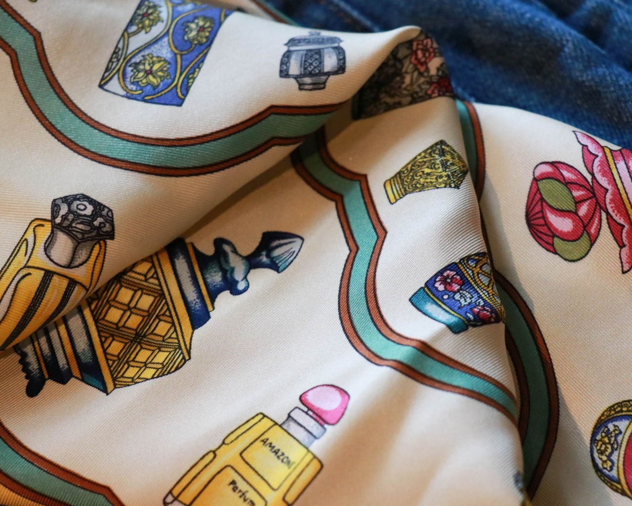 オフホワイトをベースに様々なパフューム柄に心おどるデザインです。