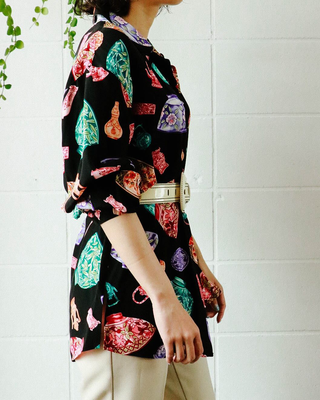 アジアンテイストな陶器の美しいプリントがシルクのしっとり感と相まって雰囲気のある一着。とても目をひきます。