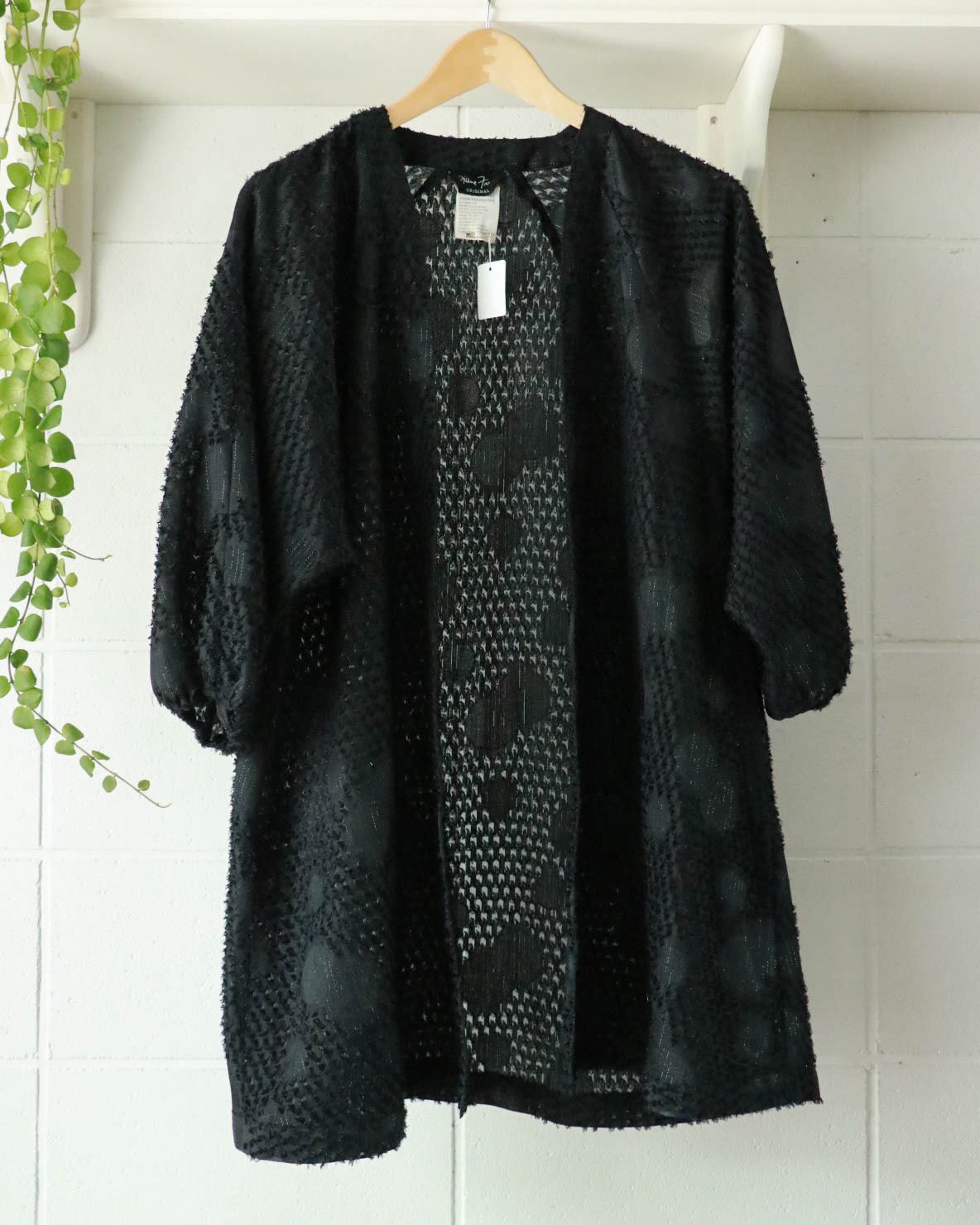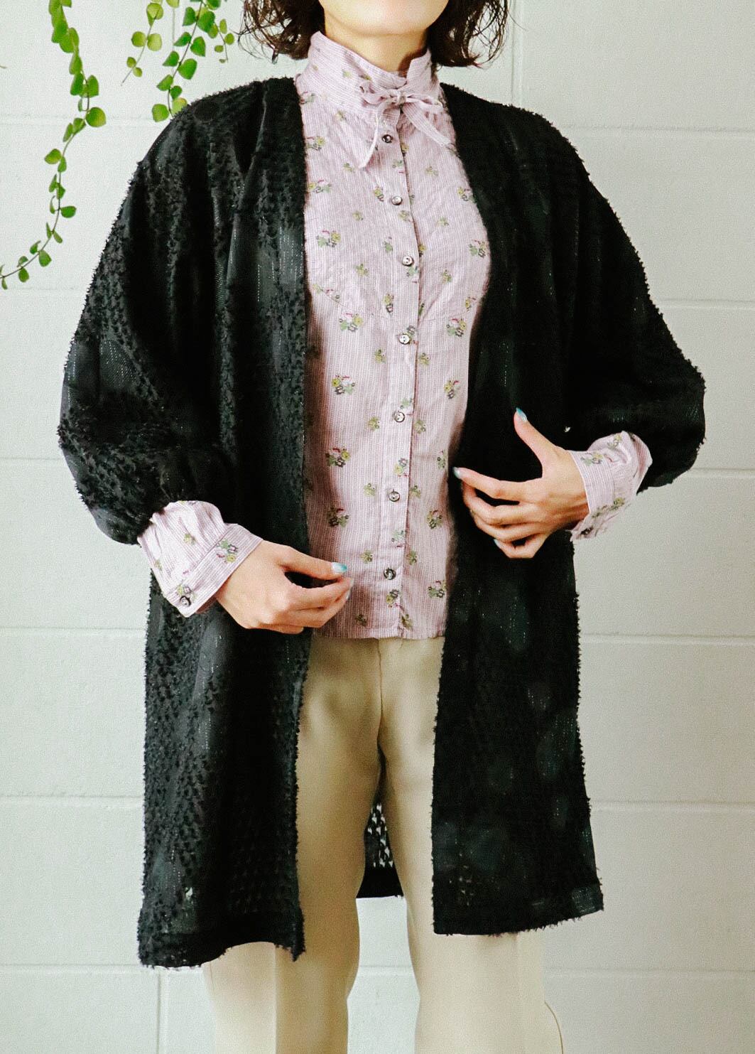 黒一色で統一された羽織りもの。ですが歩くたびに優雅な動きをみせるデザインはまさにダイアン。ボリュームのある七分袖や縫製でつくるカモフラージュ模様が魅力的な一着です。