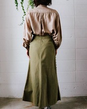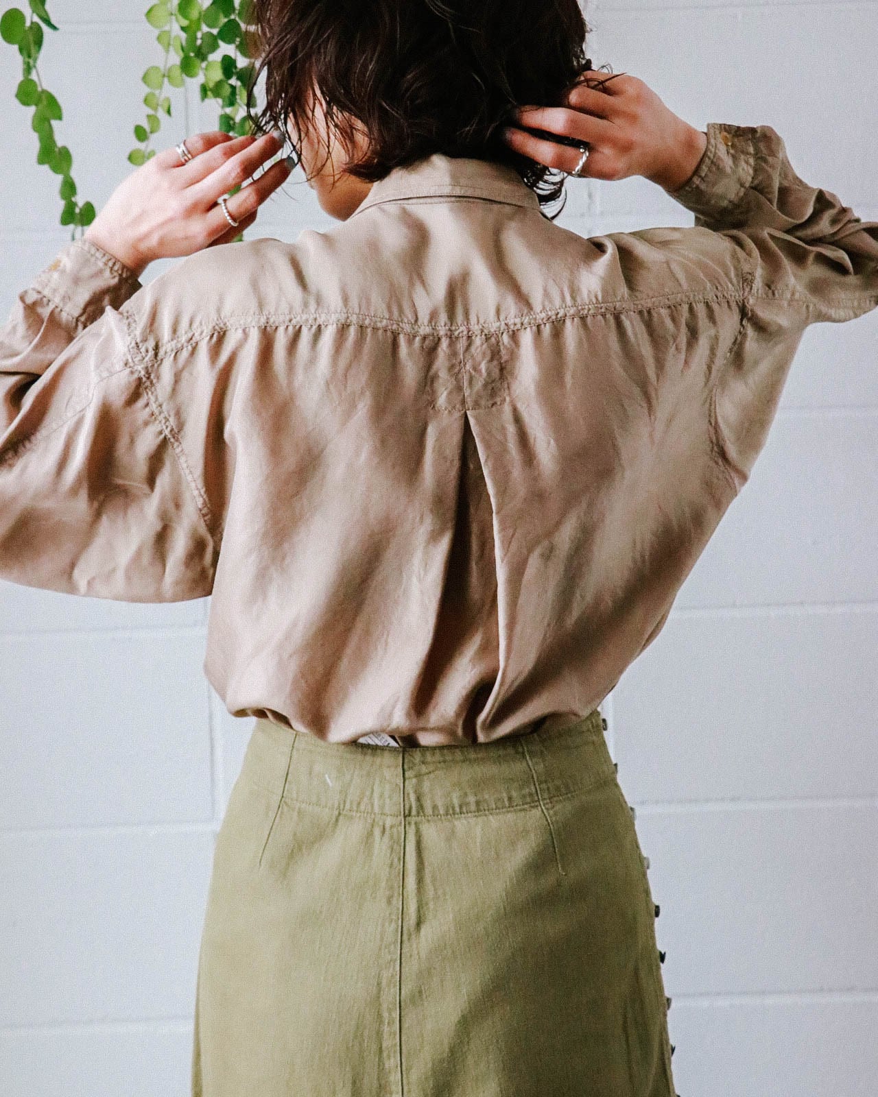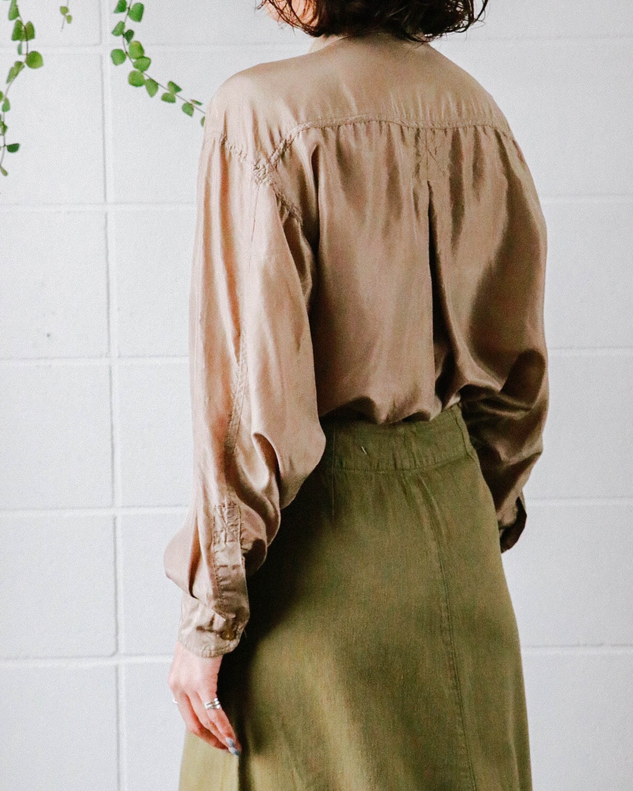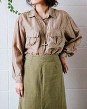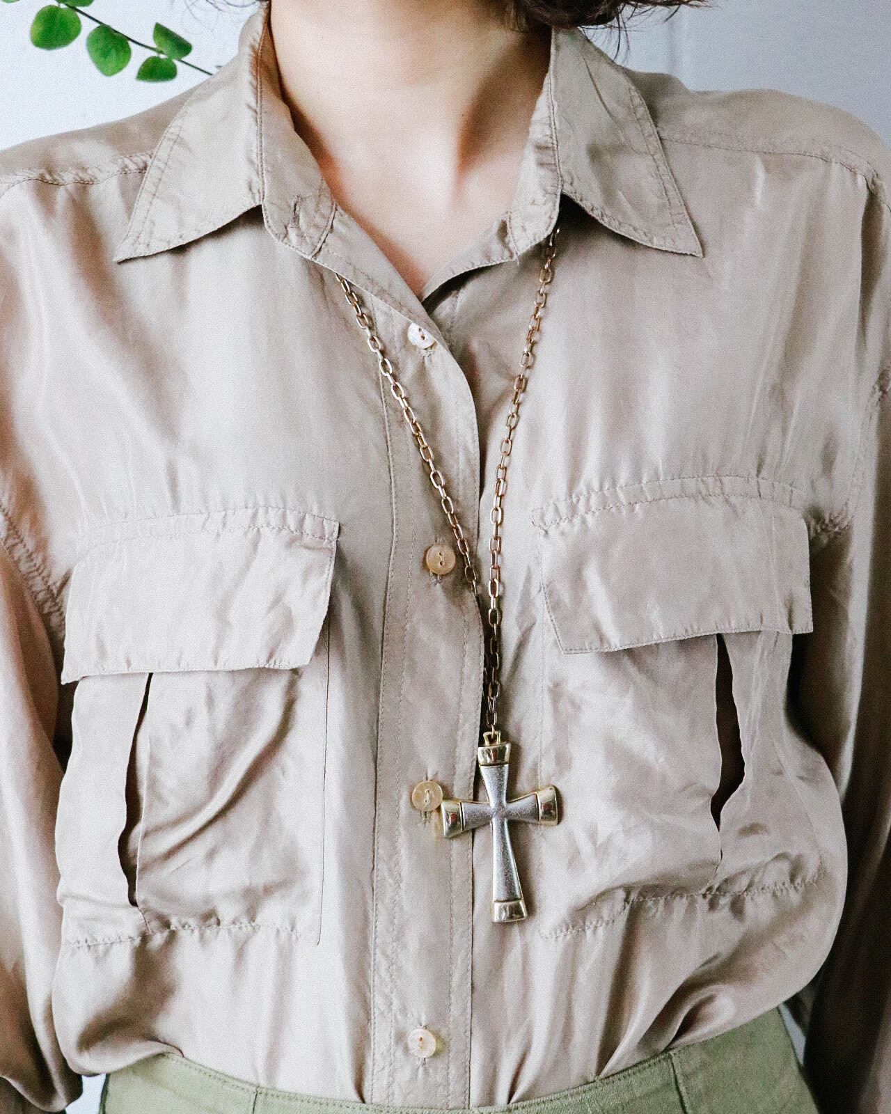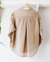 メンズライクなサイズ感とディテールにしなやかなシルク素材の上品な光沢感、絶妙なライトブラウンの色味が今の気分にハマる。羽織としても優秀なシャツはワードローブに揃えておきたい。
