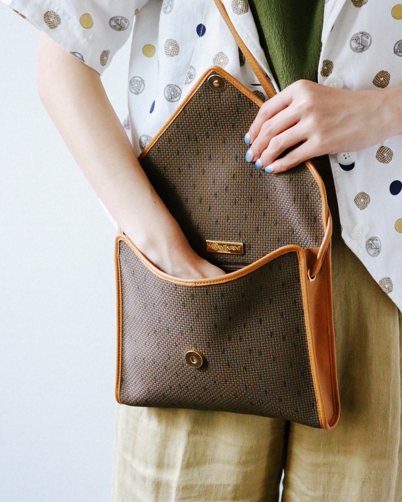 耐久性に優れたPVC素材とレザーを組み合わせたイブサンローランのメッシュショルダーバッグ。