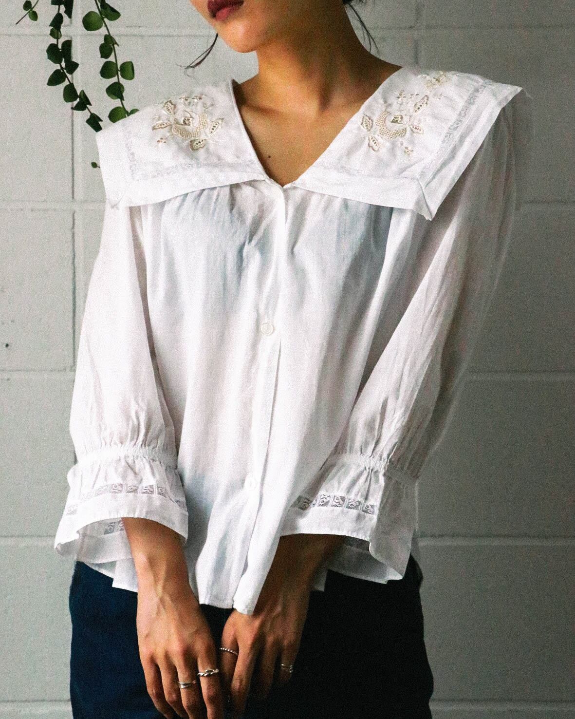 清潔感のある薄手コットンの涼しげな素材と、存在感のある直線的で大きな襟や袖口のディテールが全体的にロマンチックな雰囲気のサマーブラウス。ボタンを閉めたスタイルはもちろん、キャミソールやタンクトップに羽織っても可愛い一着です。