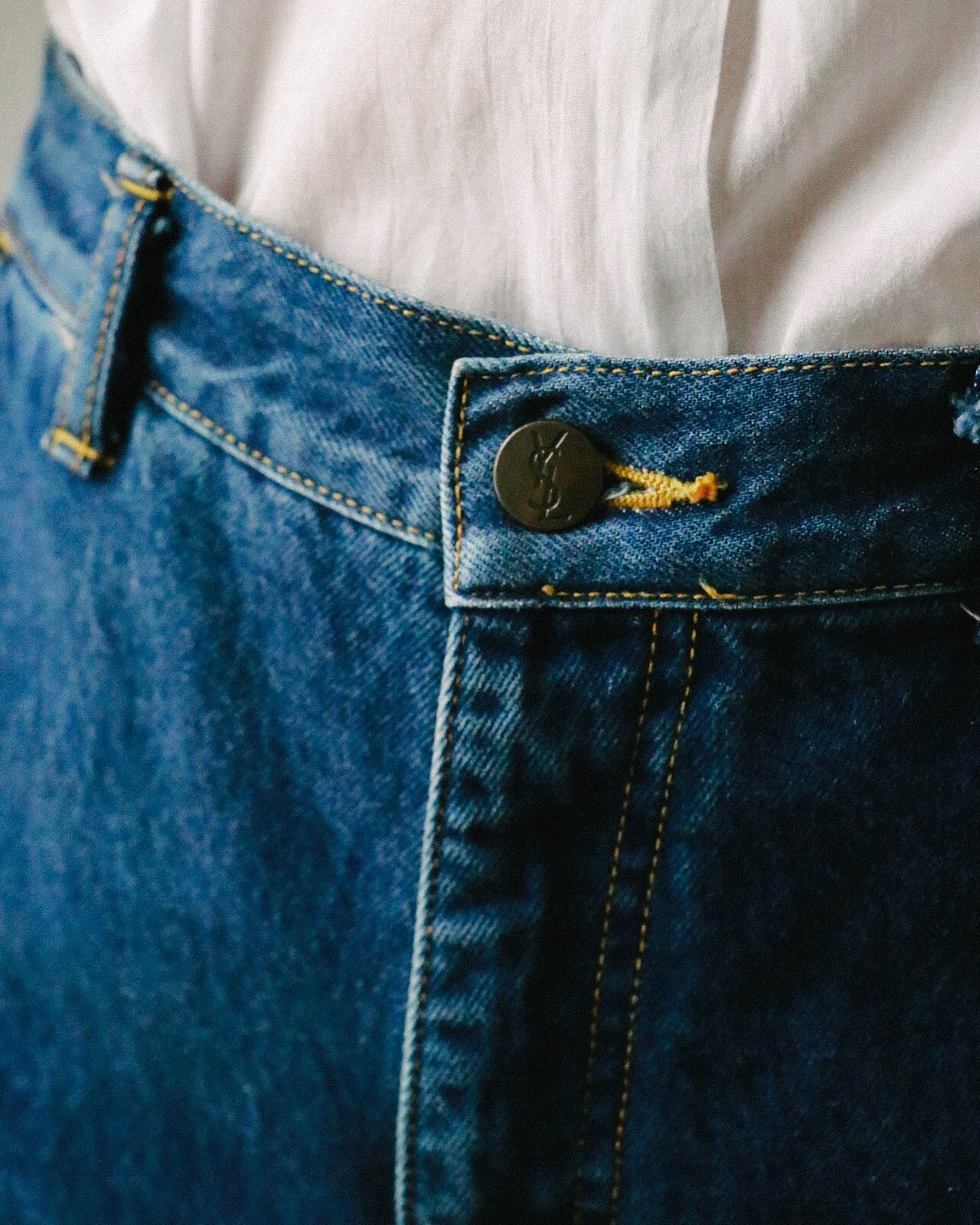 リベットやステッチなど細部のデザインまでこだわりが感じられるデニムパンツはシンプルにTシャツと合わせて着たい。