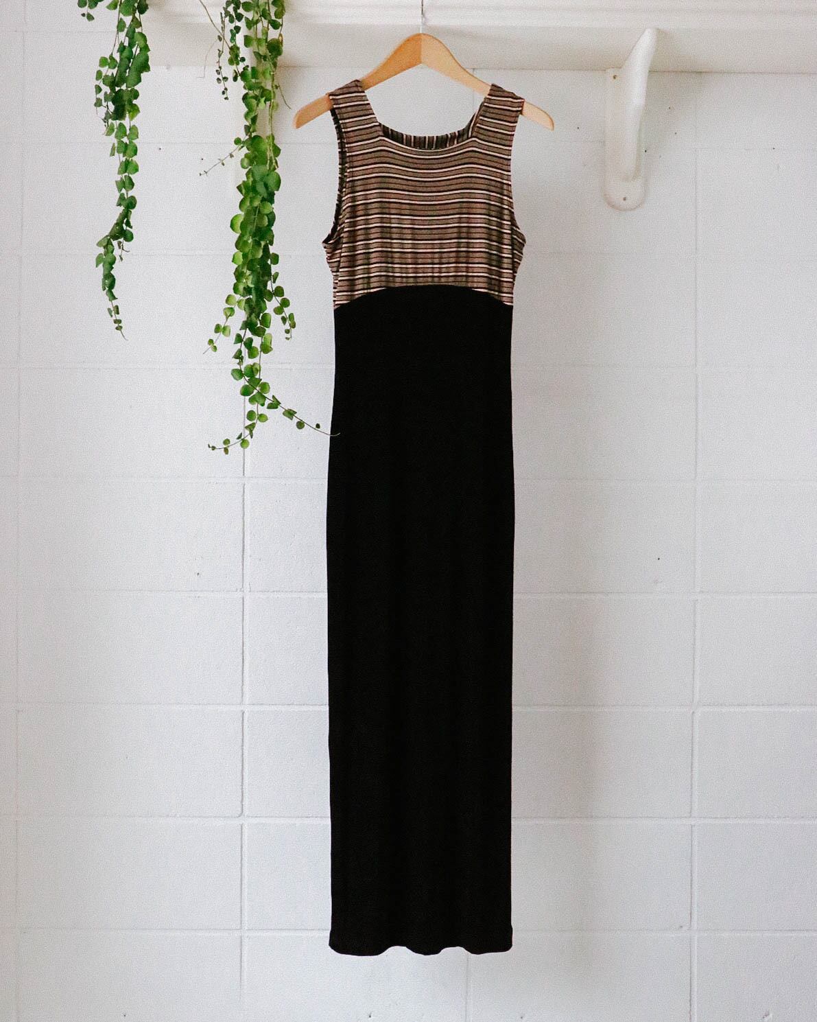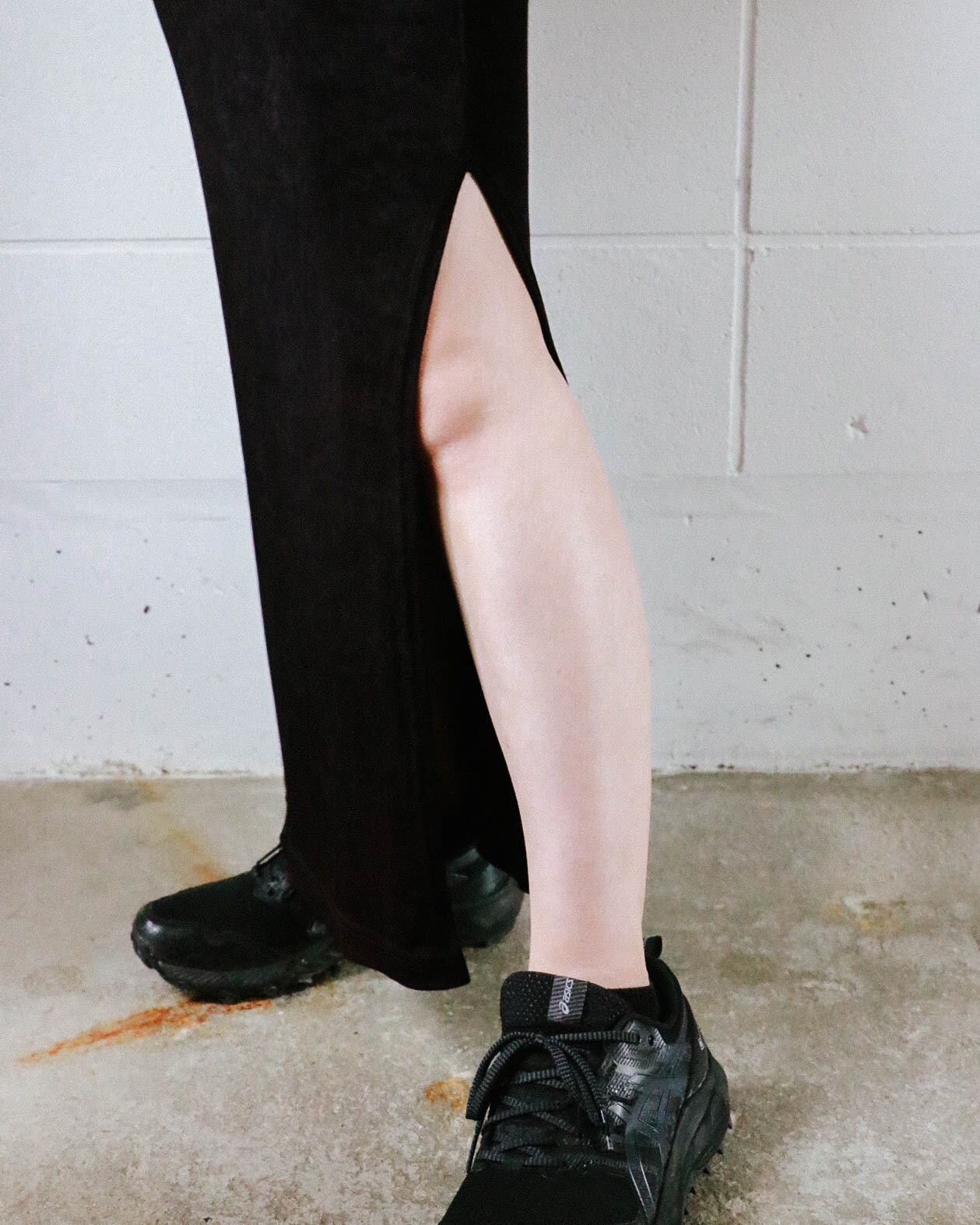 品のある光沢と伸縮性抜群の素材がストレスフリーな着心地を叶え、大人な華奢ボーダー柄に胸下からブラックカラーへの切り替え、長めのスリットで脚を長くスタイルアップして魅せてくれる。フィット感あるデザインが女性の色香をプラス。