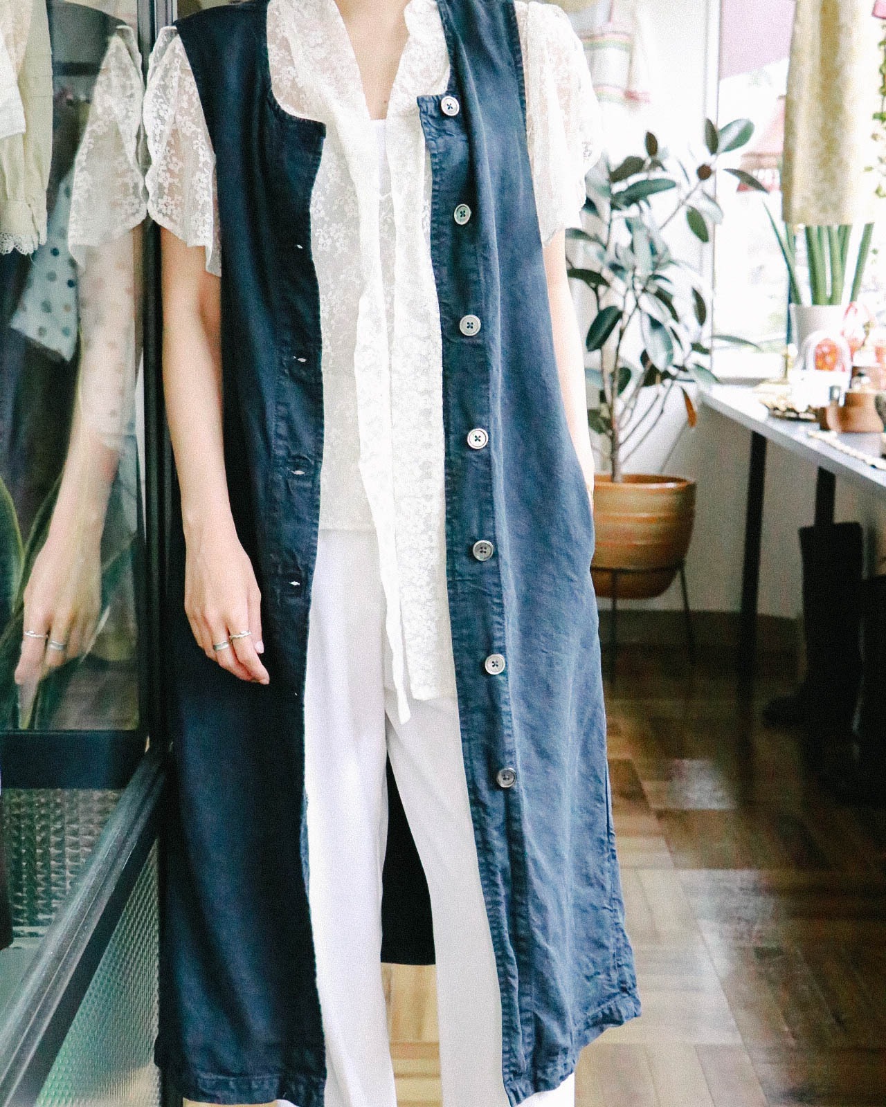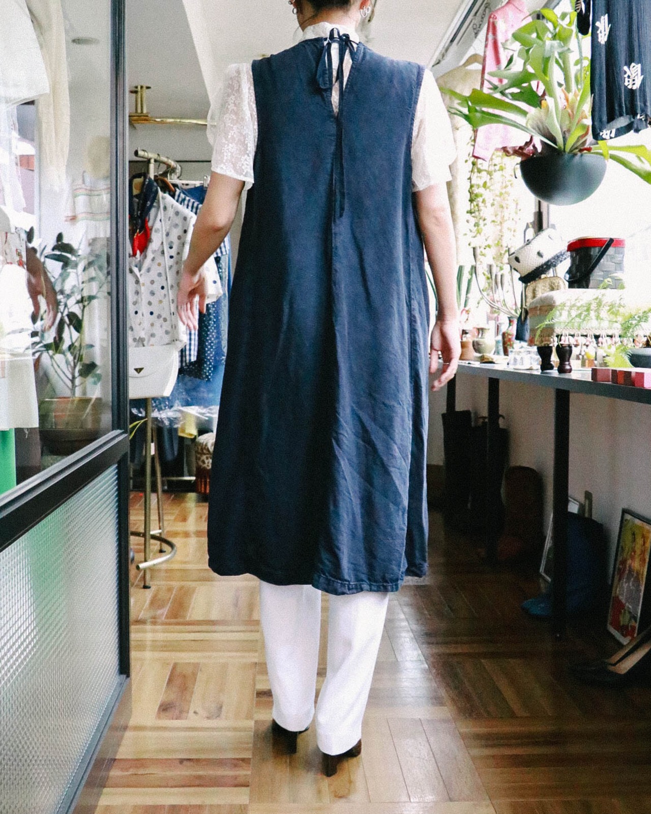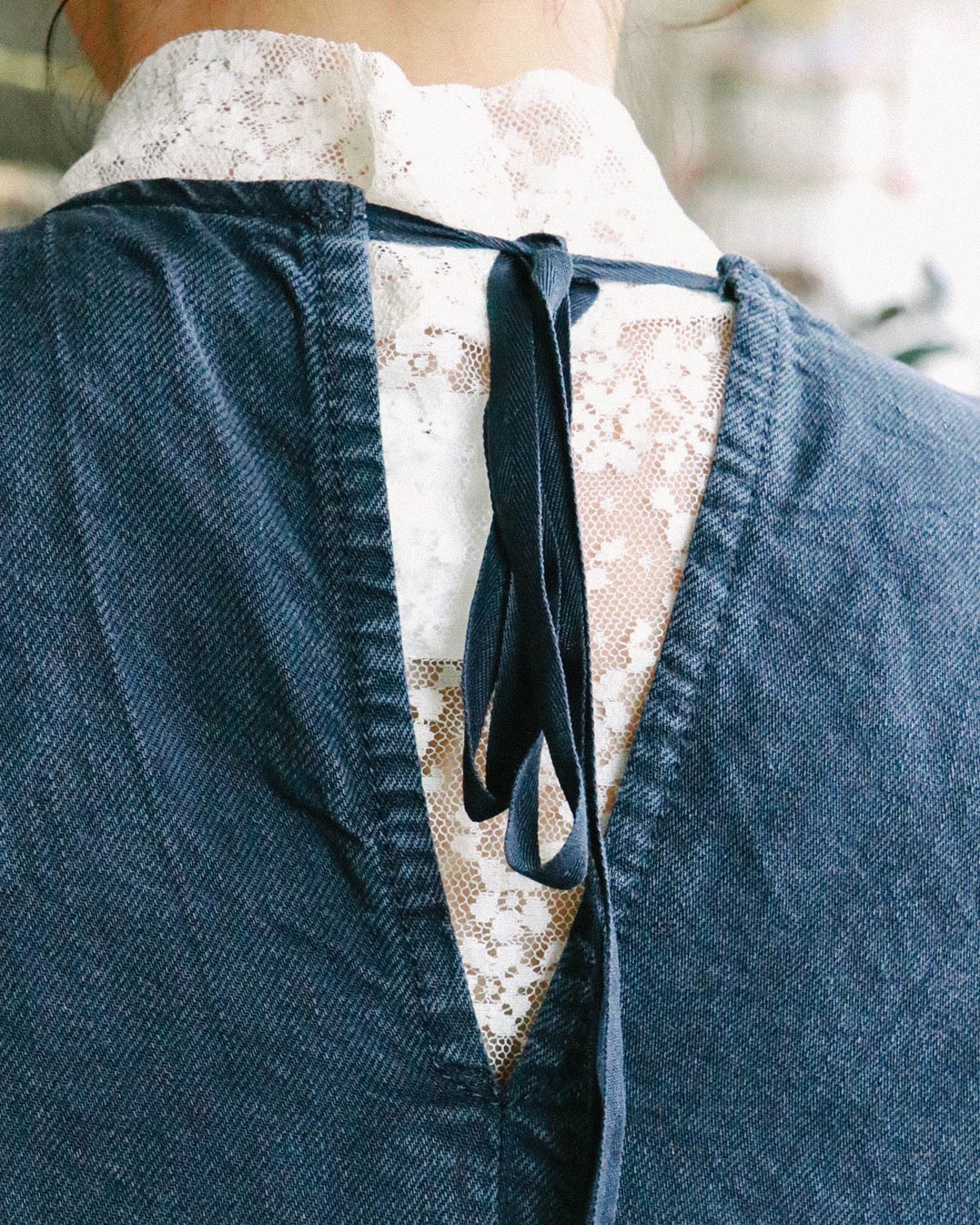 ボタンを閉めてワンピースとしたはもちろん、普段のシンプルなコーディネートにベスト羽織りとしても使用できます。バックスタイルのリボンがポイント!