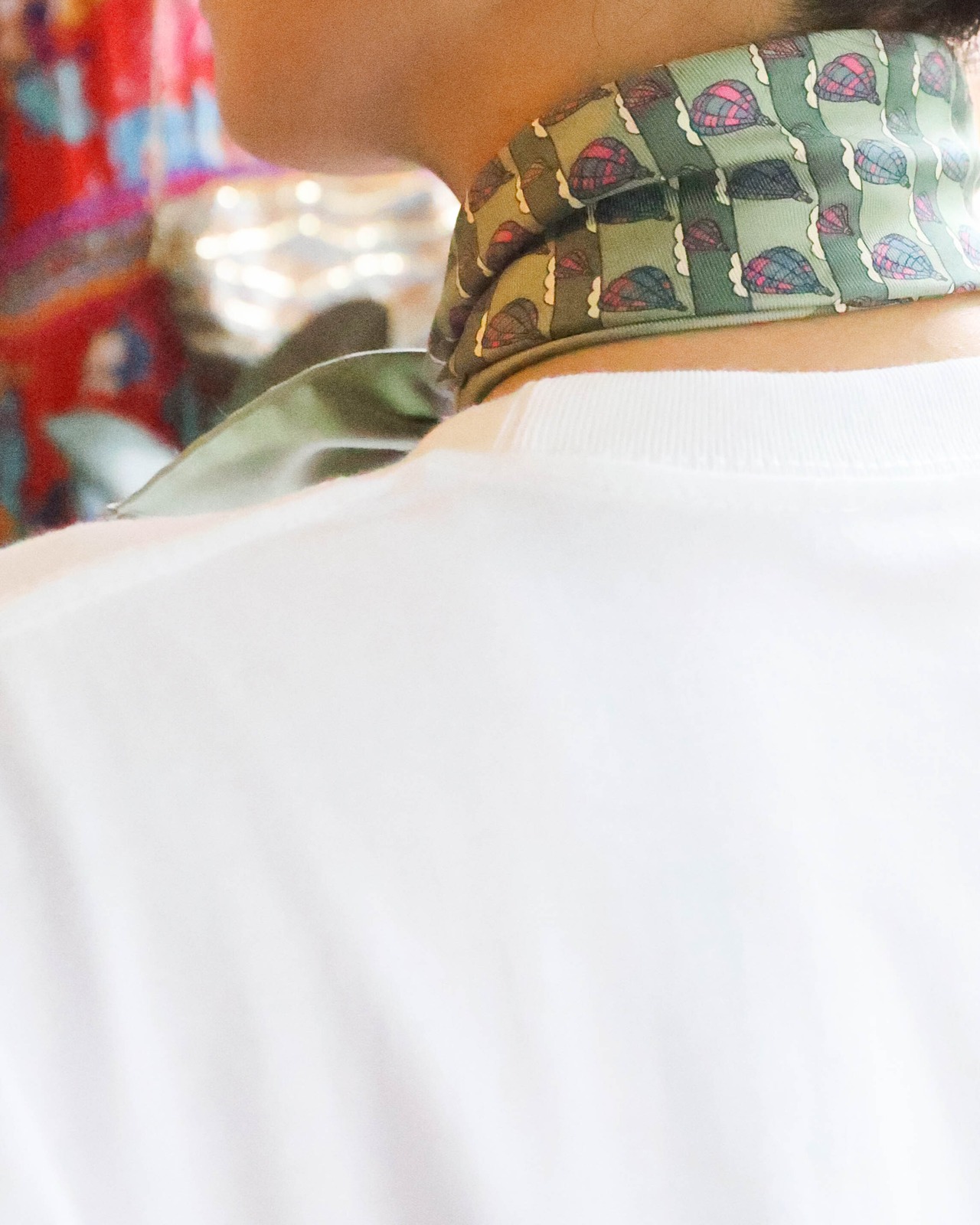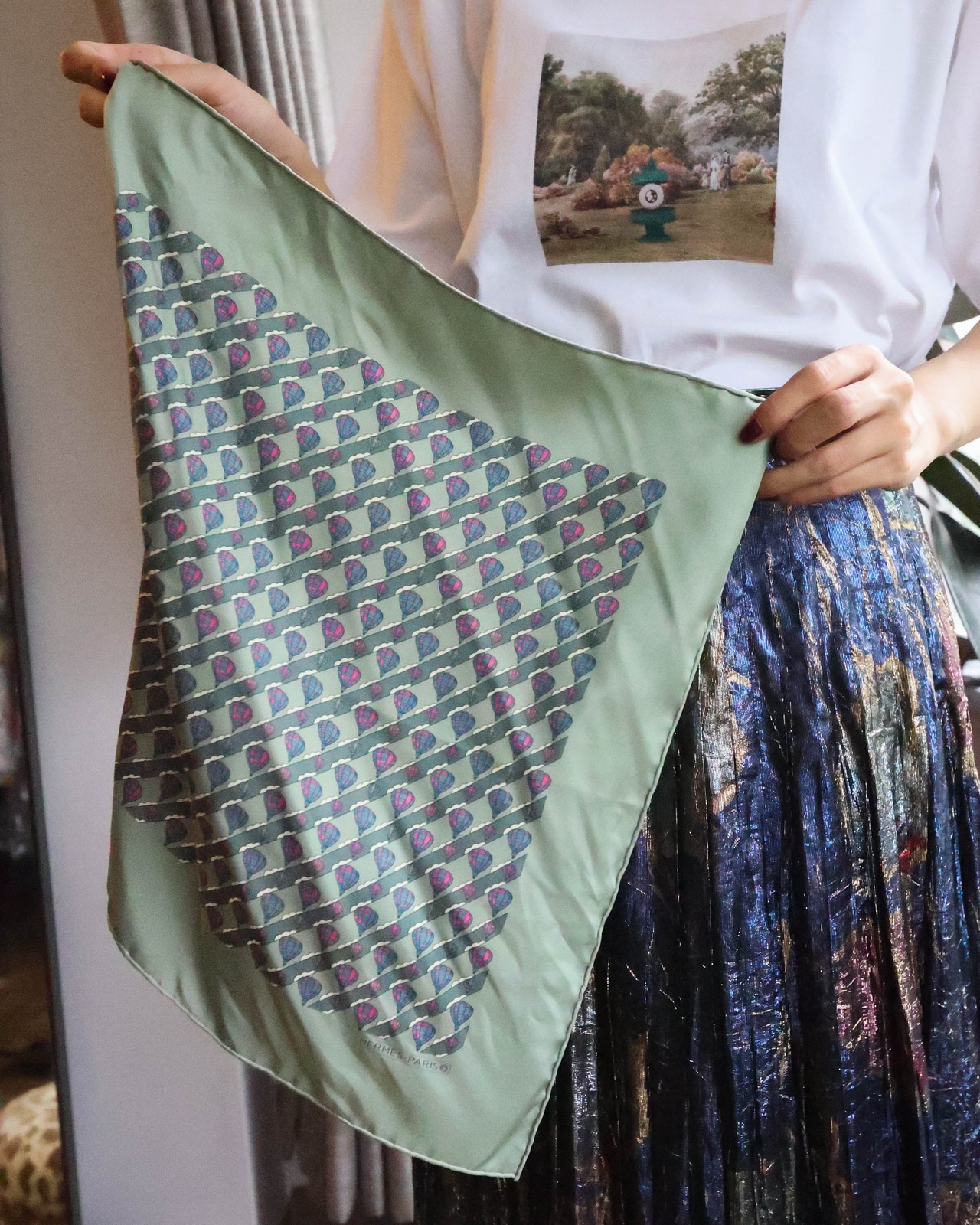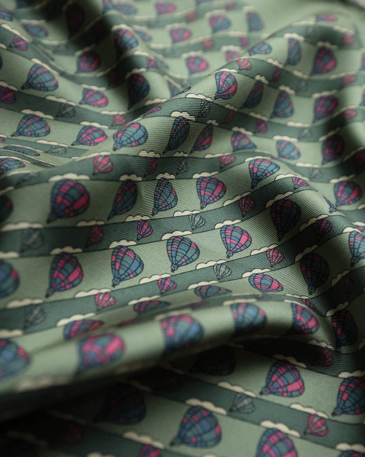 こちらはスカーフ初心者にも使いやすいミニサイズ。絶妙なグリーンの色味にユニークな気球柄はファッション性を高めながらも気品溢れる一点。