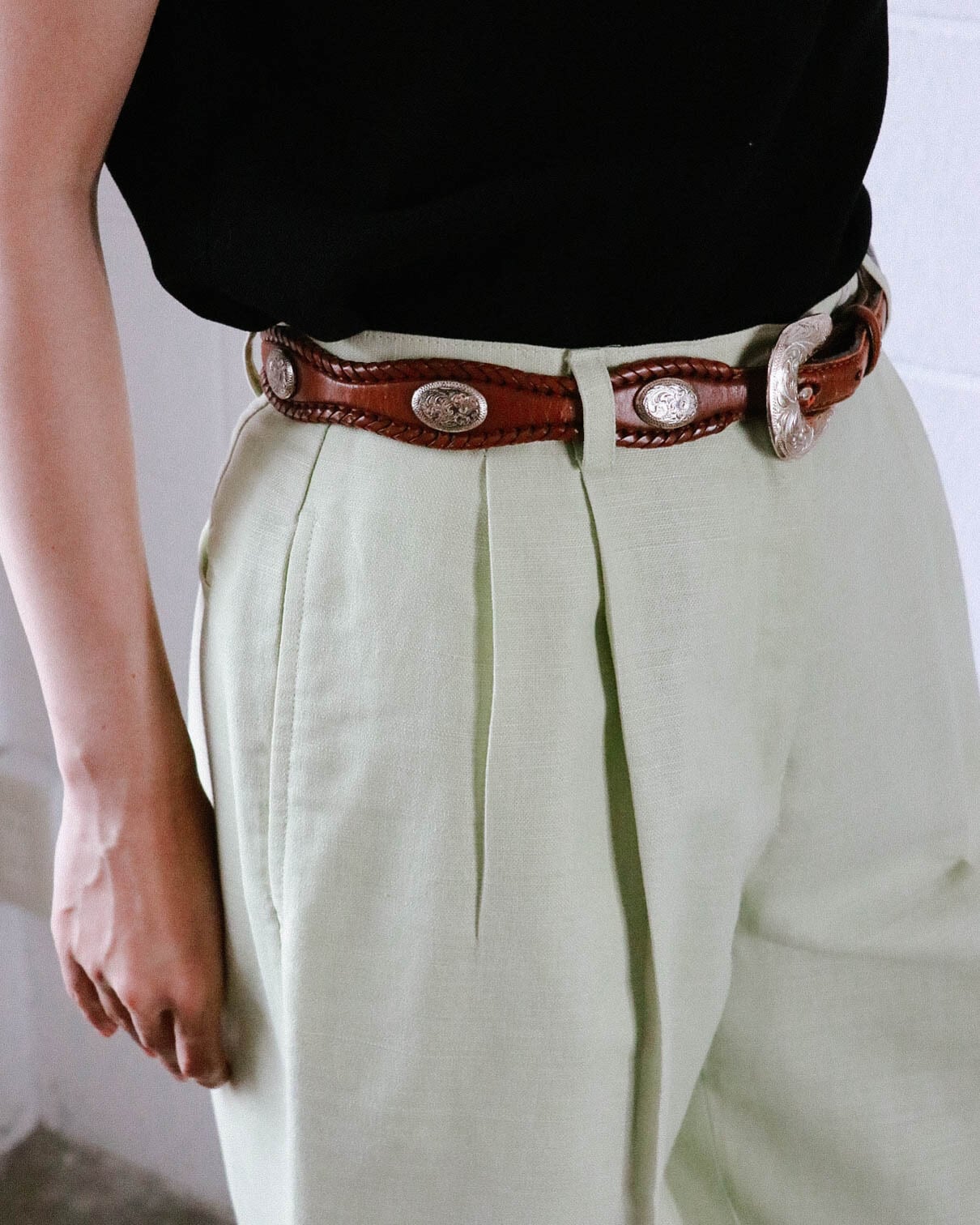 花模様が彫り込まれたオーバルコンチョがリズムよく並び、ウェーブカッティングされたデザインがかっこいい。肉厚なレザーを使いこなすクラフトワークはさすがです。