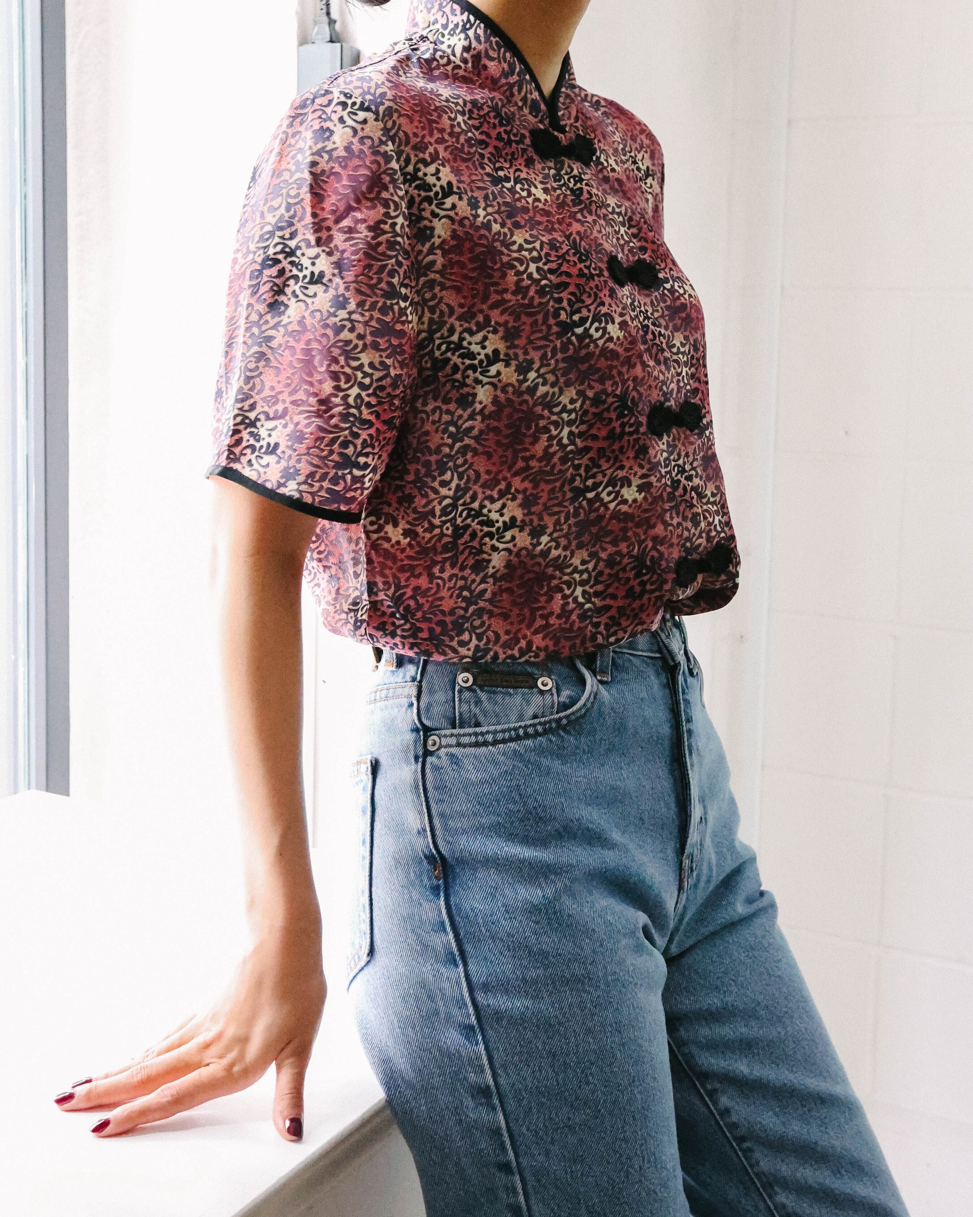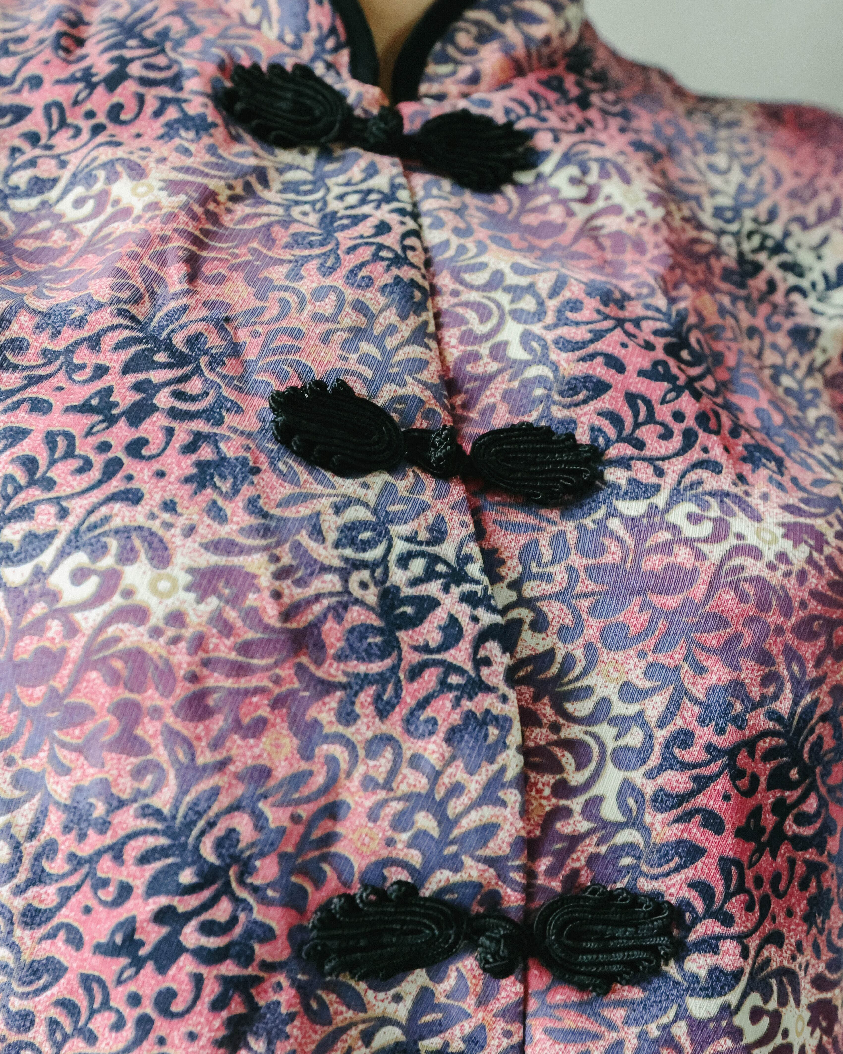 パープルピンクのオリエンタルムード漂うチャイナトップス。