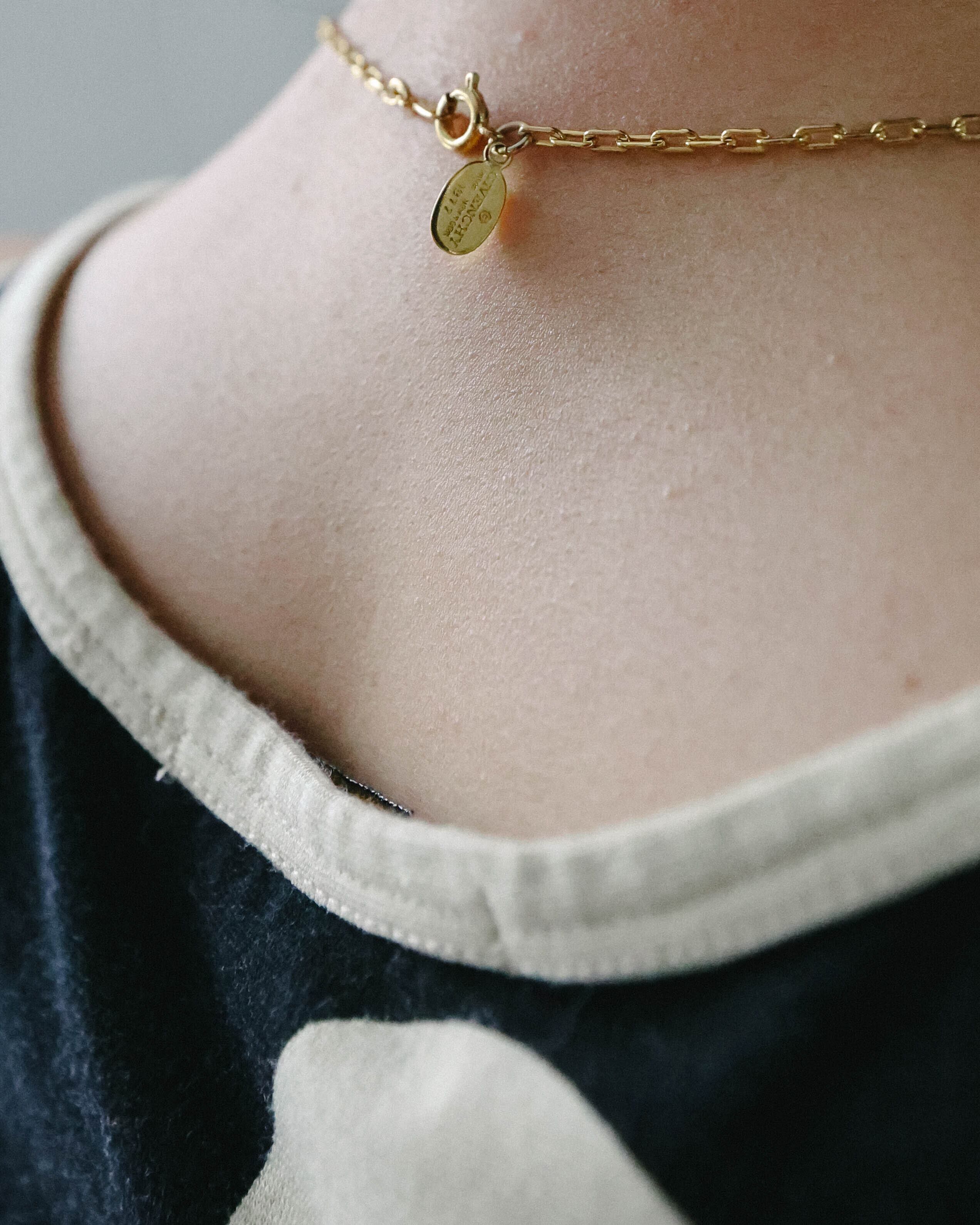 ユニークなスクエア型のチェーンと首元をさりげなく彩る