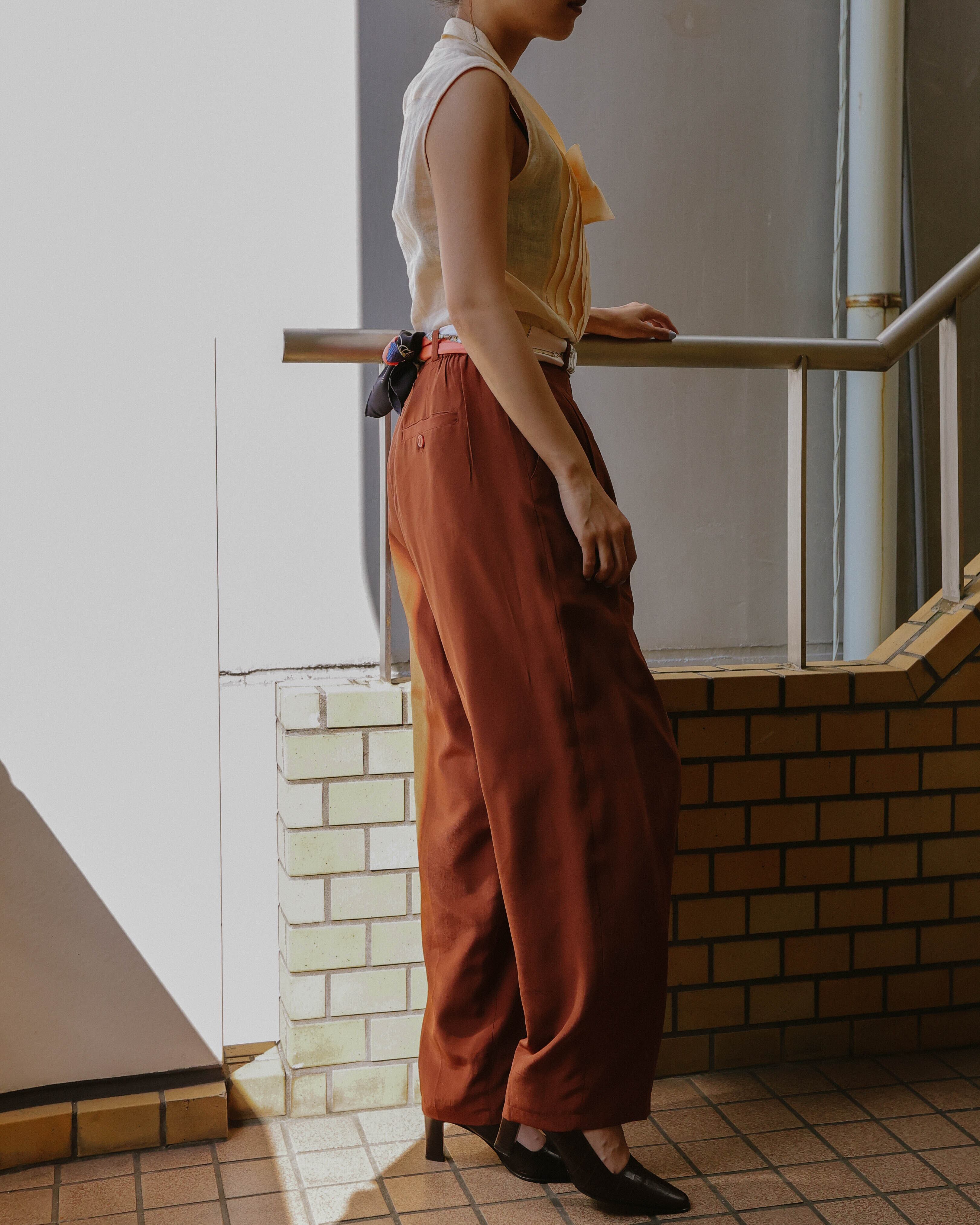 こちらは、合わせやすいブラウンカラーが嬉しいシルクパンツ。
