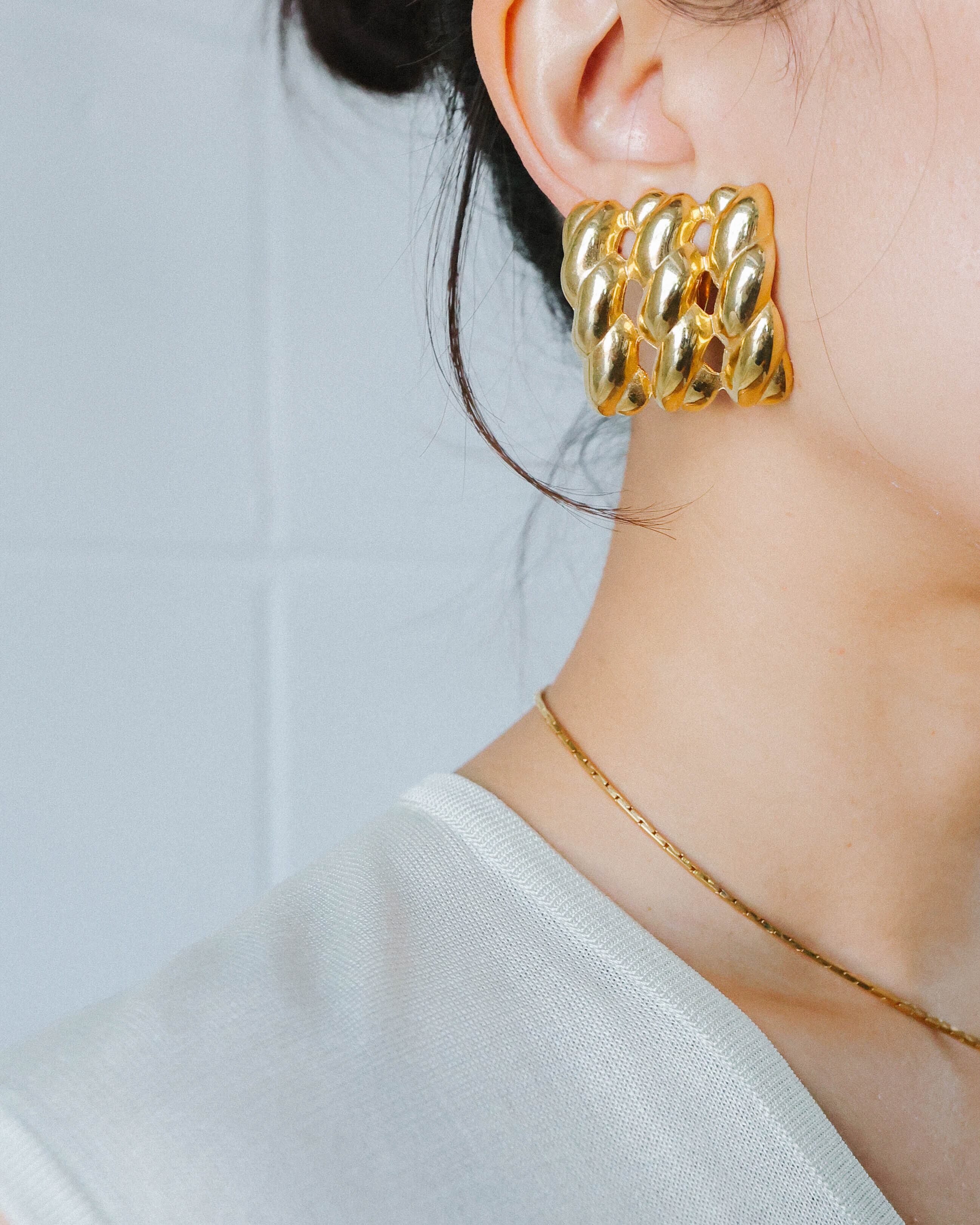 こちらは、ぷっくりとしたスクエアフォルムが立体的で美しく、耳元を上品に飾ります。