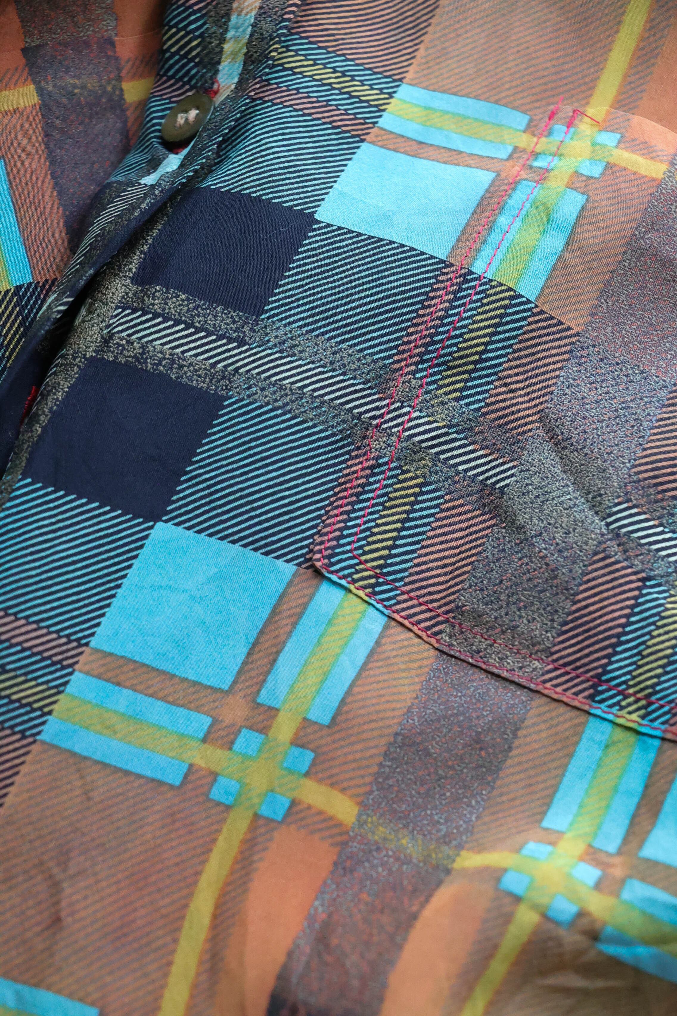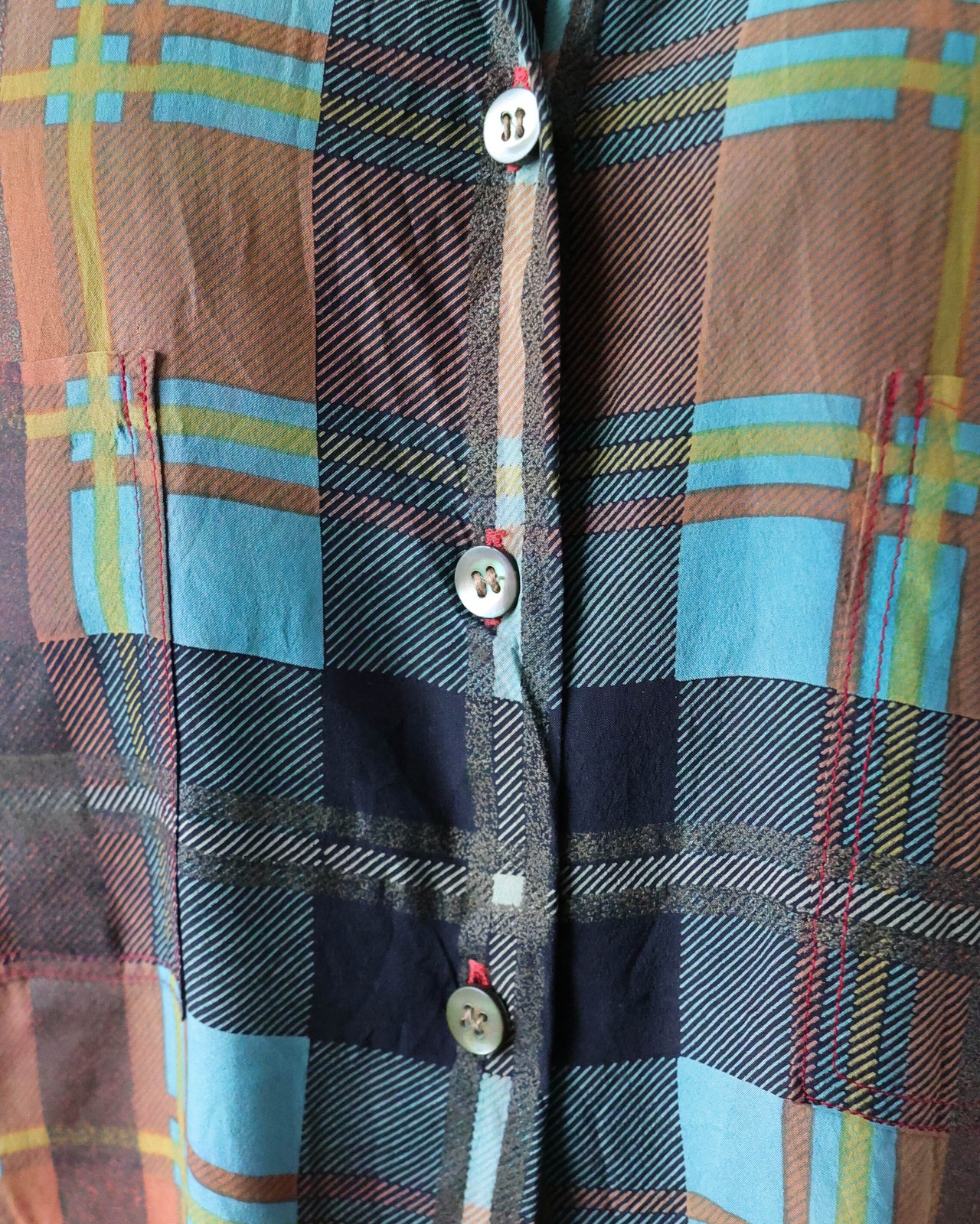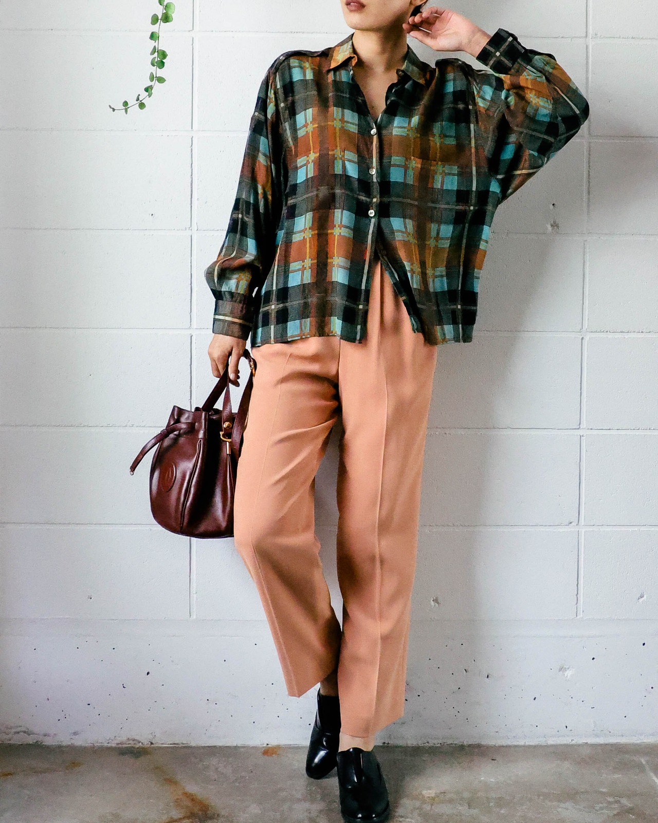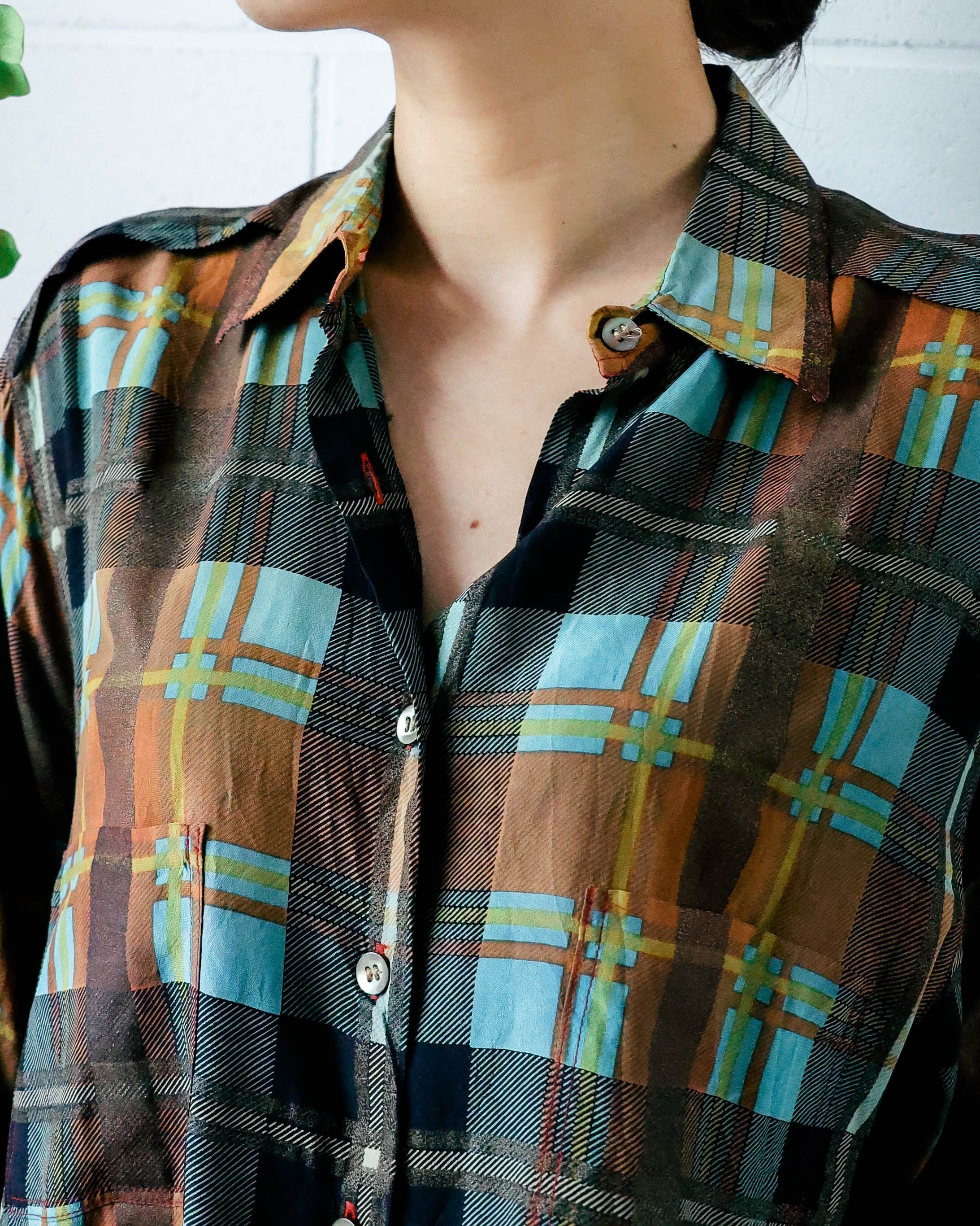 秋カラーのチェック柄に貝殻のボタンが品良く大人フェミニンを演出してくれるシルクブラウス。スカートと合わせてエレガントな印象にしたり、デニムやカラーパンツと合わせたスタイリングもブラウスの良さを引き出せておすすめです。