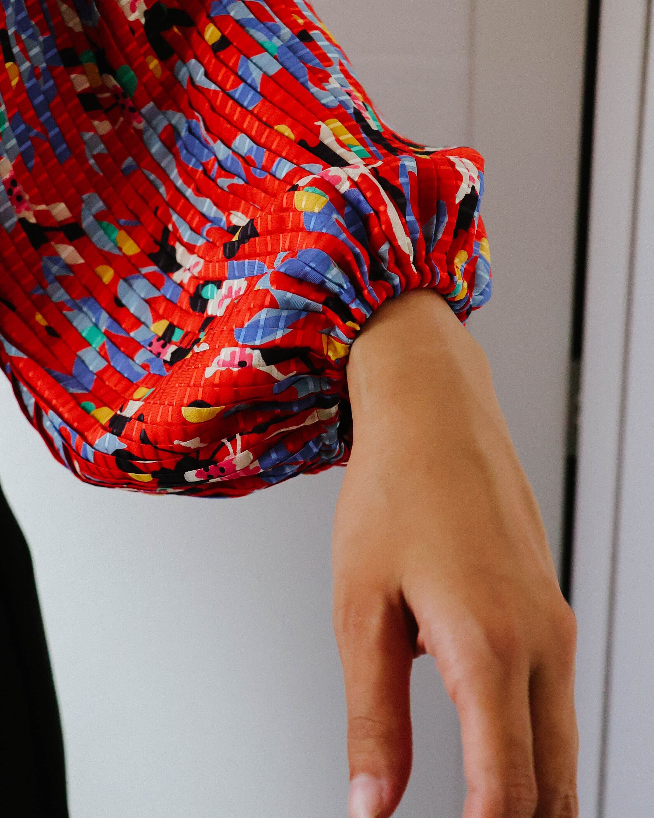 ふわっとしたプリーツドアームのシルエットが女性的で優雅な印象。