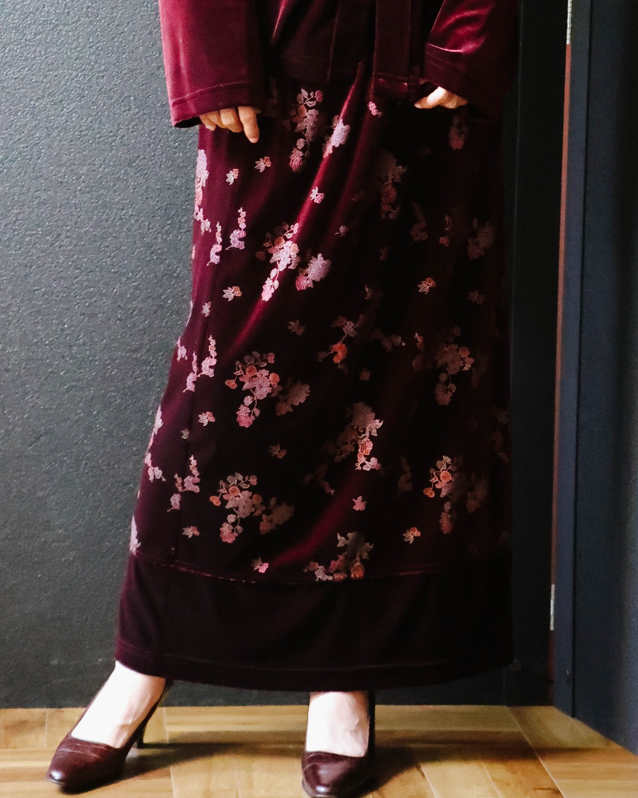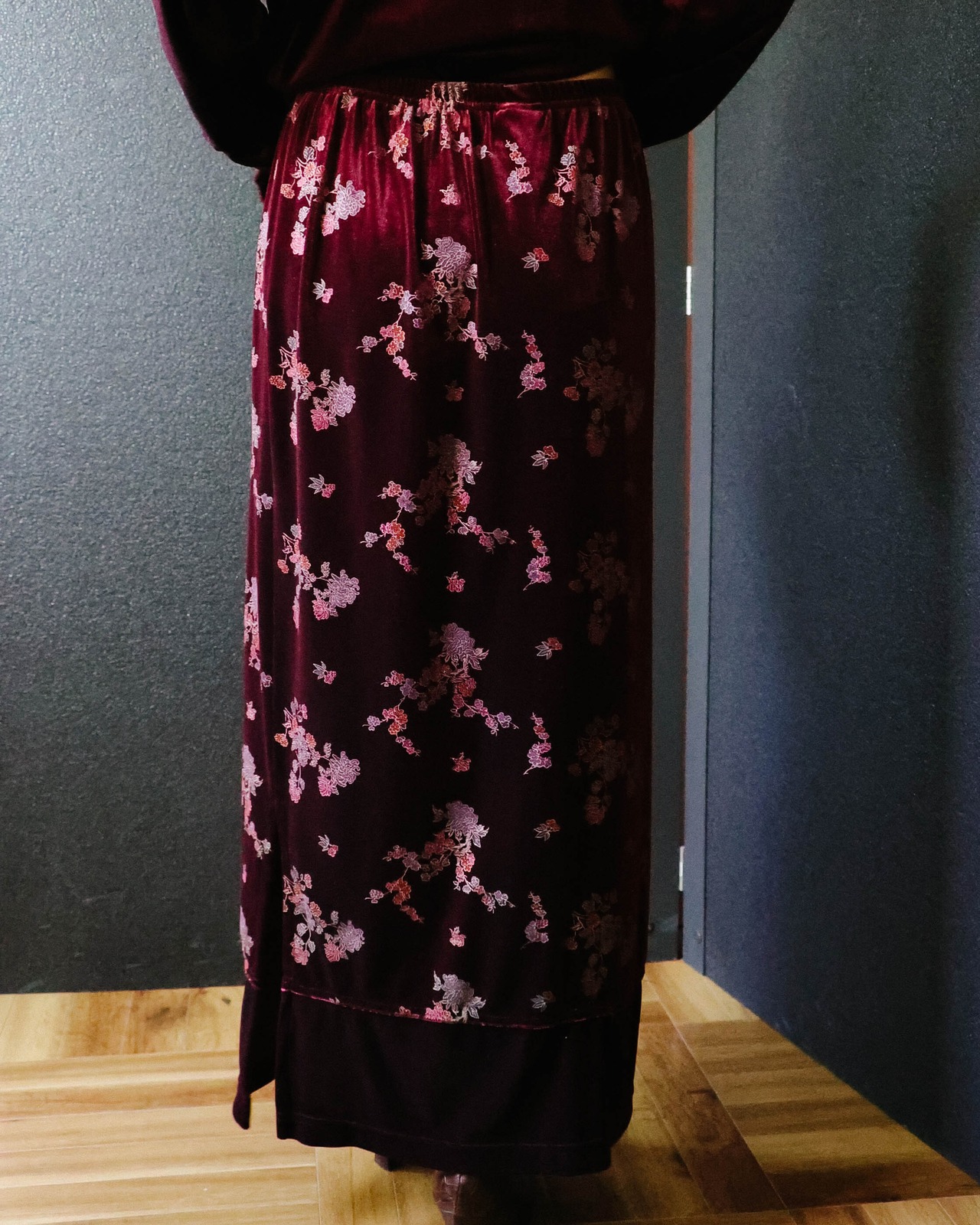 深みのあるワインのようなボルドーカラーのロングスカート。
