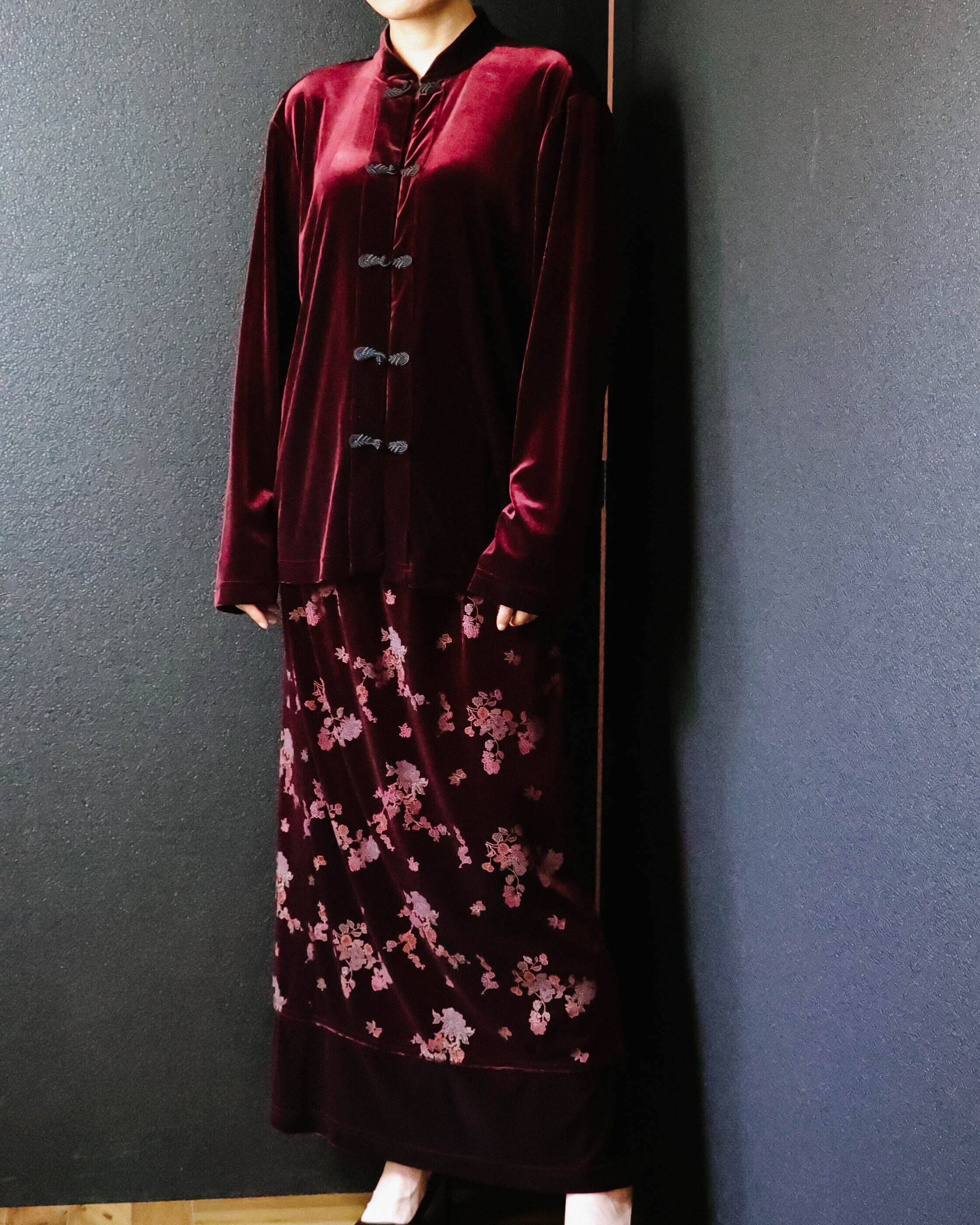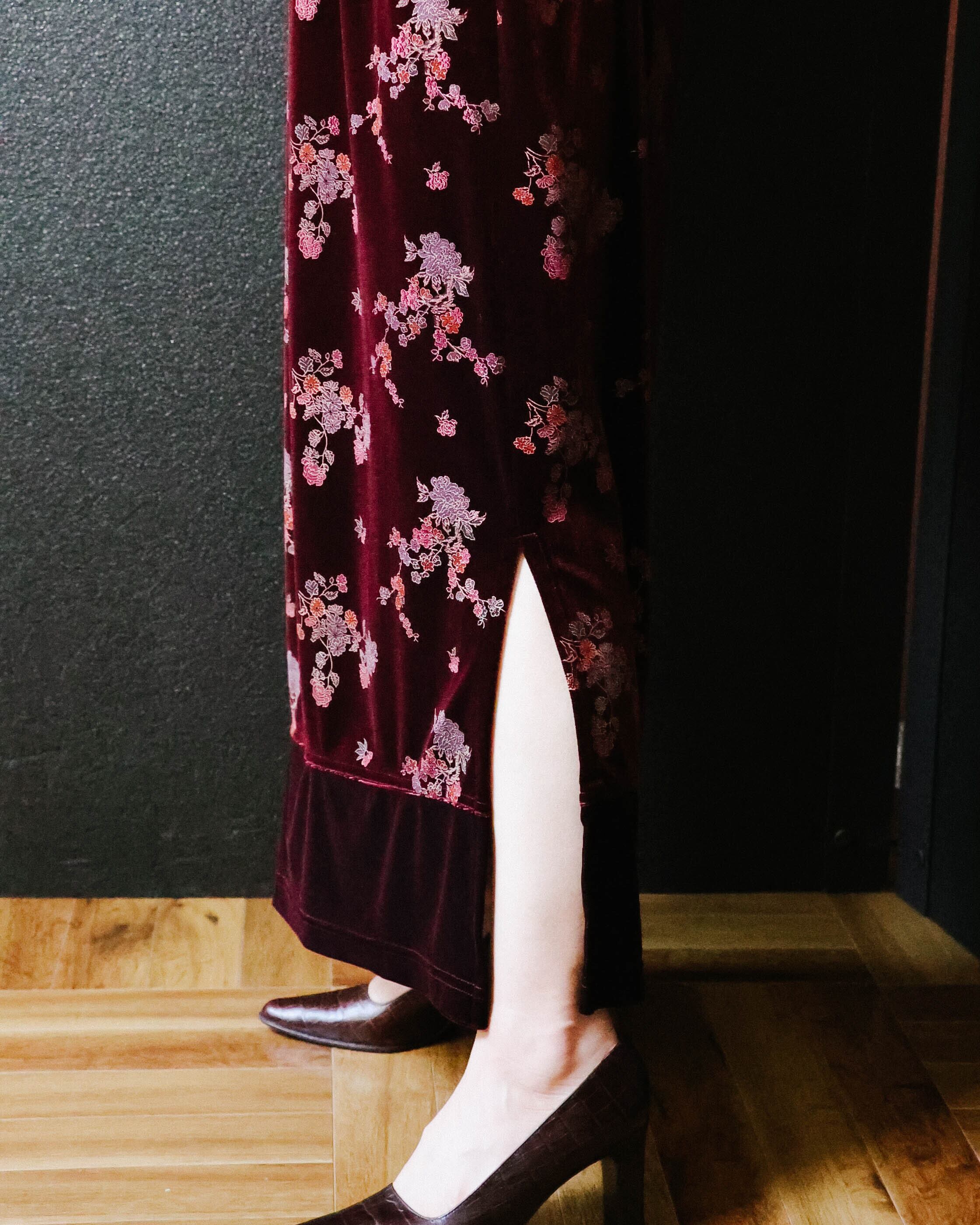 梅のようなオリエンタルな花柄が優美。スリット入りで大人の色香をプラス。
