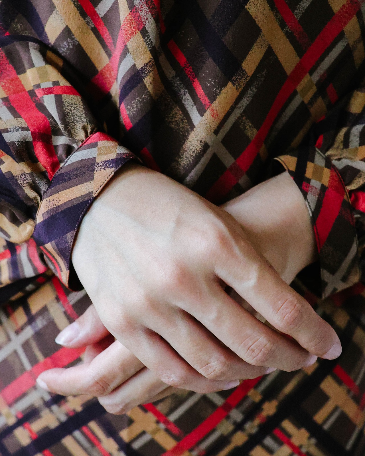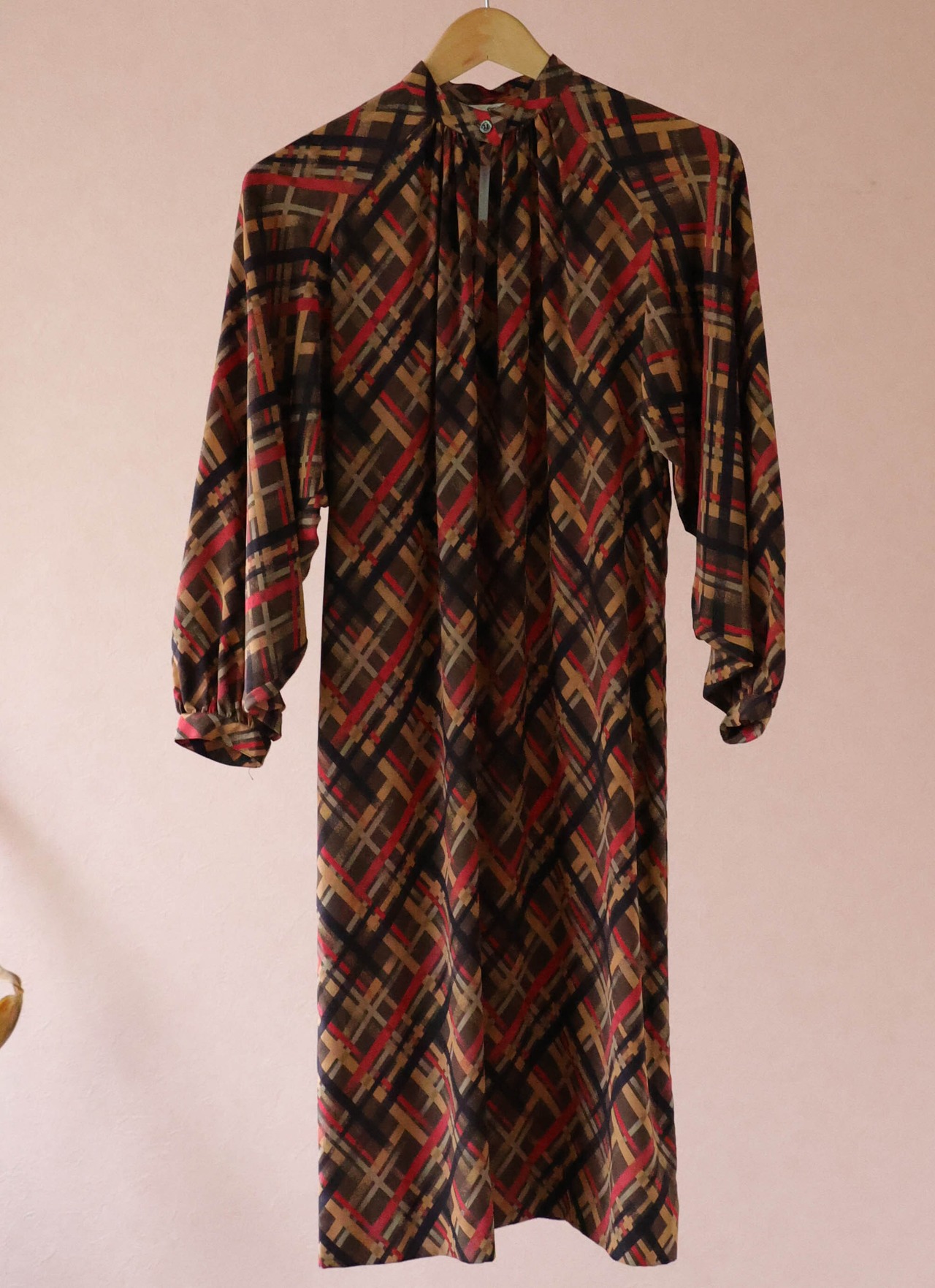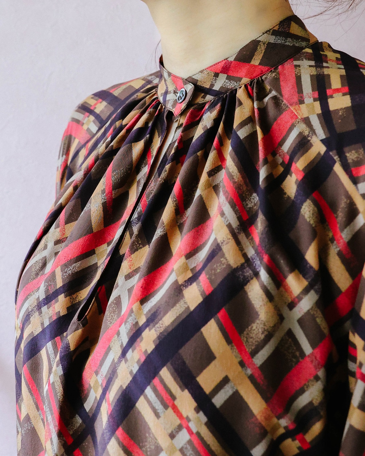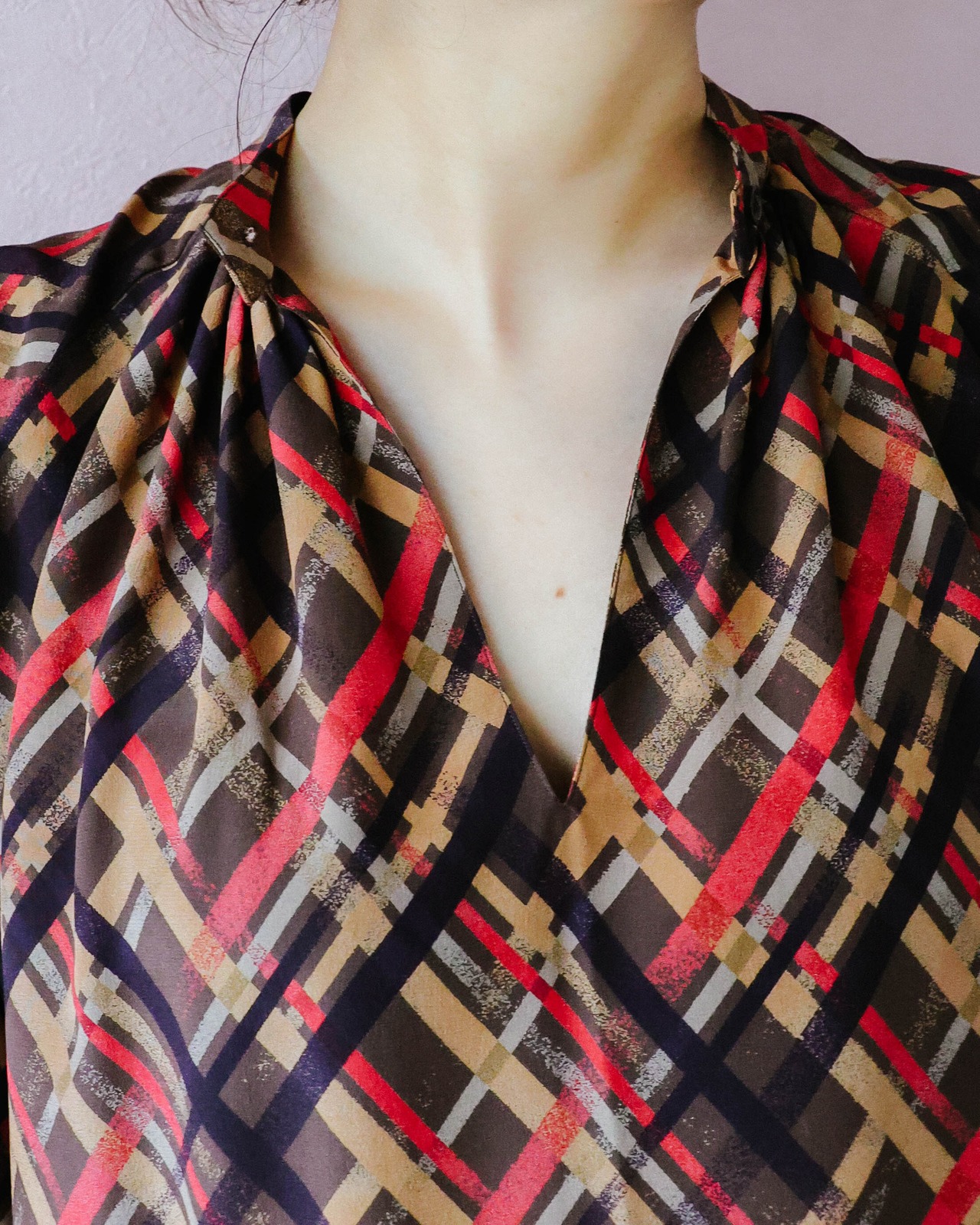 オータムカラーのチェック柄、サラッとした生地に細やかなディテール、女性らしさ溢れるギャザー使いや肩の切り替えがないので肩幅に左右されず、生地をたっぷりと使用したボリュームのあるアームシルエットが可愛い。一枚でもレイヤードでも着回しやすい丈です。
