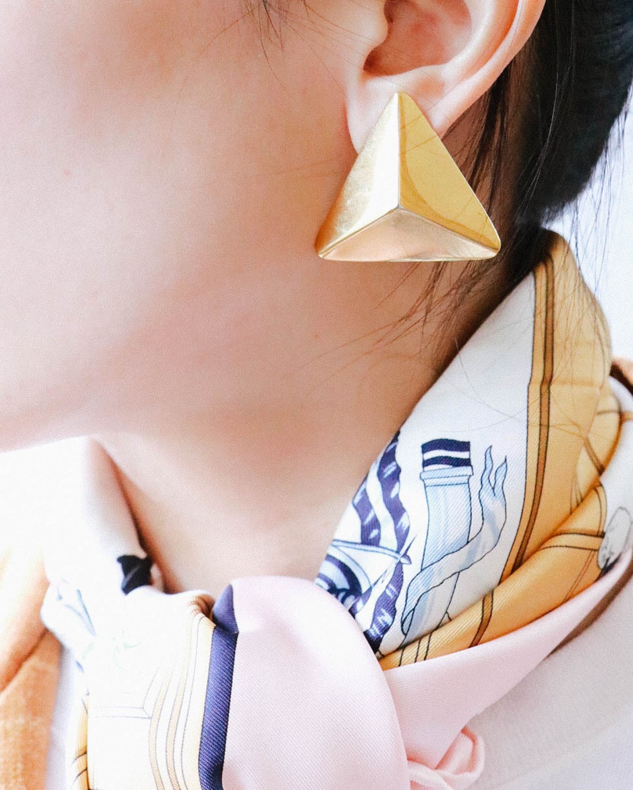 ゴールドイヤリングのトライアングルモチーフが存在感を放つこちらのイヤリングはジバンシーのもの。形・カラーが大人のヴィンテージスタイルにとてもマッチする一品。コーディネートのアクセントではなくイヤリングを主役で考えるのも楽しい。立体的なシルエットと大ぶりなサイズ感で小顔効果も抜群です。