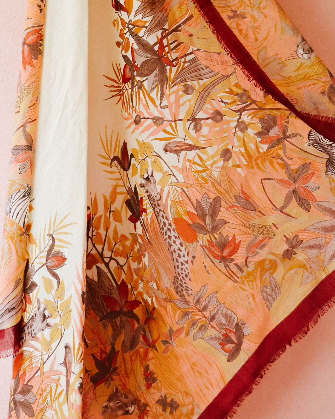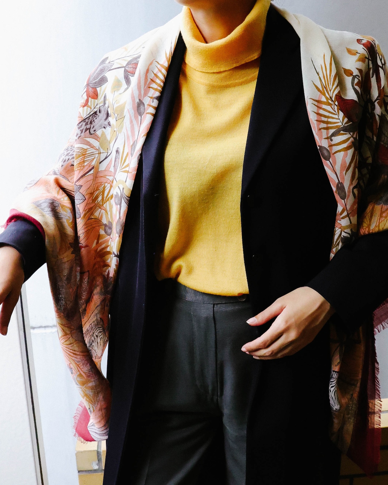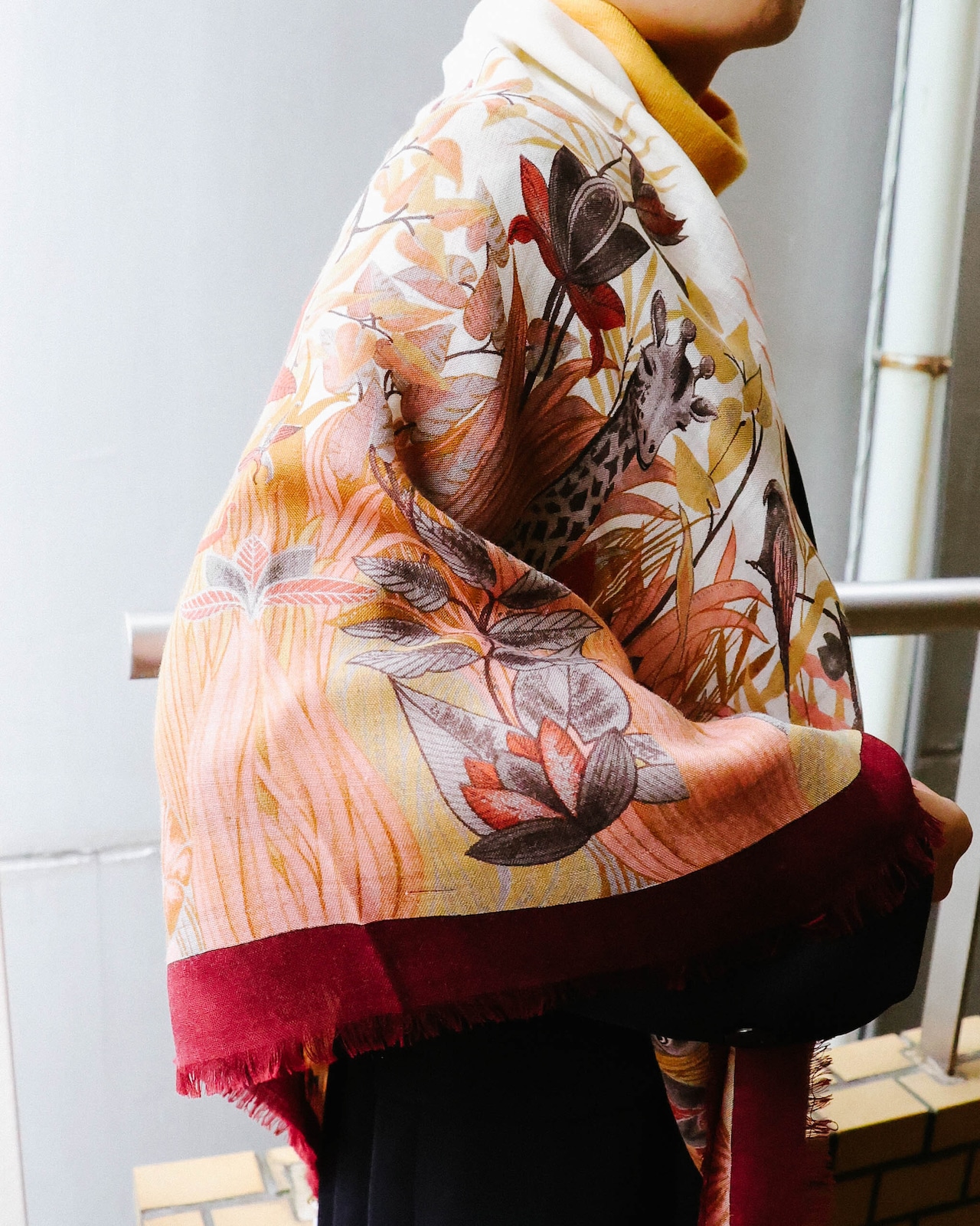 シルク混の柔らかな生地に加えて大判サイズなので、首に巻いたり肩に羽織ったりと、幅広いアレンジを楽しめます。