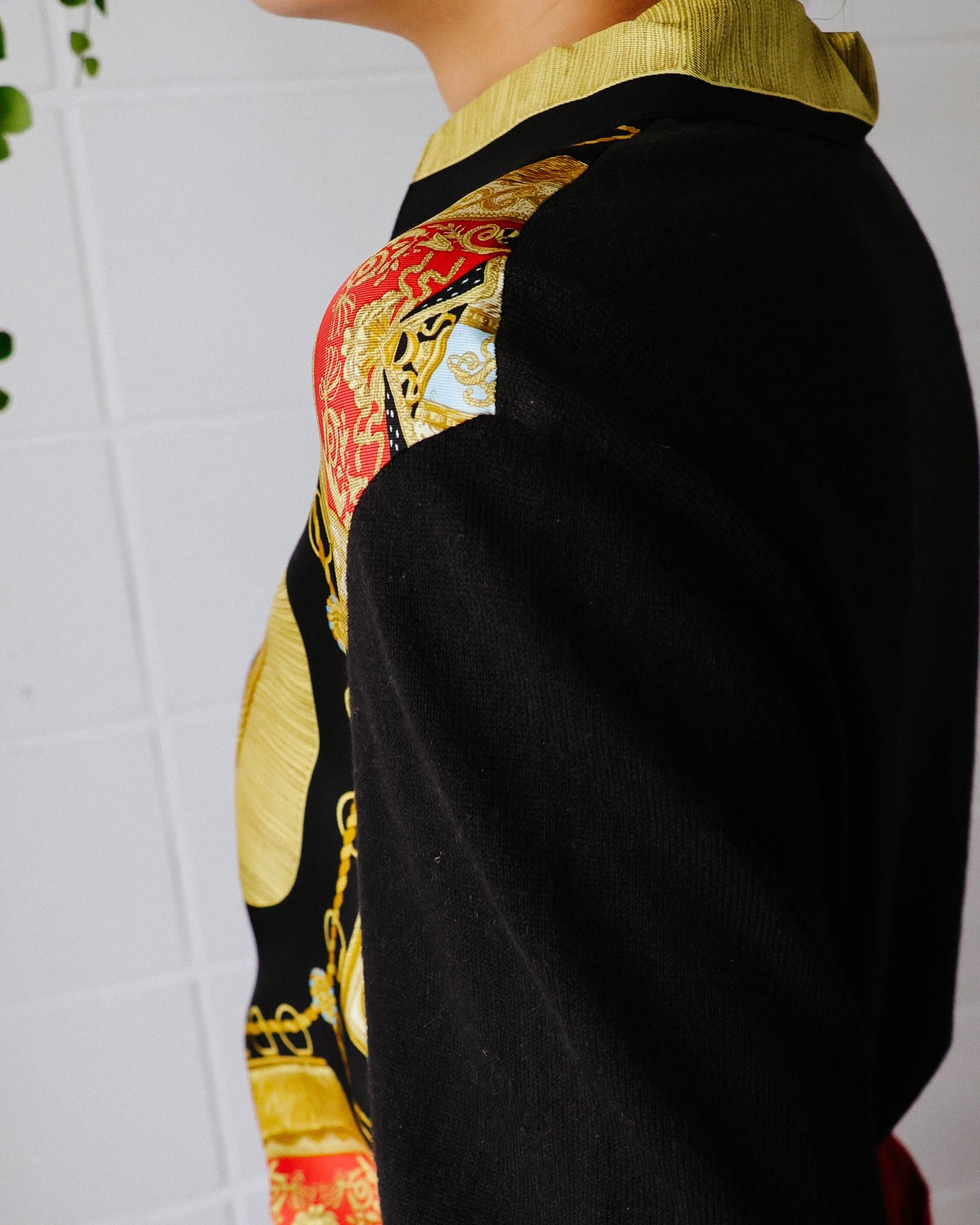 メゾンブランド、エルメスのヴィンテージ。シルク、コットン、カシミア の上質な素材の組み合わせがとっても気持ちいい肌触りで、クローゼット にあると思わず着たくなります。ブラックベースなのでボトムズとも合わせやすくオールシーズン愛用できます。