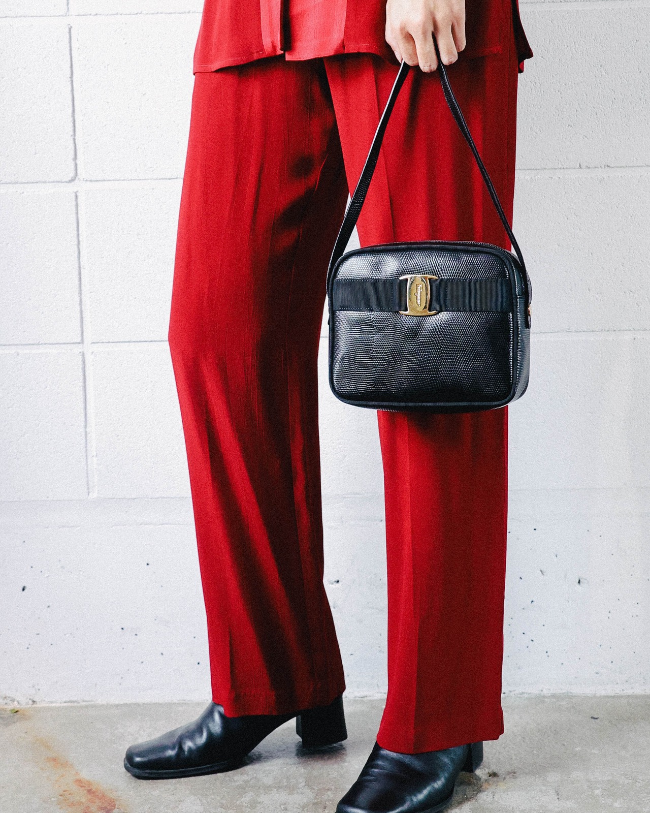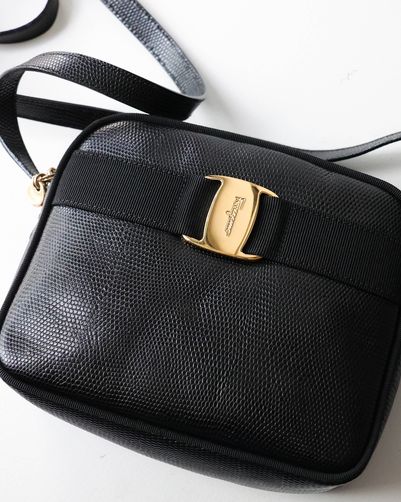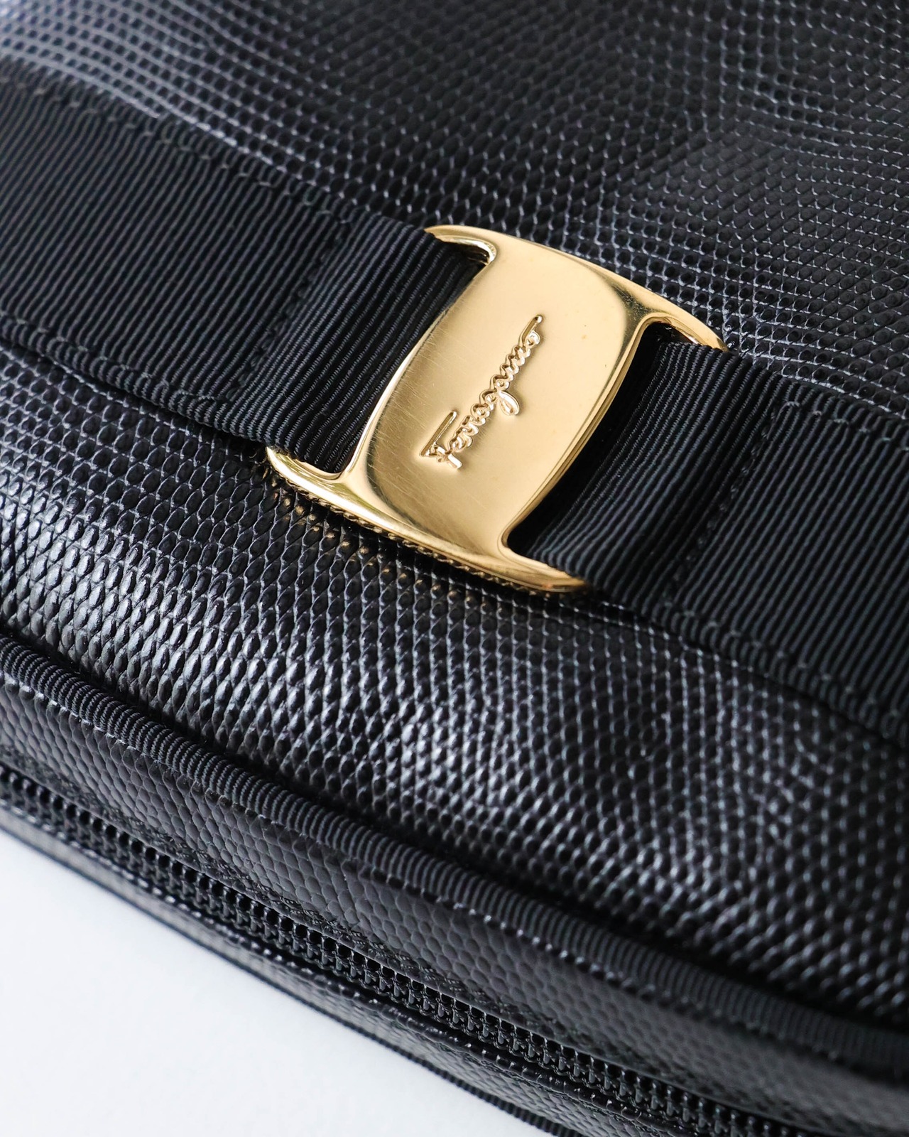不動の人気フェラガモのアイコン「ヴァラ」シリーズのブラックショルダーバッグが入荷。