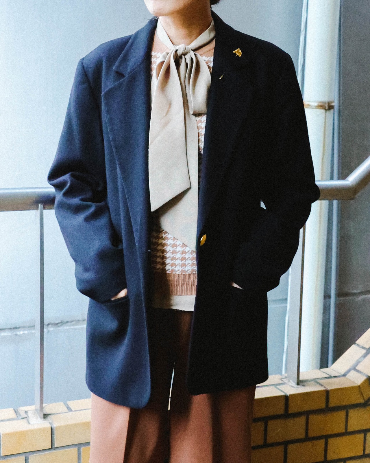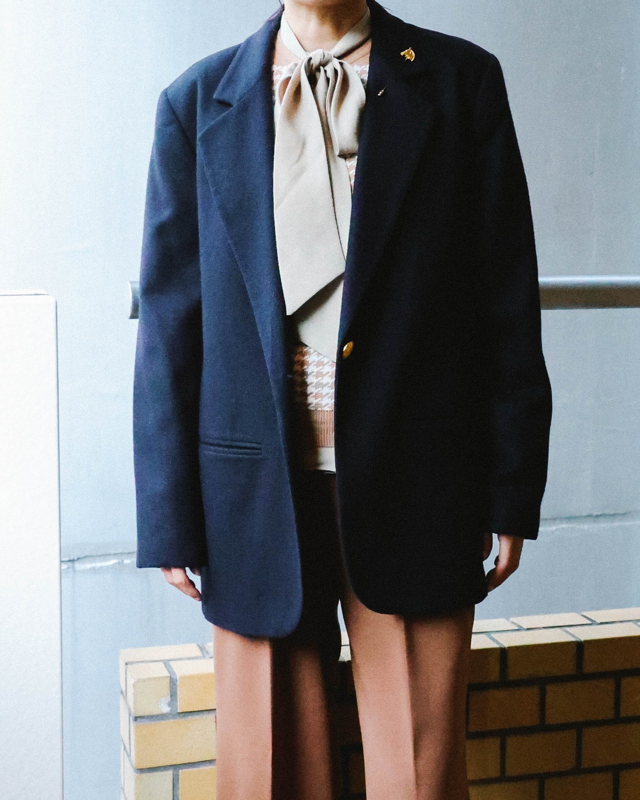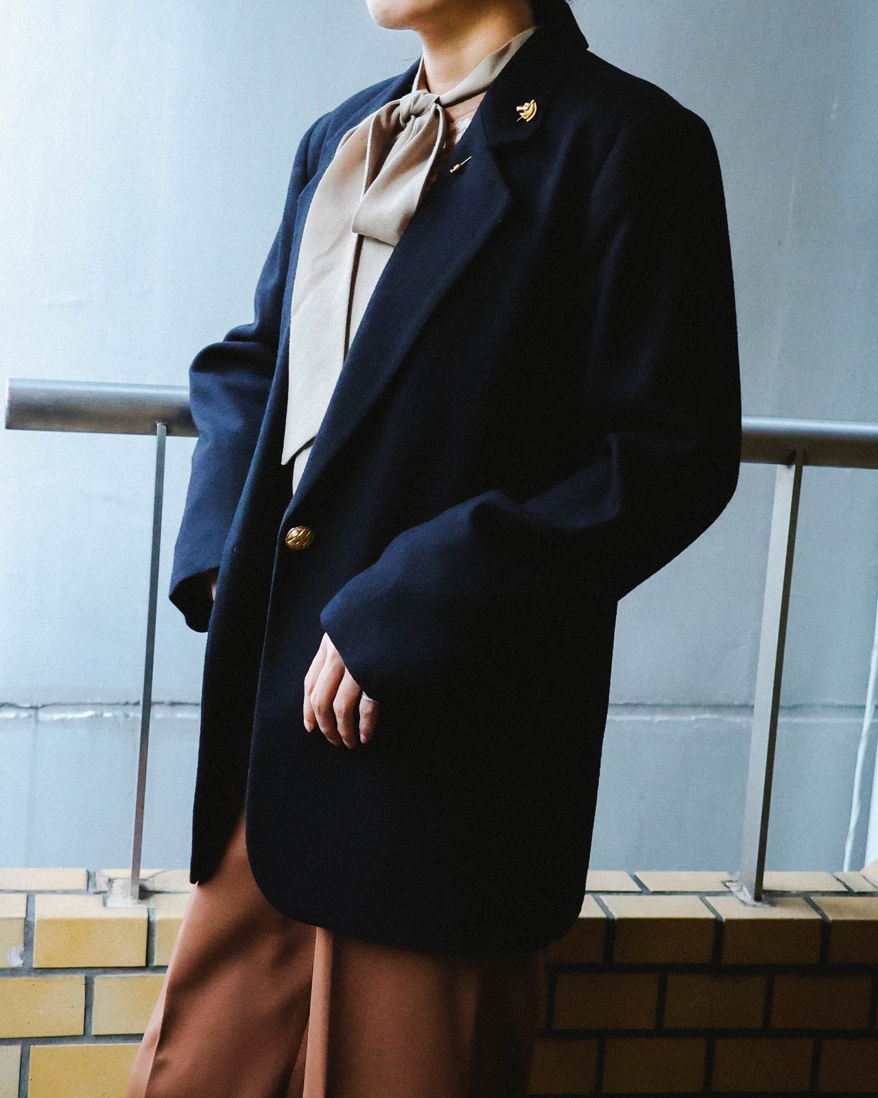 ゴールドのシングルボタンウールジャケット。